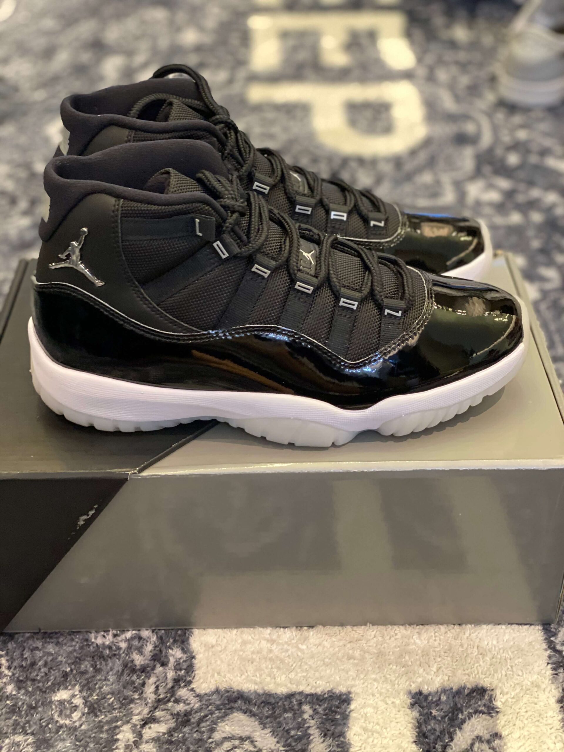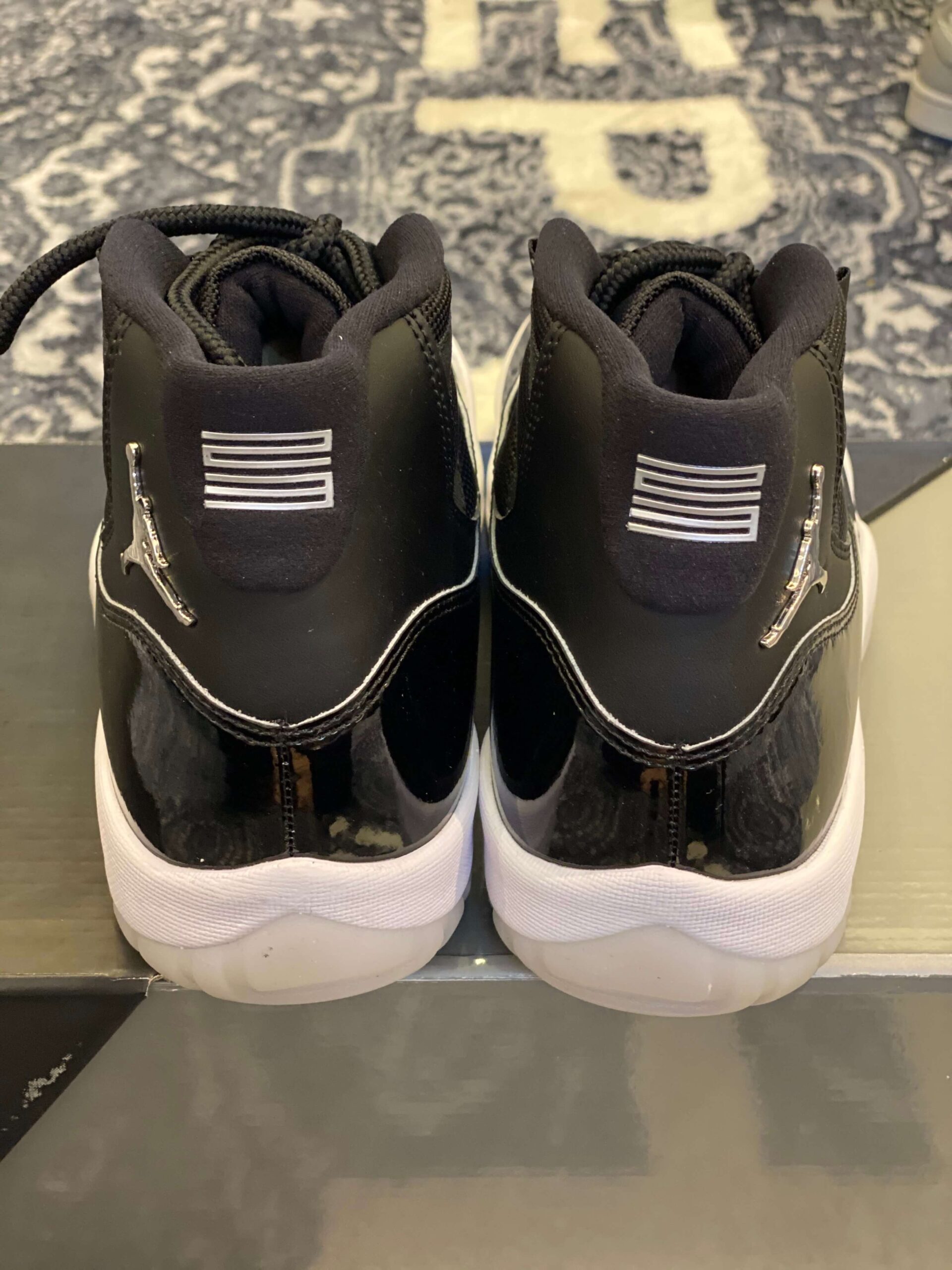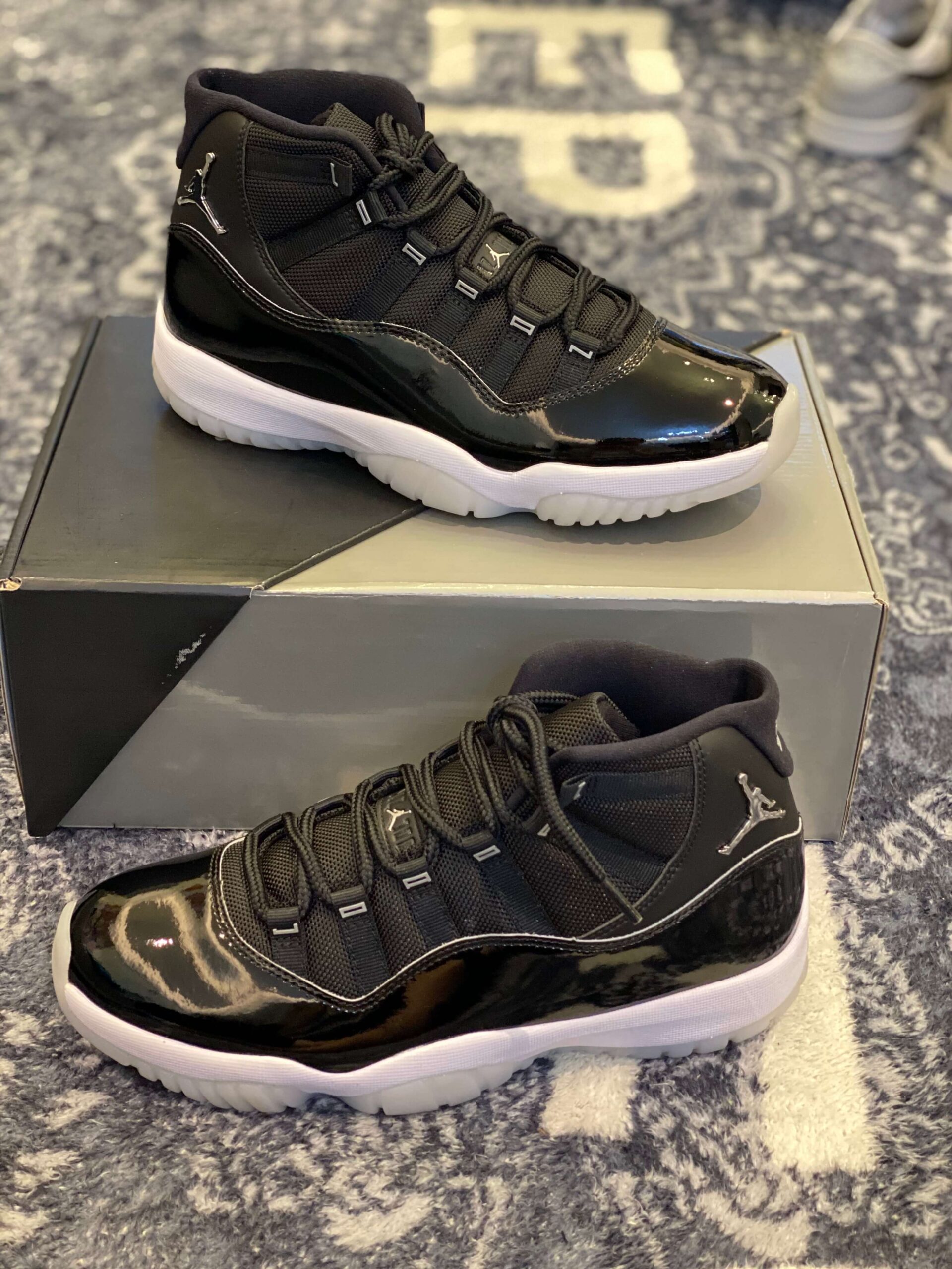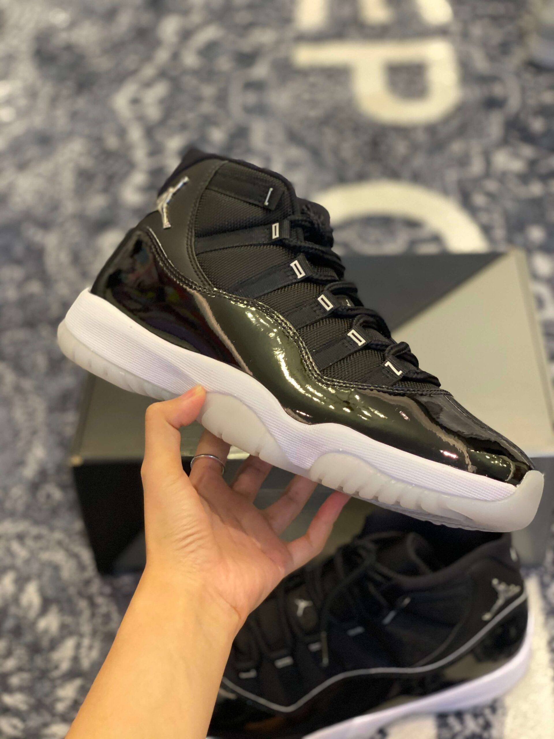 Air Jordan 11 “25th Anniversary” Black White Metallic Silver commemorates a quarter-century of the legendary Air Jordan 11 silhouette, a shoe that forever changed the landscape of basketball footwear with its introduction of patent leather into high-performance design. This iteration utilizes a premium black upper, composed of the signature glossy patent leather that wraps around the entire base of the shoe, transitioning to a durable black ballistic mesh on the upper quarter and tongue. What truly sets this “25th Anniversary” model apart is the elegant shift in branding; instead of the customary red, the Jumpman logos on the heel and the accents on the eyelets are rendered in a striking metallic silver finish, providing a modern, luxurious, and monochromatic feel. The sneaker retains the essential features that make the AJ11 a timeless masterpiece, including the full-length Air unit for responsive cushioning and the carbon fiber shank plate for excellent stability and support. A crisp, clean white foam midsole provides a sharp contrast to the dark upper, leading down to a semi-translucent, slightly gray-tinted icy outsole for a pristine finish. This sneaker is perfect for both casual wear and formal occasions, bridging the gap between performance heritage and high-fashion aesthetics. The sophisticated blend of black, white, and silver ensures this shoe is a versatile and essential addition to any sneaker rotation. Please note: These products are not original brand-name products but are inspired by the design and aesthetic of the original Air Jordan 11 “25th Anniversary” model.