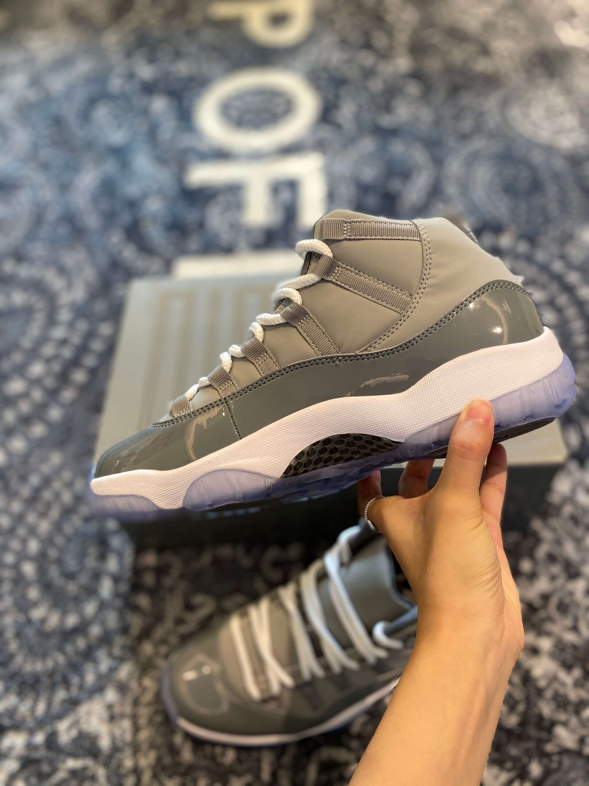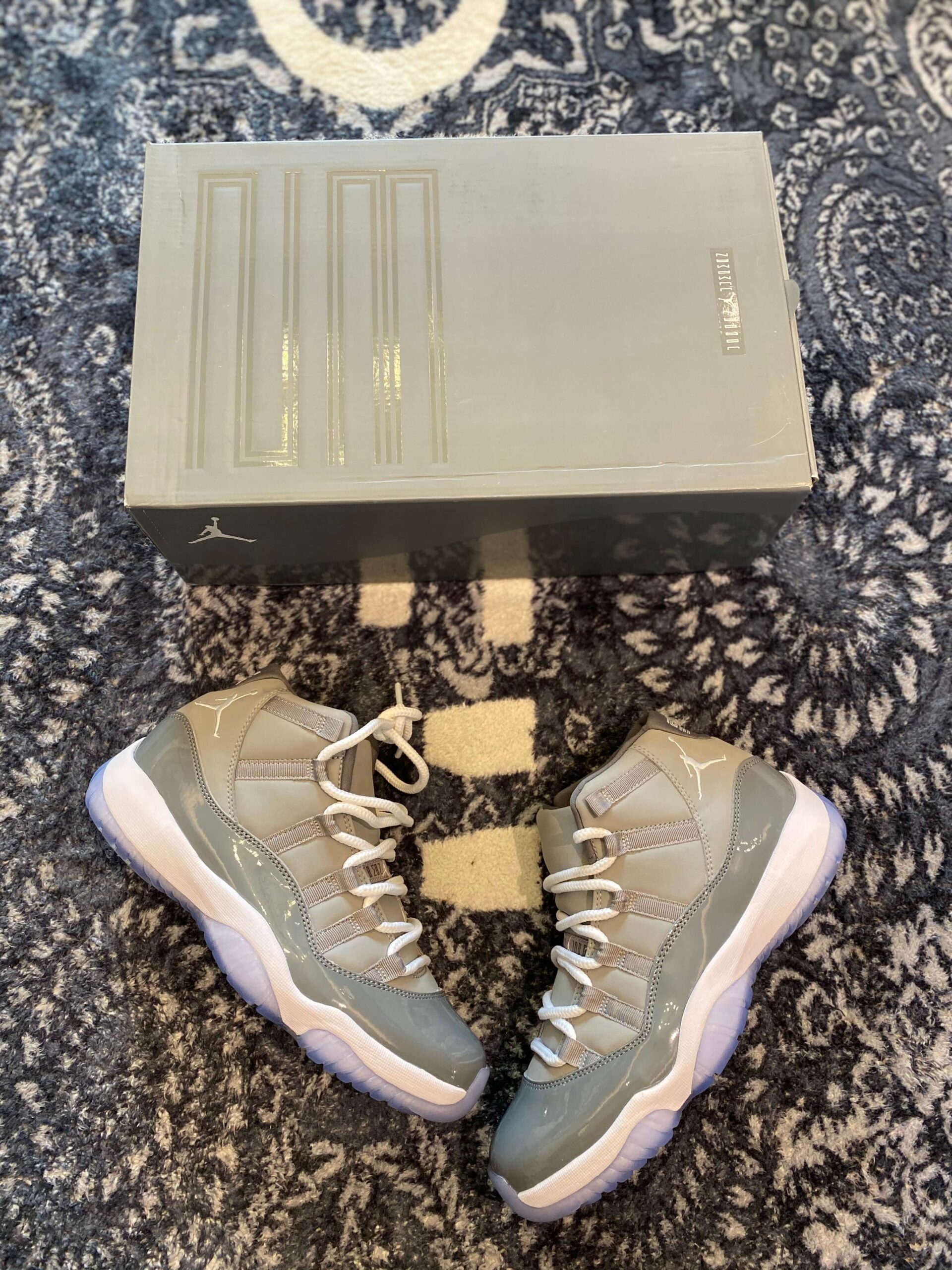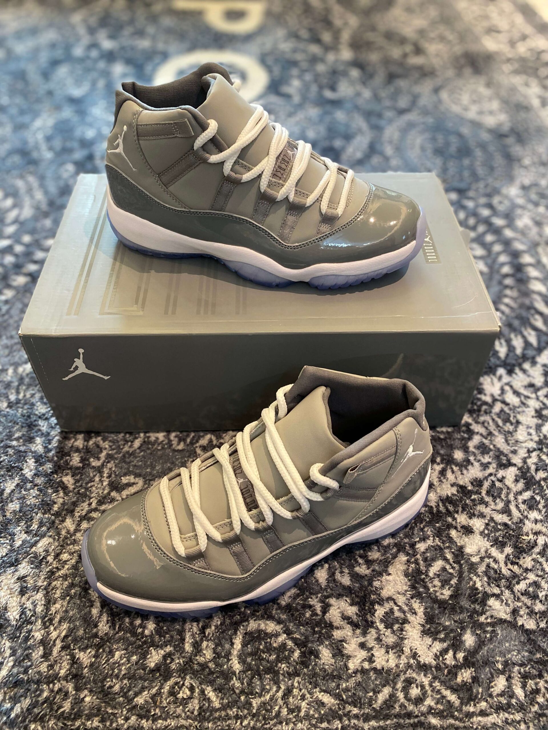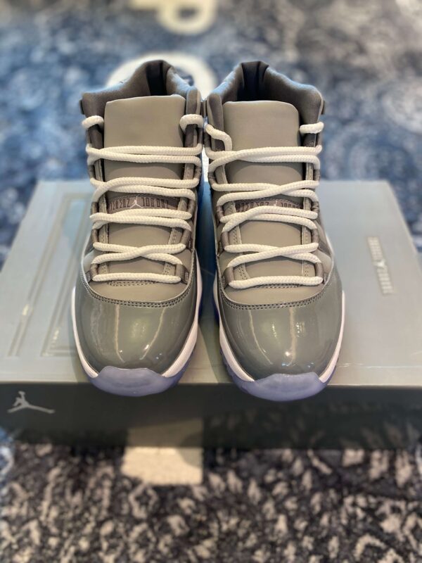 ir Jordan 11 Retro Cool Grey is one of the most iconic colorways in the history of the Jordan Brand, first introduced in 2001 and celebrated for its sophisticated, neutral palette. This specific iteration features a beautiful mix of Medium Grey and Cool Grey tones, utilizing a premium durabuck upper that provides a soft, matte texture. The standout feature is the signature patent leather mudguard, which adds a high-gloss finish that defines the silhouette’s luxurious aesthetic. The design is rounded out by crisp white laces, a white midsole, and the fan-favorite icy blue translucent outsole that adds a modern touch to the vintage design.
