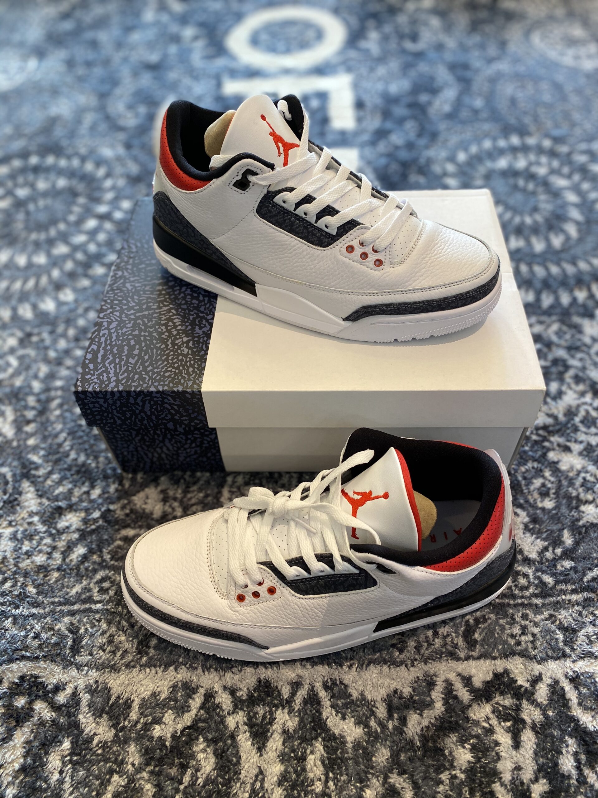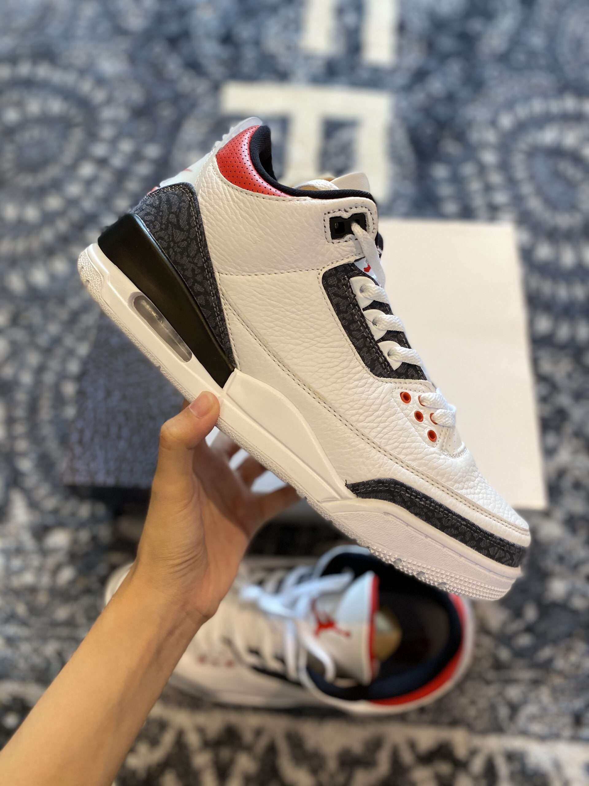 Air Jordan 3 Retro SE Denim “Fire Red” White/Black/Fire Red is a bold reimagining of Tinker Hatfield’s classic 1988 design, famously known for being the first Jordan to feature elephant print and visible Air cushioning. This Special Edition (SE) release replaces the traditional suede or nubuck elephant print with a unique raw denim material that features the iconic pattern printed directly onto the fabric. The upper is constructed from premium white tumbled leather, providing a clean and classic backdrop for the textured denim overlays at the toe and heel. Striking “Fire Red” accents appear on the eyelets, perforated collar, and the inner lining of the tongue, staying true to the Chicago-inspired color palette that fans have loved for decades.