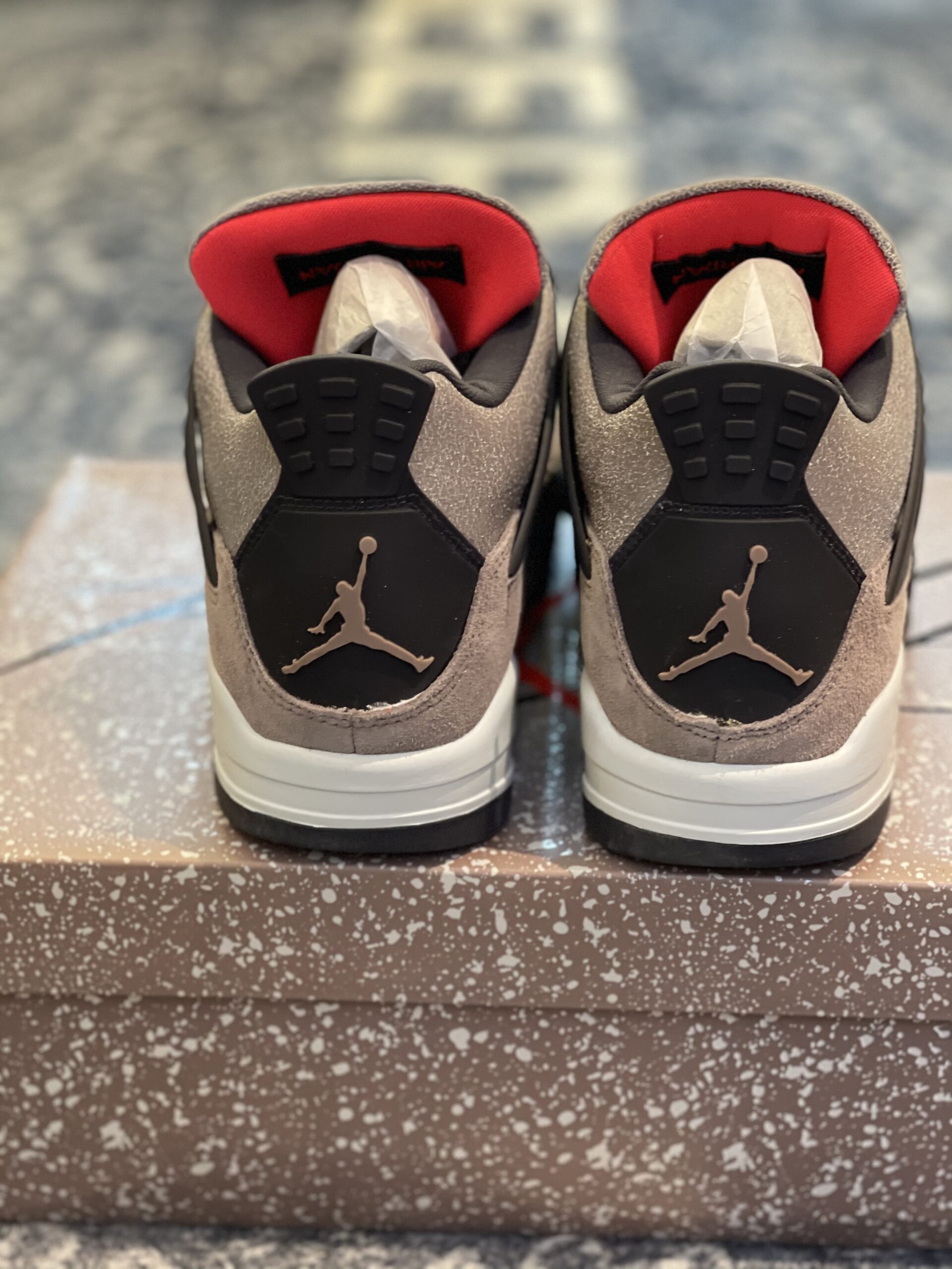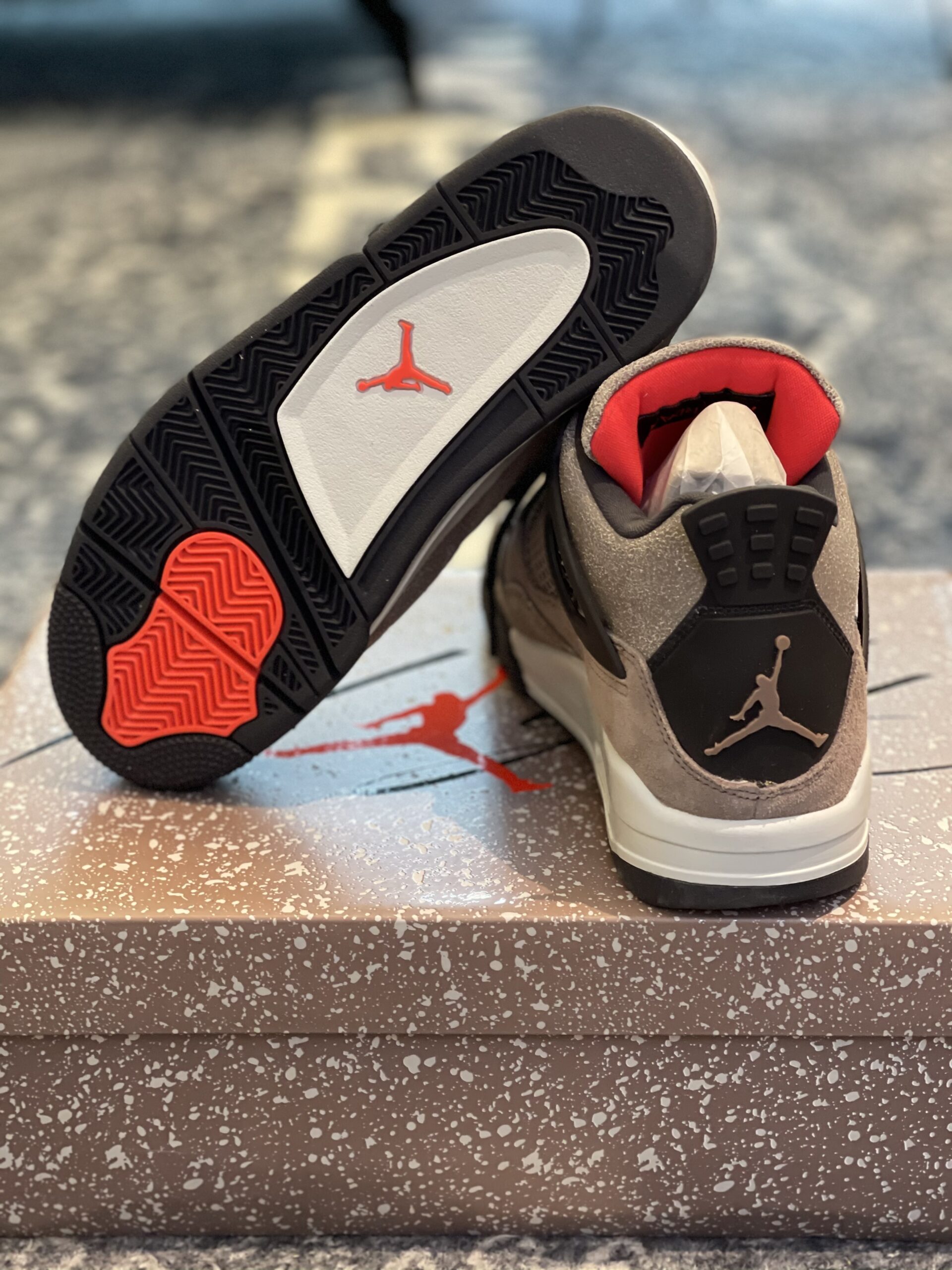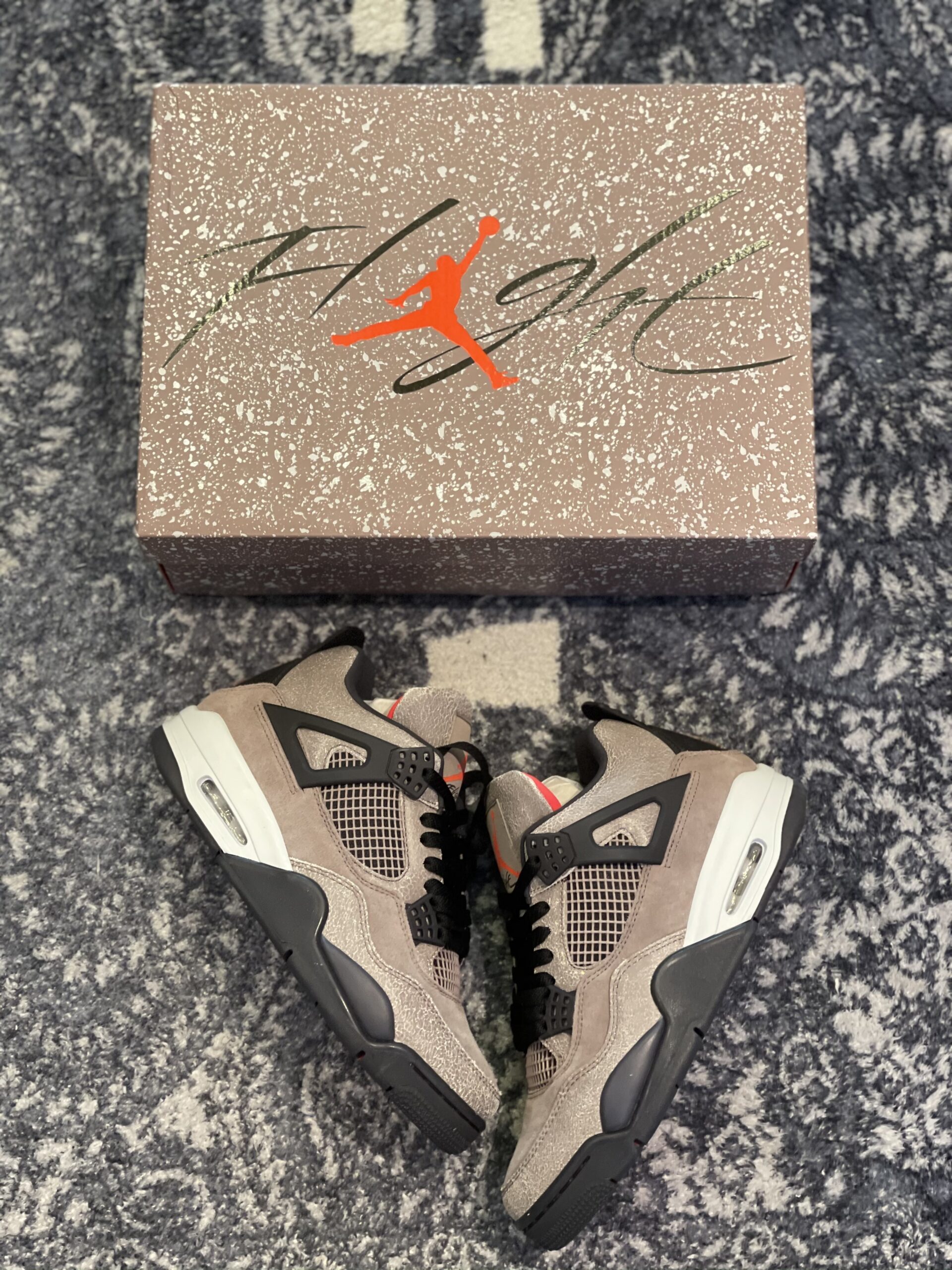 Air Jordan 4 Retro Taupe Haze is a compelling silhouette that balances rugged textures with a sophisticated, earthy color palette. This design features an upper primarily constructed from cracked, wear-away textures and smooth suede, offering a unique “Infrared” pop on the tongue and inner lining for a bold contrast. The dark grey accents on the plastic wing eyelets, heel tabs, and laces ground the look, while the sail-colored midsole provides a classic finish. Disclaimer: These products are not original products but were inspired by the original product brand. Crafted for those who appreciate a vintage, distressed aesthetic, this version utilizes high-quality synthetic materials to replicate the cracked-leather effect that has become a staple in modern streetwear. The mesh side panels and signature “Flight” branding on the tongue stay true to the iconic 1989 basketball heritage. The rubber outsole features a multi-directional herringbone pattern for traction, making it as functional as it is stylish. This inspired iteration captures the essence of the high-end Taupe Haze release, focusing on durability and visual depth. Whether paired with cargos or denim, these sneakers provide a premium look that fits perfectly into any contemporary wardrobe.