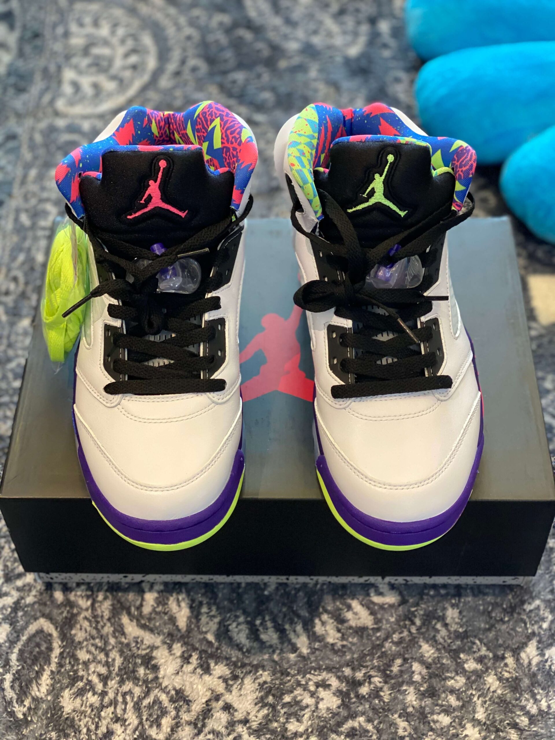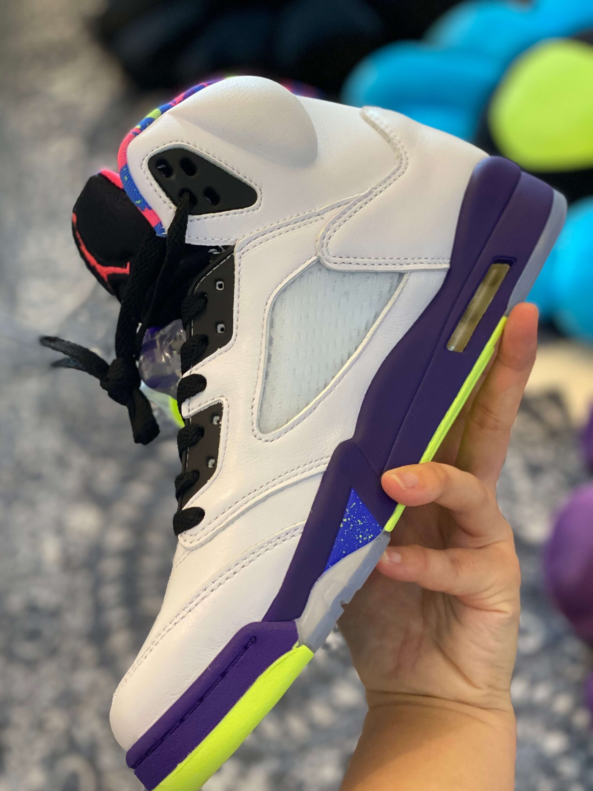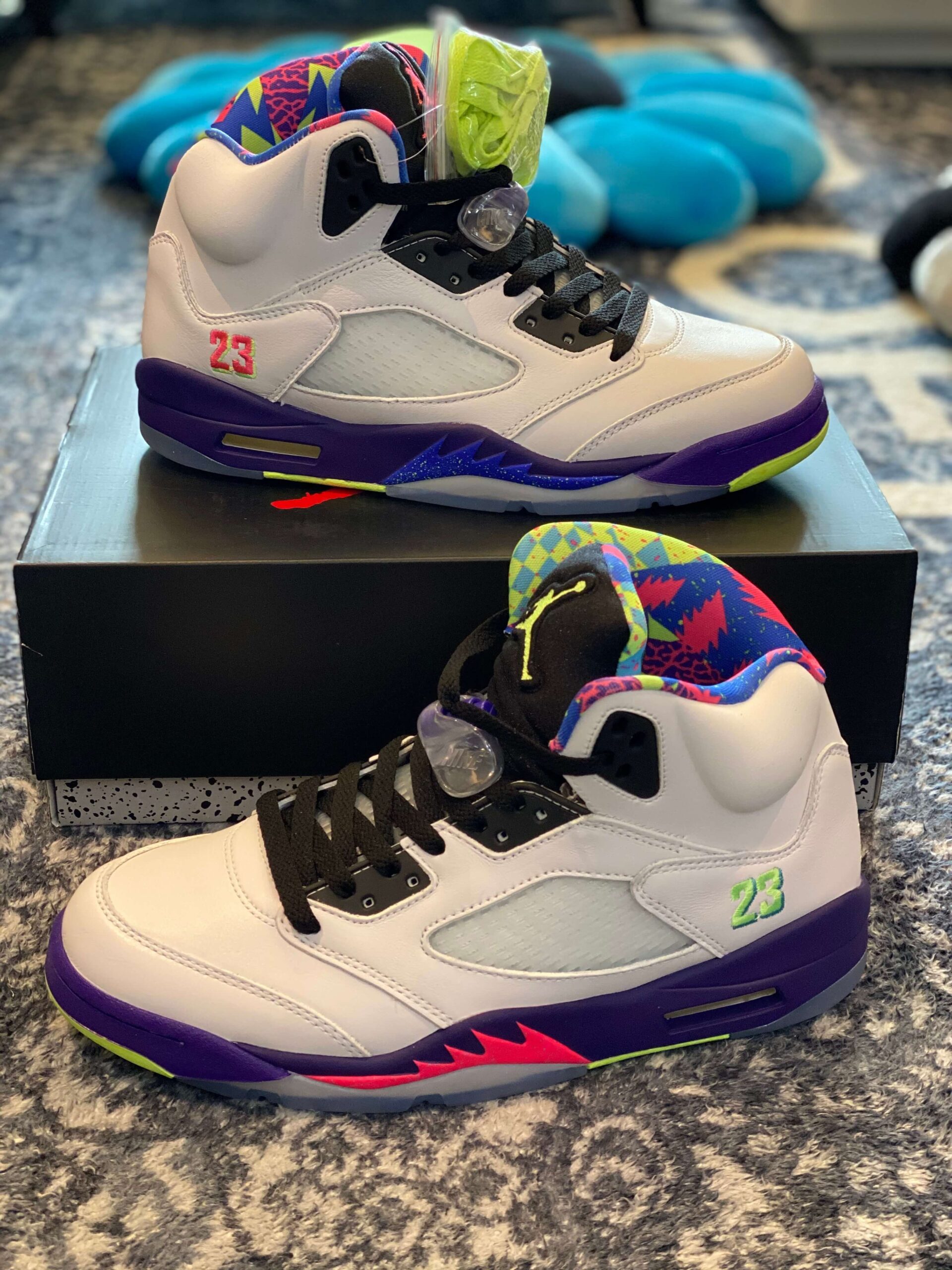 Air Jordan 5 “Alternate Bel-Air” White Purple Neon Pink brings an energetic, throwback vibe to the iconic silhouette, making a loud statement inspired by the fresh prince of Bel-Air. The base of the sneaker is constructed from clean, premium white leather, providing a perfect canvas for the explosion of color found throughout the rest of the shoe. The vibrant, multi-colored accents are the centerpiece of this design, particularly the collar lining and the tongue, which feature a chaotic, graphic print utilizing hot pink, neon green, teal, and blue—a clear nod to 90s style. Below, the classic shark-tooth detailing on the midsole is executed in a dynamic combination of solid purple, electrifying neon yellow, and an eye-catching speckled pink section. The tongue stands out in black with a pop of pink on the inside and a neon yellow Jumpman logo on the outer heel. Translucent netting on the side panels and a translucent blue/pink outsole add depth and dimension to the overall design. With its high-top cut and visible Air cushioning in the heel, this sneaker ensures both a comfortable fit and reliable performance, appealing to both style enthusiasts and those seeking a nostalgic flair. This “Alternate” version takes the original concept and intensifies the palette, guaranteeing that the wearer will stand out in any crowd. Please note: These products are not original brand-name products but are inspired by the design and aesthetic of the original Air Jordan 5 “Alternate Bel-Air” model.