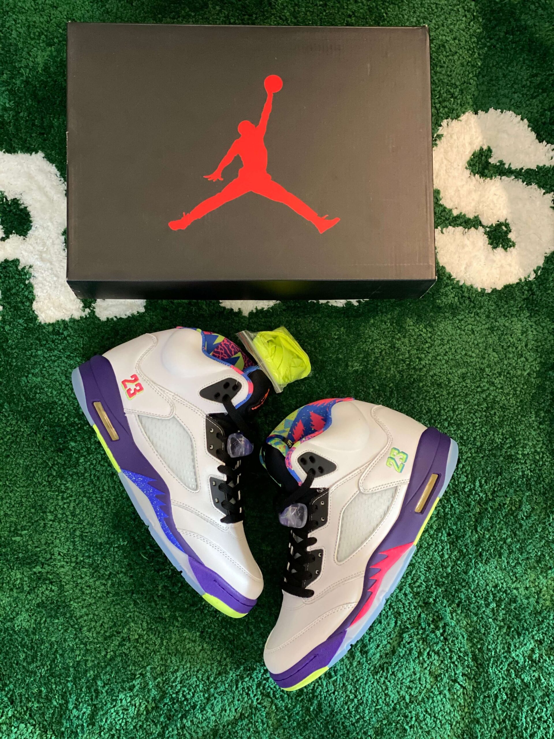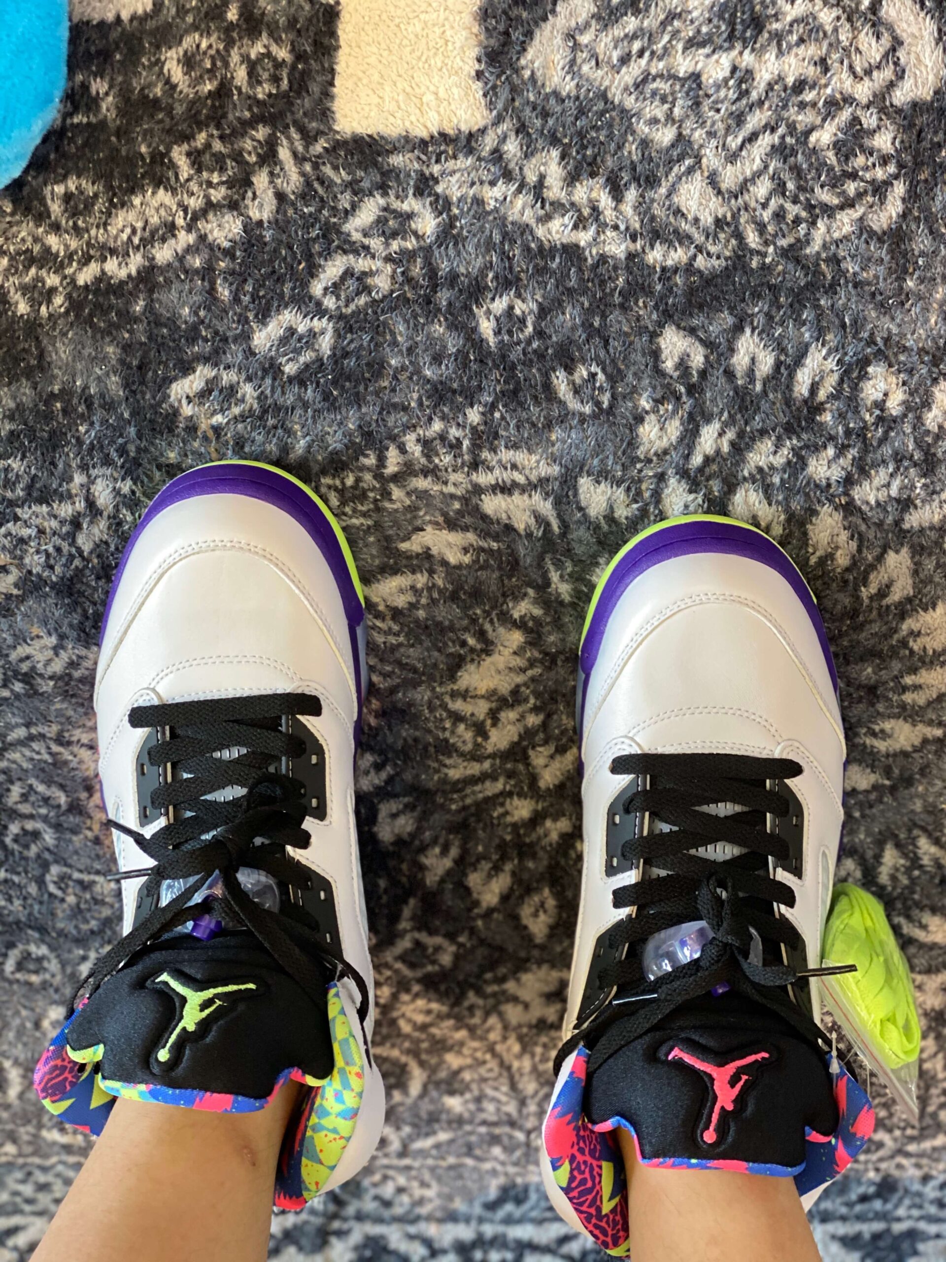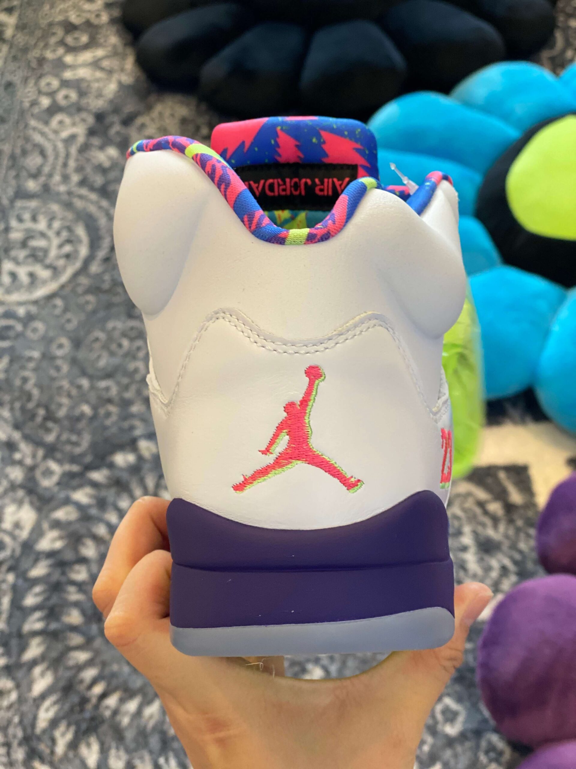Air Jordan 5 “Alternate Bel-Air” White Purple Neon Pink brings an energetic, throwback vibe to the iconic silhouette, making a loud statement inspired by the fresh prince of Bel-Air. The base of the sneaker is constructed from clean, premium white leather, providing a perfect canvas for the explosion of color found throughout the rest of the shoe. The vibrant, multi-colored accents are the centerpiece of this design, particularly the collar lining and the tongue, which feature a chaotic, graphic print utilizing hot pink, neon green, teal, and blue—a clear nod to 90s style. Below, the classic shark-tooth detailing on the midsole is executed in a dynamic combination of solid purple, electrifying neon yellow, and an eye-catching speckled pink section. The tongue stands out in black with a pop of pink on the inside and a neon yellow Jumpman logo on the outer heel. Translucent netting on the side panels and a translucent blue/pink outsole add depth and dimension to the overall design. With its high-top cut and visible Air cushioning in the heel, this sneaker ensures both a comfortable fit and reliable performance, appealing to both style enthusiasts and those seeking a nostalgic flair. This “Alternate” version takes the original concept and intensifies the palette, guaranteeing that the wearer will stand out in any crowd. Please note: These products are not original brand-name products but are inspired by the design and aesthetic of the original Air Jordan 5 “Alternate Bel-Air” model.