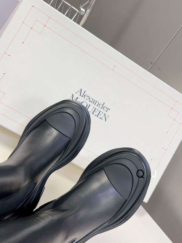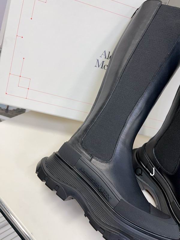 Alexander McQueen Black Leather Knee-High Chelsea Tread Boots are a dramatically oversized take on the classic equestrian boot, blending high fashion elegance with rugged, utilitarian architecture. These boots feature a tall, knee-high shaft constructed from smooth black leather, providing a luxurious and commanding profile. The design incorporates the traditional Chelsea boot elastic side panels, ensuring a comfortable and flexible fit around the calf while maintaining a sleek, uninterrupted look. The upper also features a distinct rubberized toe cap detail, lending the boot a structured, industrial edge and added protection.