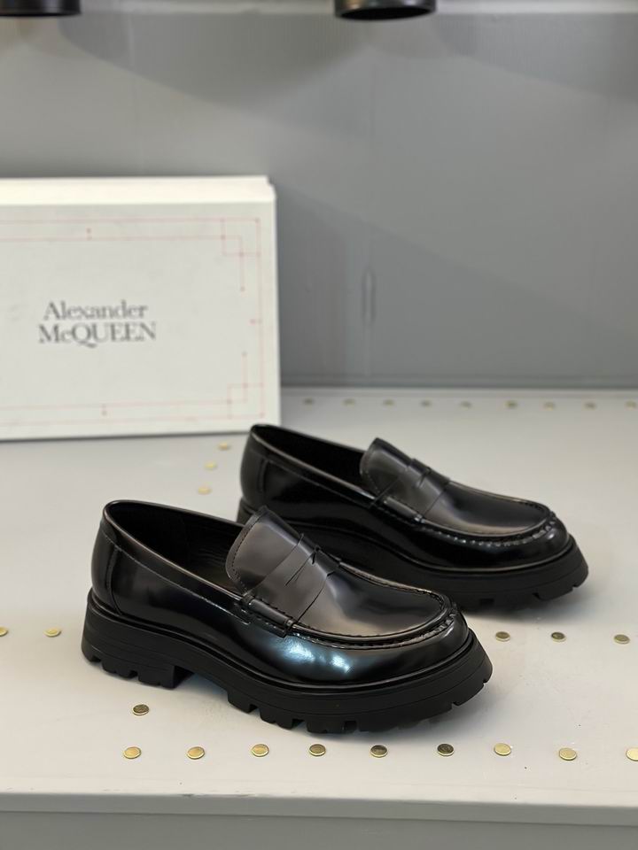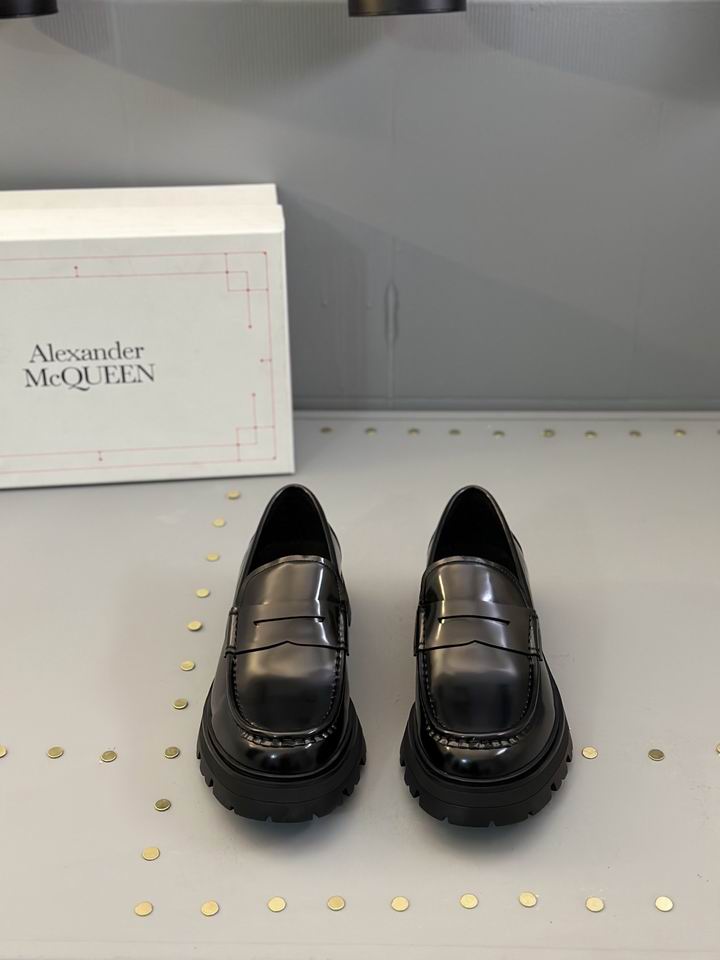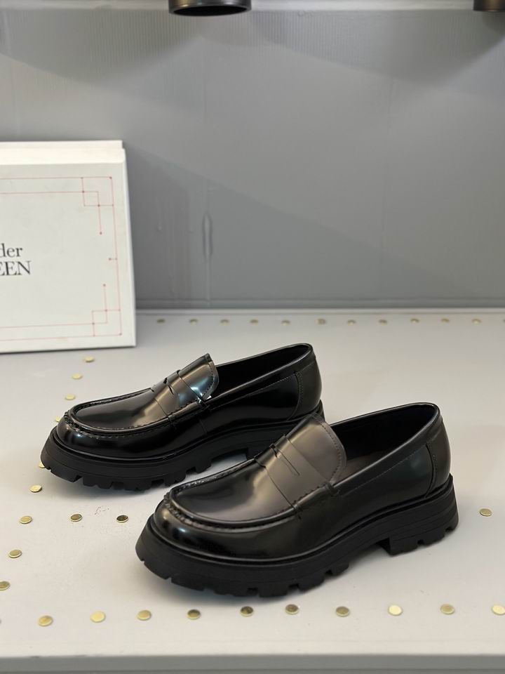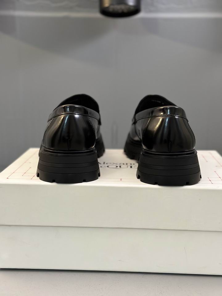 Alexander McQueen Black Patent Leather Penny Loafers are a striking example of contemporary luxury footwear, perfectly blending a classic silhouette with a distinctly modern, aggressive design element. The upper is crafted from high-gloss black patent leather, giving the shoe a sleek, mirror-like finish that demands attention and instantly elevates any ensemble. The traditional penny loafer design, complete with the iconic saddle strap across the vamp, maintains an air of timeless sophistication. This juxtaposition of the traditional penny loafer aesthetic with an oversized, rugged sole is what makes this pair a statement piece in any modern wardrobe.