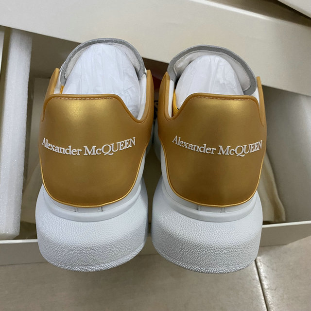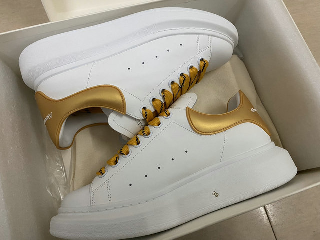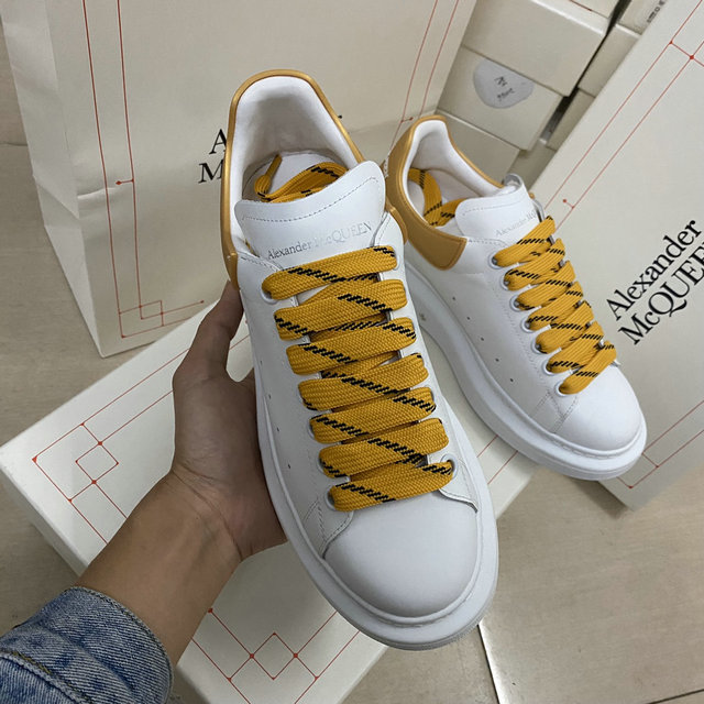 Alexander McQueen Oversized Sneaker in White/Gold with Yellow Laces: This is a bold, athletic, and luxurious twist on the brand’s highly popular Oversized sneaker silhouette, characterized by its clean lines and dramatically proportioned sole. The upper is constructed from smooth, pristine white leather, providing a classic, premium base. A striking metallic gold leather heel tab serves as the primary accent, featuring the Alexander McQueen logo embossed in contrast lettering, ensuring high-visibility branding from the back. The look is completed with thick, textured yellow and black hiking-style laces, injecting a vibrant, unexpected pop of color and rugged contrast against the pure white leather. The sneaker sits atop the iconic chunky white rubber sole, which offers significant height and a distinctive, sculptural look that defines the shoe. Perforated ventilation holes on the side panels maintain the sporty aesthetic. This design is perfect for elevating casual wear with a touch of high-fashion irreverence and street-ready flair. Radiate luxury with this vibrant take on the signature oversized sneaker. Crafted from pristine white calf leather, this model features a shimmering metallic gold heel counter that catches the light with every step. To further elevate the bold aesthetic, the sneaker is styled with striking sun-yellow flat laces, creating a high-energy contrast against the crisp white upper. The design is anchored by the unmistakable 45mm chunky white rubber platform sole, providing iconic height and cushioned support. With its blend of metallic accents and bright pops of color, these sneakers are the ultimate designer-inspired choice for those who want their streetwear to stand out.