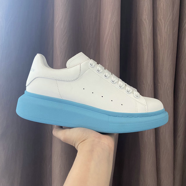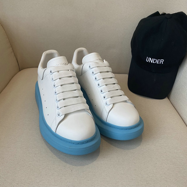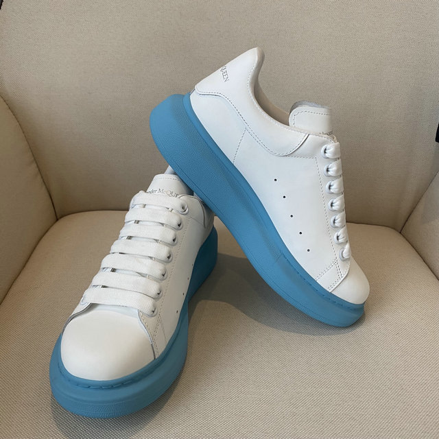 Alexander McQueen Oversized Sneaker in White with Sky Blue Sole:is an iteration of the brand’s celebrated oversized low-top sneaker makes a vibrant statement by contrasting a clean, classic white leather upper with a bold, colorful sole. The upper is crafted from smooth, premium white leather, retaining the signature round toe, seven-eyelet lacing system, and subtle perforated details on the side for breathability. The white leather extends to the heel tab, where the Alexander McQueen logo is discretely debossed. The most distinguishing feature is the dramatically oversized rubber sole, rendered here in a striking sky blue color. This thick, sculptural sole provides considerable elevation and injects a playful, contemporary pop of color into the traditionally minimalist design, transforming the shoe into a dynamic focal point. The substantial construction ensures stability and comfort while maintaining the architectural proportions that define the style. This sneaker is a perfect fusion of luxury materials, athletic comfort, and head-turning modern design.