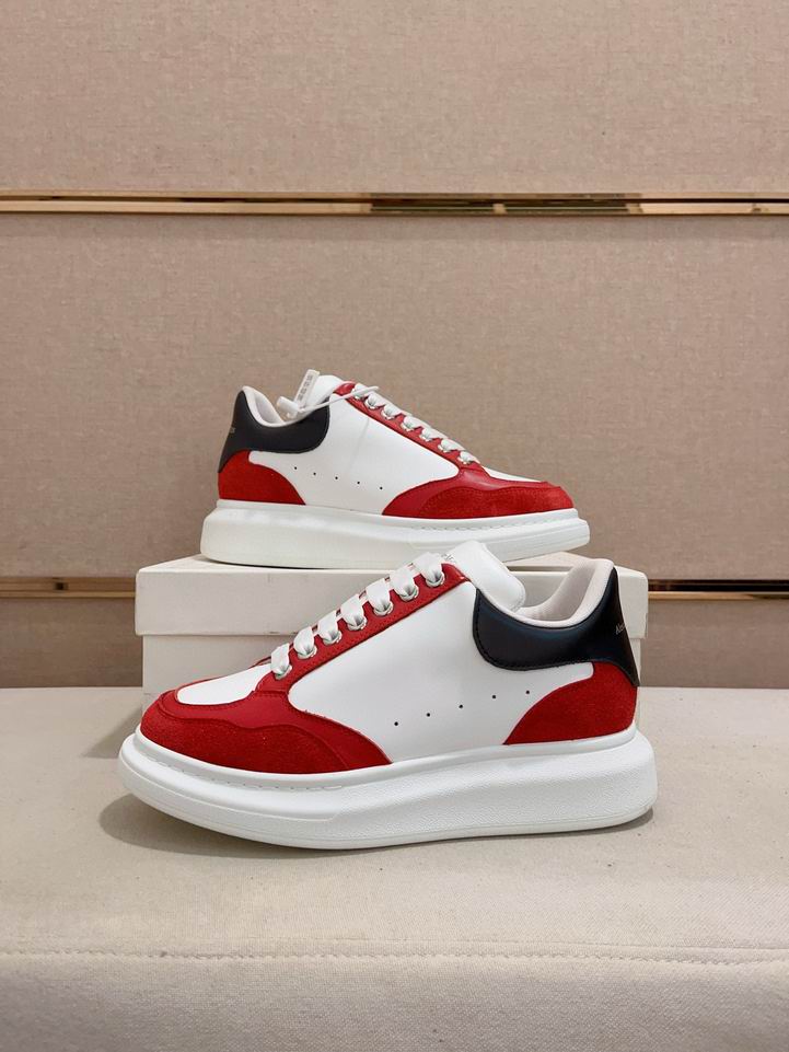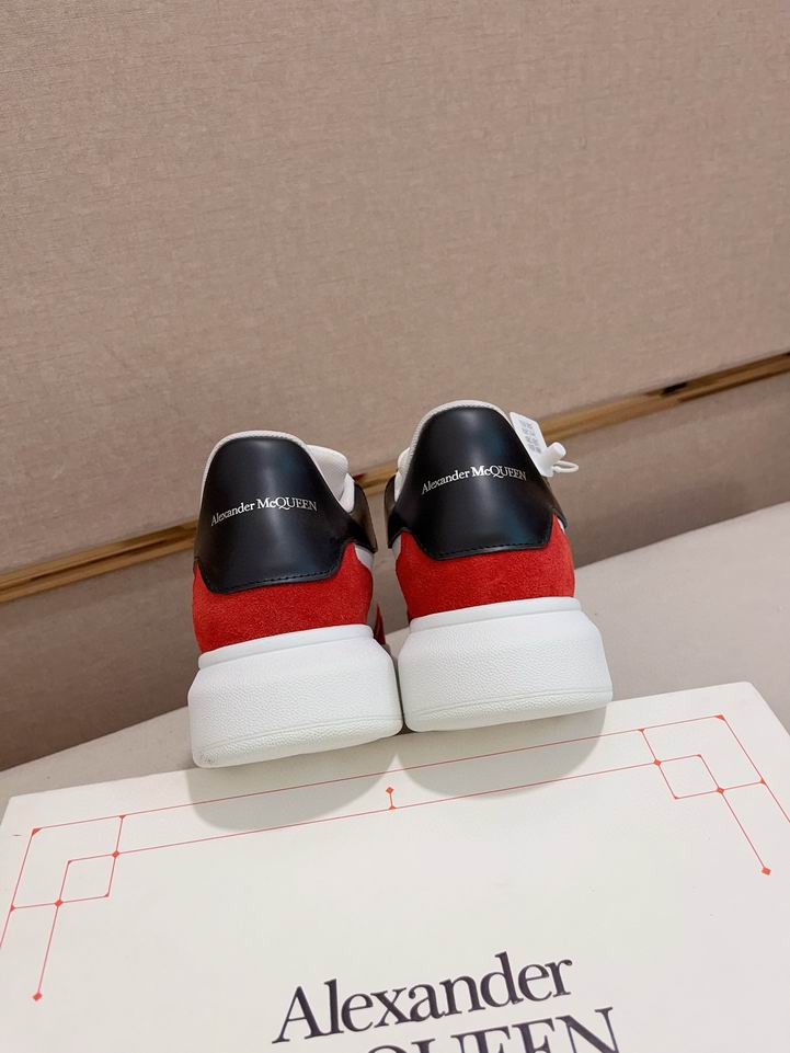 Alexander McQueen Style Oversized Sneaker – White, Red & Black Suede is a bold, color-blocked interpretation of the signature platform sneaker, leveraging contrasting textures for maximum impact. The defining feature is the crisp, voluminous white rubber sole, which is instantly recognizable and provides both significant height and a modern, dramatic foundation. The upper is constructed from smooth white leather, which forms the main side panels and eyelet area, punctuated by a vibrant Red suede overlay that wraps around the toe box and side base of the shoe. This bold Red suede provides a tactile softness that sharply contrasts with the smooth leather sections. The final color detail is found on the heel tab, which is rendered in smooth, deep black leather, offering a striking, dark contrast against the surrounding White sole and main body. The laces are white, perfectly matching the sole and upper for a clean finish. The meticulous color placement—White for the body, Red for the soft overlays, and Black for the rear accent—creates a visually arresting and athletic aesthetic. The combination of textures—smooth leather, soft suede, and chunky rubber—further elevates the design, making this sneaker a dynamic and spirited choice for casual luxury wear.Make a bold statement with these high-contrast oversized sneakers, featuring a sophisticated color-blocked design. The base is crafted from premium smooth white calf leather, accented by a striking red suede heel counter that provides a rich, tactile pop of color. To ground the aesthetic, deep black leather detailing lines the trim, adding a geometric edge to the iconic silhouette. The shoe is anchored by the signature 45mm chunky white rubber platform sole, delivering the unmistakable Alexander McQueen-inspired height and cushioned support. With its blend of vibrant suede and classic leather, this sneaker is a versatile powerhouse for elevating luxury streetwear and athleisure wardrobes.