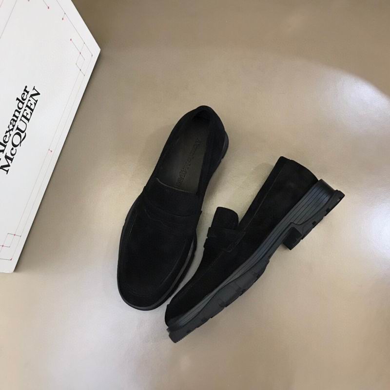 Alexander McQueen Wander Penny Loafer Black Suede is a masterclass in texture and silhouette, reimagining the quintessential penny loafer through a high-fashion, rugged lens. Expertly crafted from premium, velvety black suede, these loafers offer a rich, matte finish that provides a softer alternative to traditional polished leather. The design maintains the classic penny strap across the vamp, but elevates the entire look with the signature Wander flared rubber lug sole. This chunky, oversized base provides a dramatic architectural profile while ensuring excellent grip and durability for everyday wear. The interior is fully lined with smooth tonal leather and features an embossed logo on the footbed, ensuring that every step is taken in absolute comfort. Please note that these products are not original but were inspired by the original brand, designed to capture the iconic aesthetic and premium feel of the McQueen Wander collection. Perfect for those who appreciate a blend of heritage styling and contemporary grit, these suede loafers transition effortlessly from smart-casual ensembles to more experimental, edgy outfits.