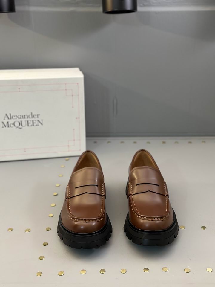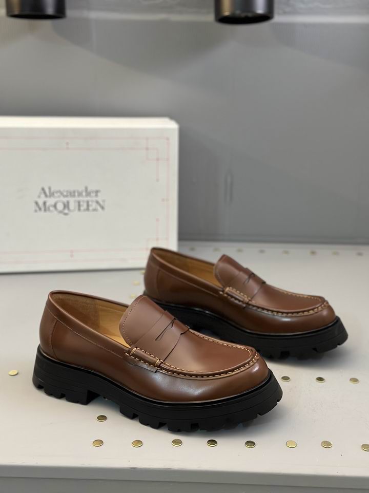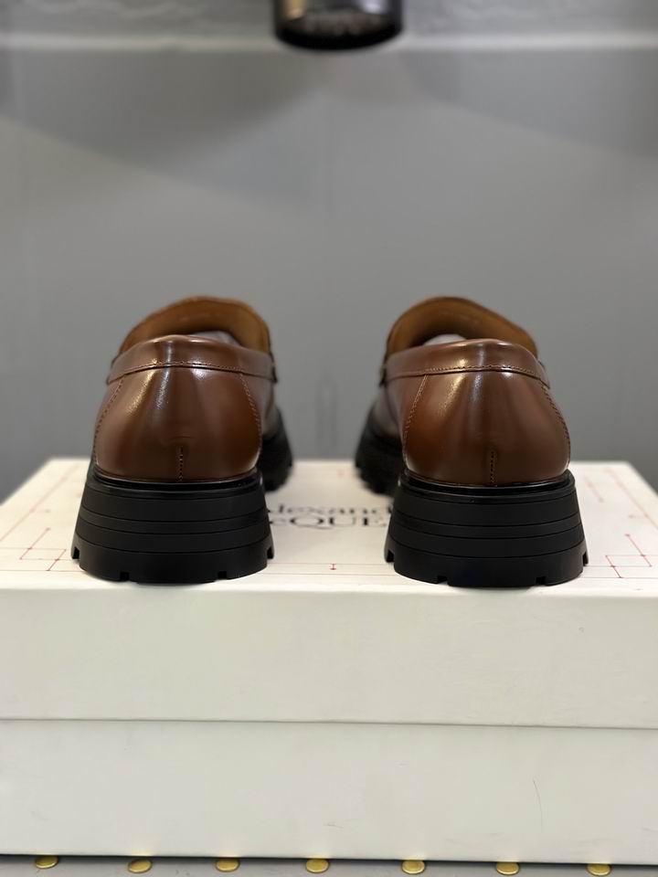 Alexander McQueen Wander Penny Loafer Leather Cedar shoes represent a bold fusion of heritage formal wear and contemporary industrial design. These loafers are meticulously crafted from premium calf leather in a rich, warm Cedar tone, offering a sophisticated alternative to standard black or dark brown footwear. The upper features a classic penny loafer silhouette, complete with a traditional slotted strap across the vamp and tonal hand-stitched detailing along the apron toe. This elegant upper is daringly contrasted by an exaggerated, flared rubber lug sole in matte black, which provides both a dramatic height boost and a rugged aesthetic. The interior is lined with smooth, natural-toned leather for exceptional comfort and breathability during extended wear. Designed for those who appreciate avant-garde fashion, these loafers bridge the gap between a dress shoe and a functional boot. The Cedar colorway is particularly versatile, pairing effortlessly with navy tailoring, earth-toned trousers, or even premium denim. Every seam and stitch is placed with precision to ensure the shoe maintains its structured shape while allowing the leather to patina beautifully over time. By combining the refined profile of a classic loafer with the aggressive stance of a modern trek sole, these shoes redefine luxury footwear for the modern era.
