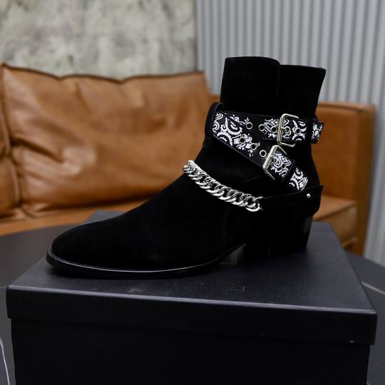 Amiri Bandana Chain Suede Ankle Boot Black represents the pinnacle of rock-and-roll luxury, blending high-fashion sensibilities with a rugged, edgy aesthetic. These boots are expertly crafted from premium black suede, offering a soft yet durable texture that provides a sophisticated matte finish. The silhouette is defined by its pointed toe and a slight Cuban heel, giving the wearer an elevated profile that transitions perfectly from daytime events to evening social gatherings. What truly sets this footwear apart is the intricate hardware and strap detailing that wraps around the ankle, creating a layered, multi-dimensional look.
