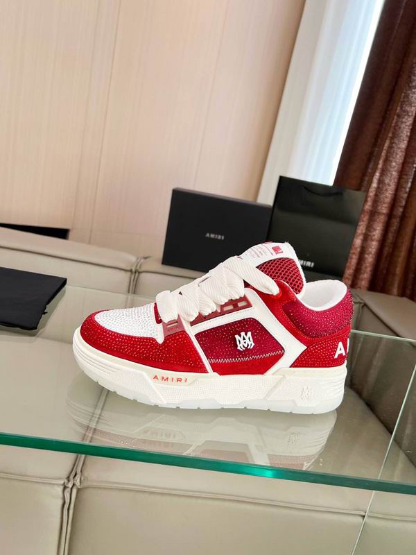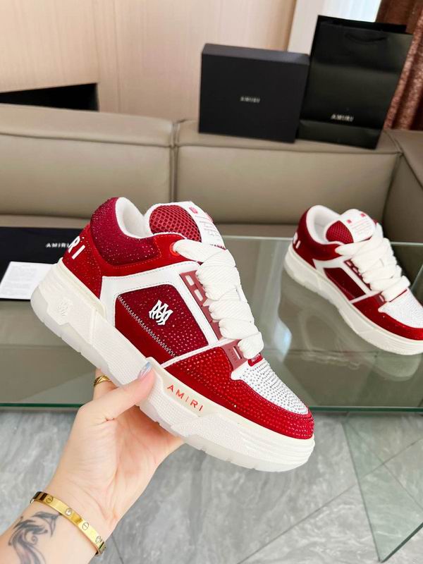 The Amiri Court Low Crystal Red White is a breathtaking fusion of high-fashion opulence and the gritty, rebellious aesthetic of 90s West Coast skate culture. This specific silhouette takes the classic low-top court design and elevates it to a piece of wearable art, featuring a striking patchwork of leather star appliqués and shimmering crystal embellishments that catch the light with every step. The vibrant red and crisp white colorway creates a high-contrast visual that serves as a bold statement piece for any luxury streetwear collection. Each pair is meticulously constructed with a premium leather and canvas upper, offering a structural integrity that balances flexibility with durability. The design is further defined by its signature molded rubber outsole and a protective rubber toe cap, both of which pay homage to traditional athletic footwear while maintaining a contemporary edge. The interior is lined with buffed leather for a plush, high-end feel against the skin, ensuring that these sneakers feel as good as they look. Perforated details on the toe box enhance ventilation, keeping the foot cool during extended wear. These shoes are finished with a convenient pull-loop at the heel and a logo-embossed tongue that subtly signals the brand’s prestigious heritage.