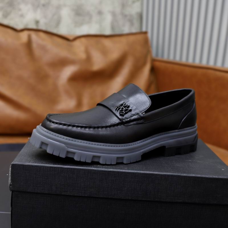 The Amiri Chunky Lug Sole Leather Loafer represent a masterful, modern juxtaposition, flawlessly integrating the formality of a classic dress shoe with the rugged, oversized profile of contemporary street style. These loafers utilize a traditional penny loafer silhouette, featuring an upper crafted from luxurious black leather, which is offered in both a high-shine polished finish and a softer matte texture, depending on the specific model. This sleek black material provides a timeless, sophisticated aesthetic, highlighted by meticulous apron stitching around the toe box. The shoe’s traditional foundation is aggressively modernized by its sole unit: a dramatically oversized, chunky lug sole finished in a bold, contrasting matte deep grey color. This robust, heavily treaded sole elevates the shoe’s height and profile, making a powerful, utilitarian statement that is central to the rock-and-roll luxury movement. Located prominently on the saddle of the loafer (the penny strap) is the distinctive ‘MA’ logo hardware, which comes in a dark, metallic finish, adding an instantly recognizable designer- touch and enhancing brand recognition. The construction of the shoe is engineered for durability, featuring a thick midsole that provides substantial support and a stable platform, ensuring comfortable wear despite the rugged look. The contrast between the formal black leather and the industrial grey lug sole makes these loafers exceptionally versatile. They can instantly upgrade casual ensembles like distressed denim and graphic tees, or add an unexpected, edgy twist to tailored trousers and blazers.