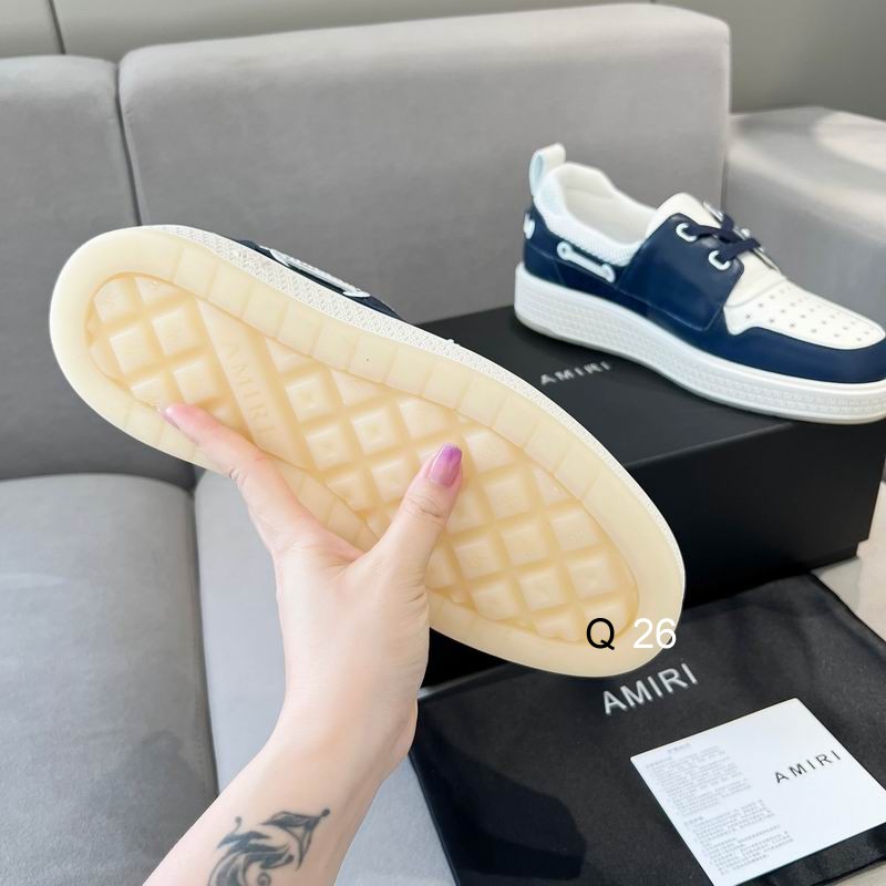 Amiri Style Skayside Low-Top Sneakers in Navy & White is a sophisticated fusion of nautical-design and high-end streetwear luxury. The upper is meticulously crafted with a deep navy blue leather paneling that contrasts beautifully against a crisp white leather base, creating a refined maritime color palette. A standout feature of this silhouette is the perforated star pattern on the toe box, which provides a unique twist on traditional ventilation while reinforcing the brand’s celestial-themed design language. The sneaker is constructed with a low-top profile, making it a versatile addition to any luxury footwear collection, suitable for both coastal getaways and urban environments.The Amiri Style Skayside Low-Top Sneakers in Navy & White is designed for maximum comfort, featuring a breathable mesh lining around the collar and a supportive padded tongue. The lacing system includes thick, high-quality flat laces in a matching navy hue, secured by polished silver-tone eyelets. Underneath, the shoe is supported by a thick, textured white midsole that offers excellent cushioning, paired with a semi-translucent cream rubber outsole for a modern, clean finish. Signature branding is visible on the heel and tongue, ensuring an authentic luxury aesthetic throughout.