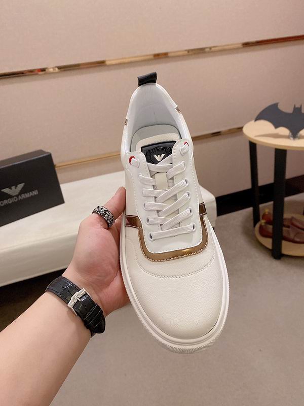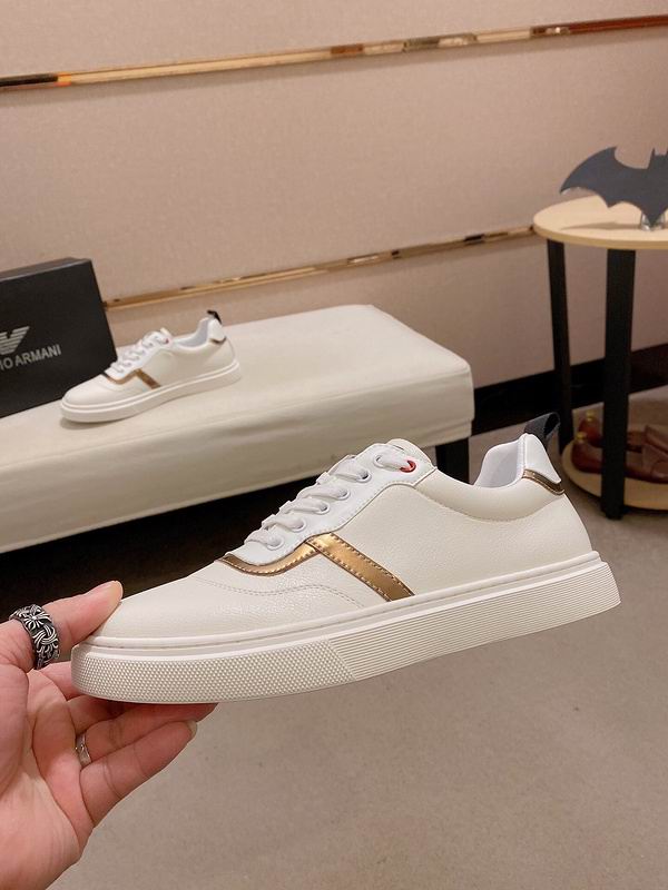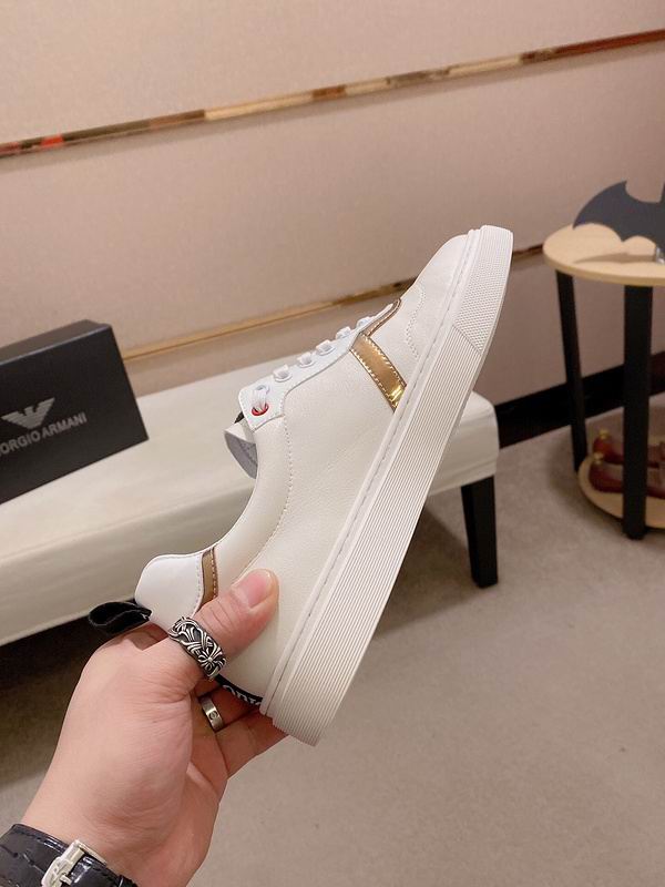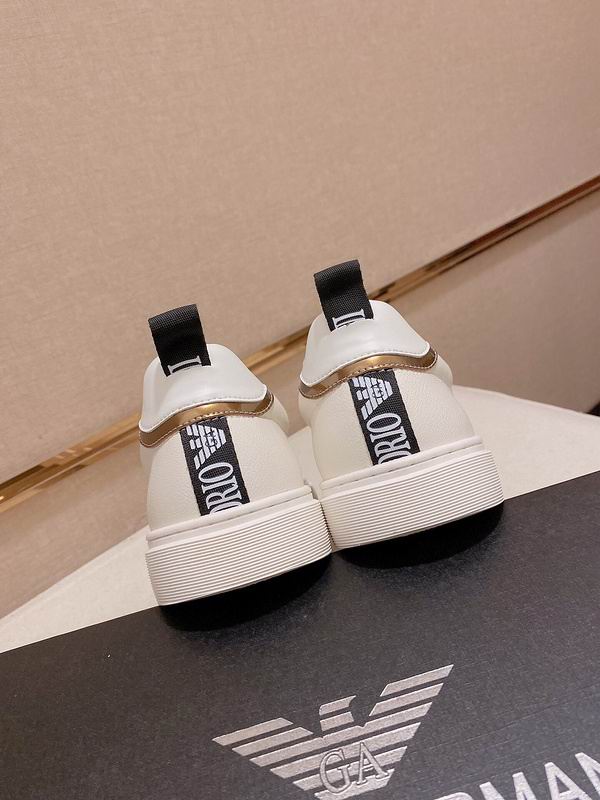 Armani Classic Low-Top Sneaker White/Gold represents a perfect fusion of luxury aesthetics and everyday comfort. The shoe is constructed with a high-quality synthetic leather upper in a brilliant white, providing a clean and versatile look that anchors any outfit. The standout feature is the metallic gold stripe that sweeps across the midfoot and curves around the heel counter, offering a premium visual contrast that catches the light. A black pull tab at the heel, adorned with white branding, ensures easy entry, while the thick, textured rubber cup sole provides excellent grip and a contemporary “platform” feel. Inside, the sneaker is lined with soft breathable material to ensure all-day comfort for the wearer. The tongue features a prominent black logo patch, reinforcing the designer-inspired aesthetic of the footwear.