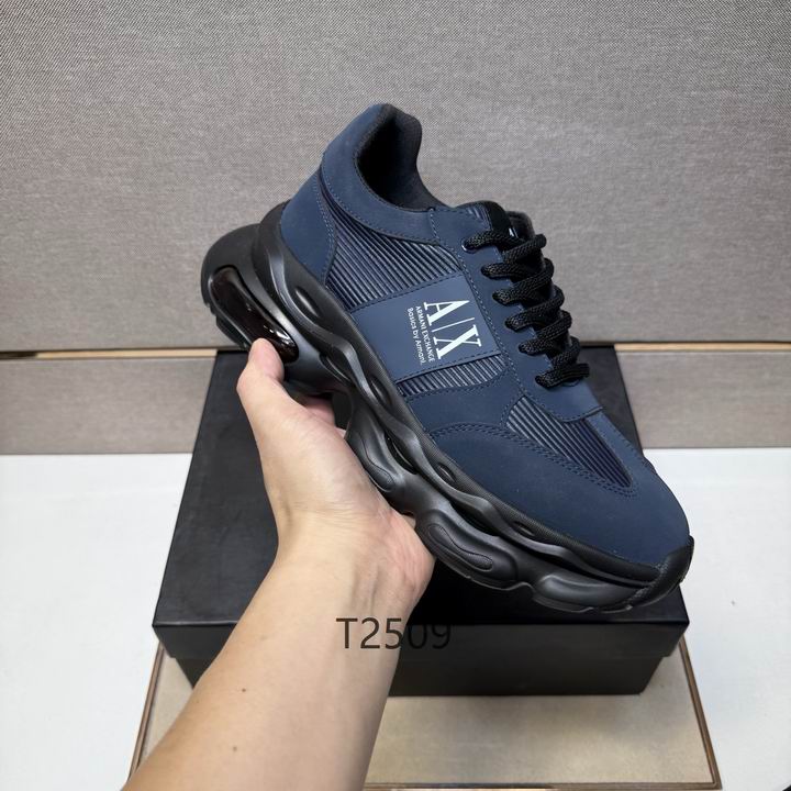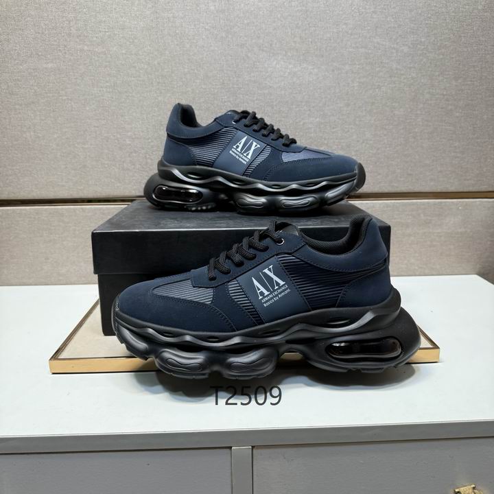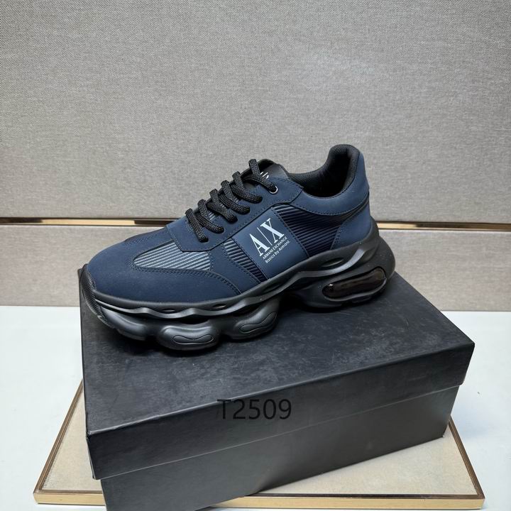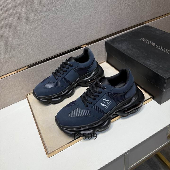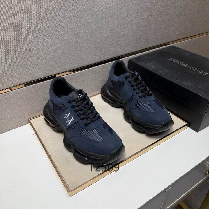 Armani Navy Sport Sneakers deliver a masterclass in urban luxury, blending a deep midnight aesthetic with high-performance footwear technology. These sneakers are expertly constructed with a multi-layered upper that utilizes durable synthetic overlays and breathable ribbed textile panels to ensure your feet stay cool and supported. Additionally, the side profile features a prominent navy blue and white “A|X” logo patch, which provides an unmistakable mark of designer prestige and modern streetwear influence. The massive, sculpted black midsole is designed to make a bold statement; consequently, it provides substantial elevation and incorporates a visible air cushioning unit in the heel for maximum impact protection.