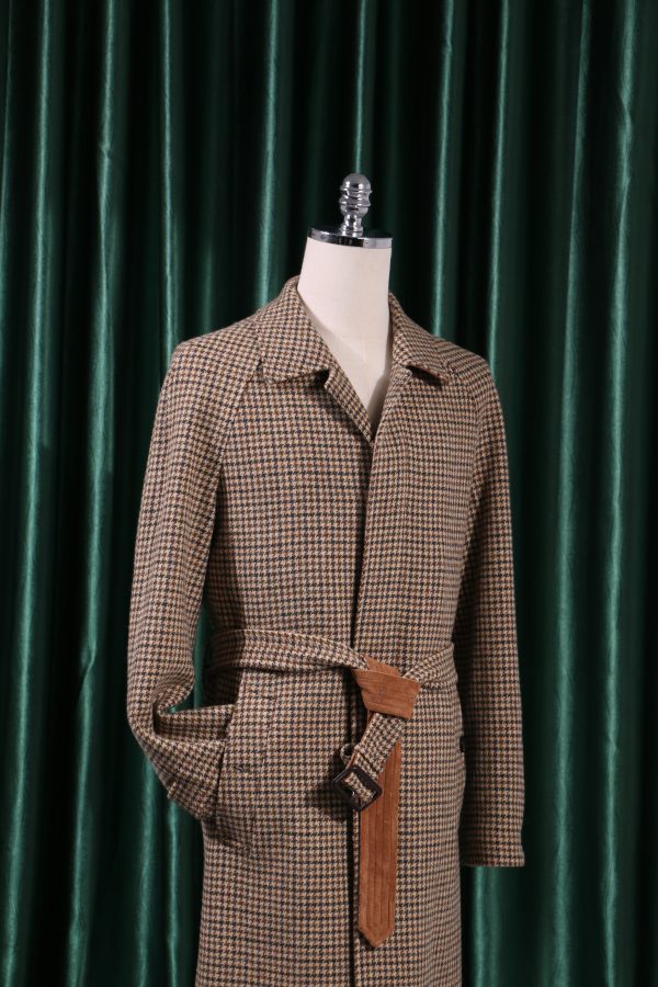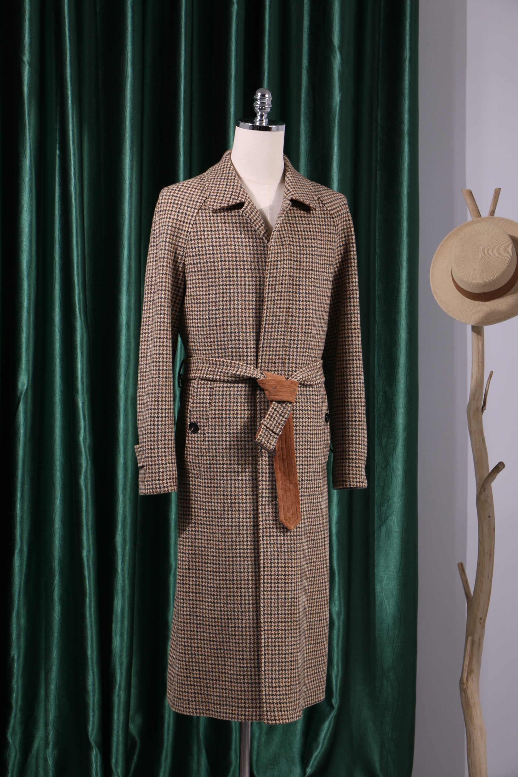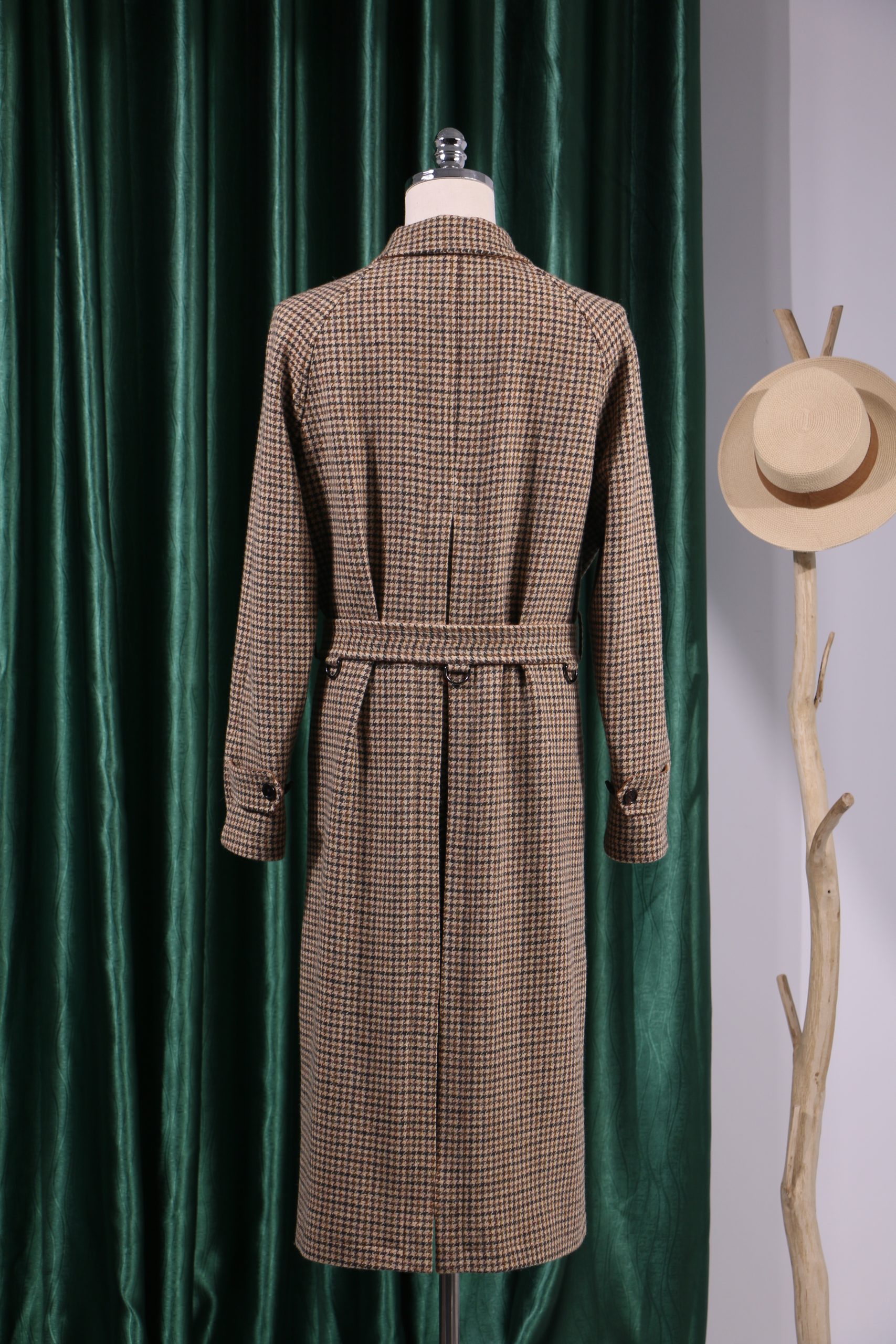 This elegant trench coat features a classic houndstooth pattern in warm earth tones, accented by a contrasting corduroy collar and matching waist belt. Its longline silhouette and structured raglan sleeves offer a timeless aesthetic suitable for professional or casual autumn wear. The hidden button placket and adjustable waist provide a clean, tailored finish.