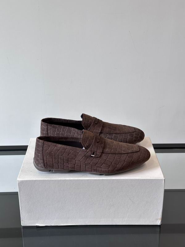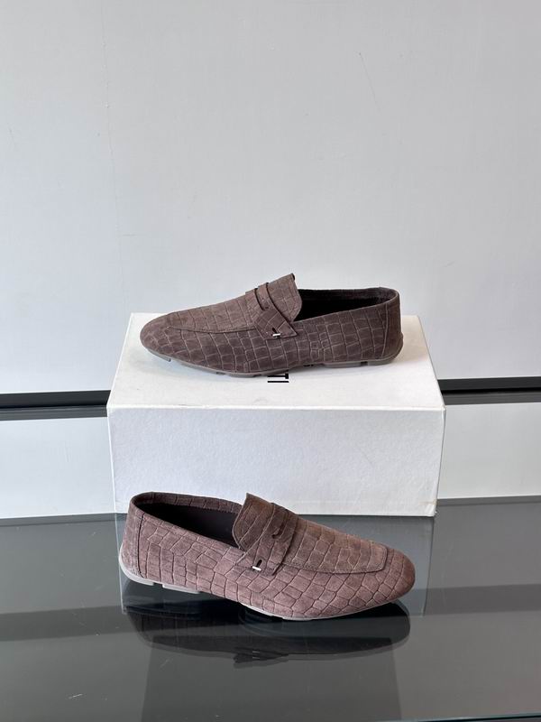 Berluti Loafer in Brown Embossed Suede. These exquisite loafers embody luxurious, traditional craftsmanship with a contemporary textural twist, reflecting the heritage of the renowned French house. Crafted from a rich brown suede, the leather has been skillfully treated and embossed with a realistic crocodile or alligator pattern across the entire upper, providing a sophisticated, tactile finish that immediately catches the eye. The classic loafer silhouette features a sleek, low-profile design with a traditional saddle strap (penny keeper detail) and a gently rounded toe. The interior is likely lined with premium leather, characteristic of high-end shoemaking, ensuring both comfort and durability. The sole is kept thin and flexible for a refined, close-to-the-ground feel, perfect for smart-casual and formal summer wear. The deep, warm brown color enhances the texture, making this pair a statement accessory for a discerning wardrobe. These loafers represent timeless elegance blended with a unique, textured material.