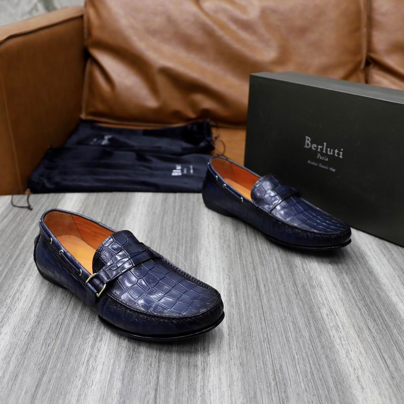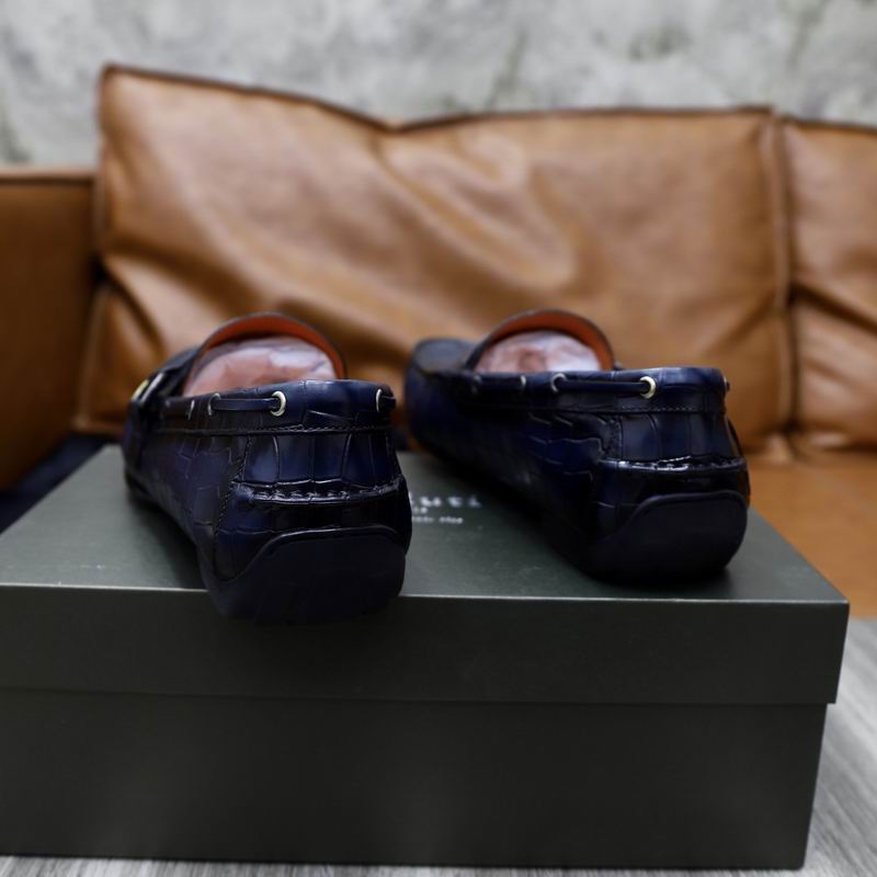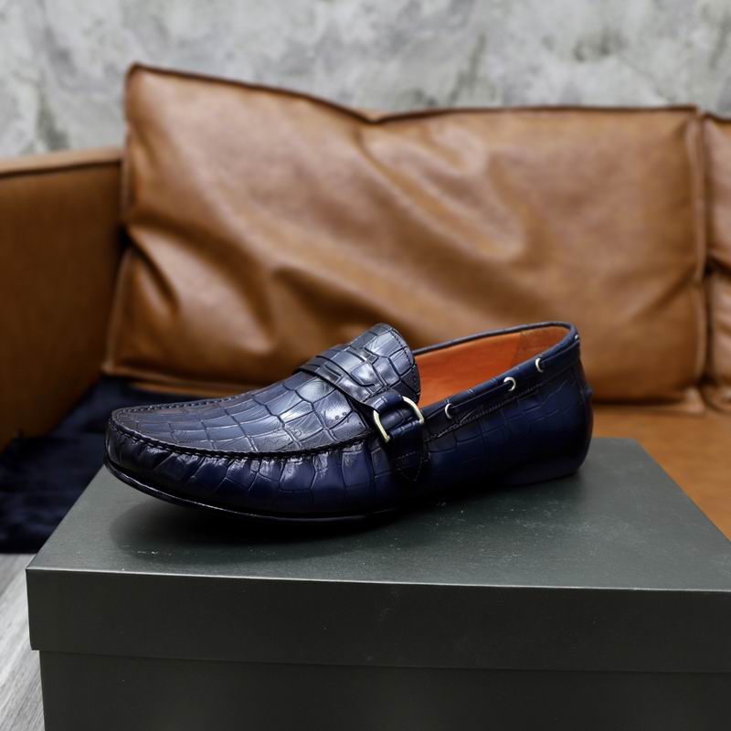 Berluti Style Alligator Loafer – Deep Ocean Blue is a sophisticated footwear choice that embodies classic elegance with a modern, rich color palette. These loafers feature a stunning Deep Ocean Blue leather upper that has been meticulously embossed to mimic the luxurious, complex texture of alligator skin, providing an elevated visual appeal that catches the light beautifully. The deep blue hue is versatile enough to pair with both formal tailoring and smart-casual ensembles, moving beyond traditional black or brown. The design is a classic driving loafer silhouette, characterized by the low profile and flexible construction for all-day comfort. A subtle leather strap crosses the vamp, secured by a small, gleaming silver-tone metal buckle that adds a tailored and refined touch. Inside, the lining is a contrasting warm orange/tan leather, which provides both a luxurious feel against the foot and a flash of unexpected color when the shoes are taken off, underscoring the craftsmanship. The edges of the leather upper are finished with meticulous stitching, ensuring durability and highlighting the shoe’s shape. The sole is kept sleek and minimal, crafted from dark rubber for excellent grip and flexibility, making them perfect for navigating urban environments with ease. This shoe is designed for the discerning individual who appreciates intricate textures, bold color, and timeless design. The rich Deep Ocean Blue color makes a strong style statement without being overly bright, maintaining a sense of luxurious understatement. The quality of the leather and the execution of the embossed pattern make this loafer a standout piece.