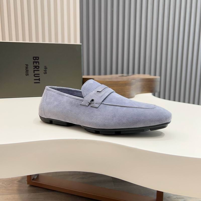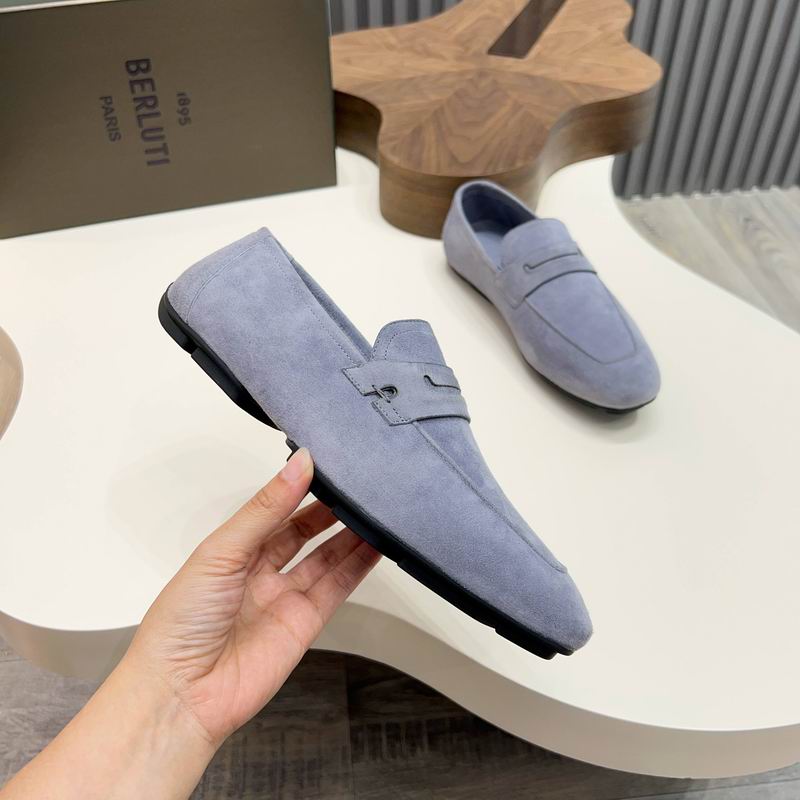 Berluti Suede Penny Loafer Grey:These loafers are constructed from premium, velvety soft suede in a versatile cool grey tone, providing a neutral yet elegant foundation for any professional or social wardrobe. The upper features tonal apron stitching and the iconic penny strap across the vamp, maintaining a sleek and minimalist aesthetic that bridges the gap between traditional and contemporary style.