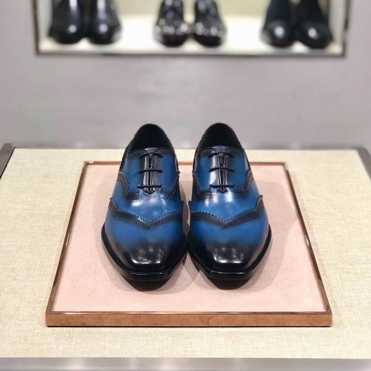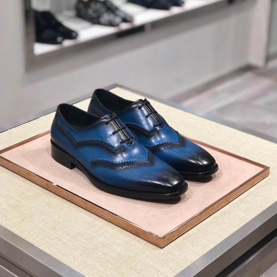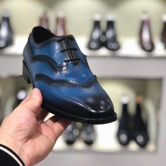 Berluti Wingtip Oxford (Blue Patina/Black): This exquisite dress shoe is a testament to Berluti’s mastery of leather artistry, featuring a striking two-tone design achieved through the brand’s iconic patina technique. The upper leather boasts a brilliant, rich blue hue that deepens to a contrasting black along the toe and wingtip edges, creating a dramatic, hand-finished aesthetic.