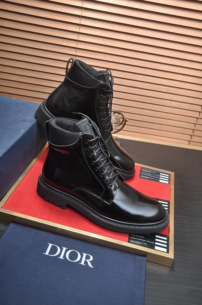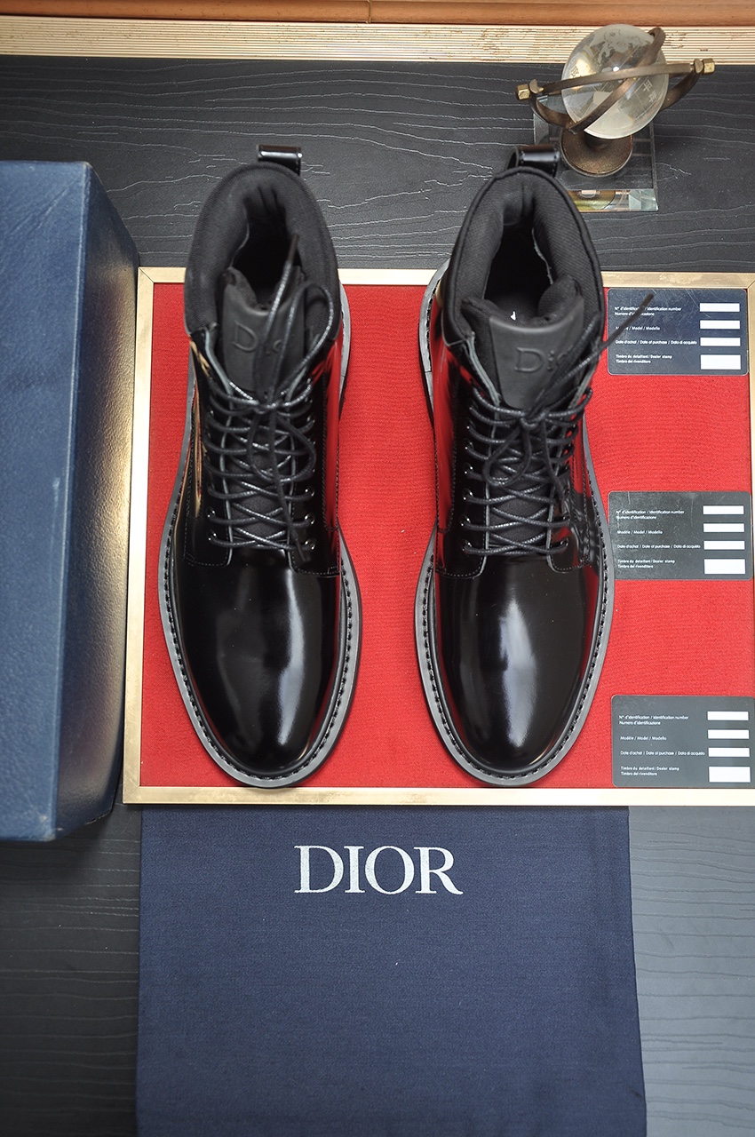 Infuse your look with rugged refinement using the Dior Patent Leather Lace-Up Combat Boot. This luxurious boot successfully merges the functional aesthetic of a combat boot with the high-fashion sheen of patent leather. Slick black patent leather forms the upper, featuring a polished vamp and secure lace-up closure with metallic eyelets. The padded, high-cut collar provides comfort and ankle support, while the substantial, durable sole delivers excellent traction. Subtle “DIOR” branding on the tongue finishes this powerful statement piece.