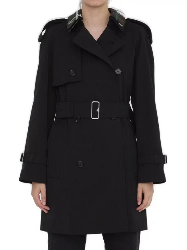 The Burberry Black Kensington Trench is a mid-length, regular-fit coat featuring a classic double-breasted front and set-in sleeves. It is constructed from water-repellent cotton gabardine and detailed with signature leather buckles and a check-patterned lining. This model offers a balanced, structured silhouette that fits comfortably over a variety of layers.
