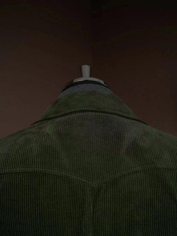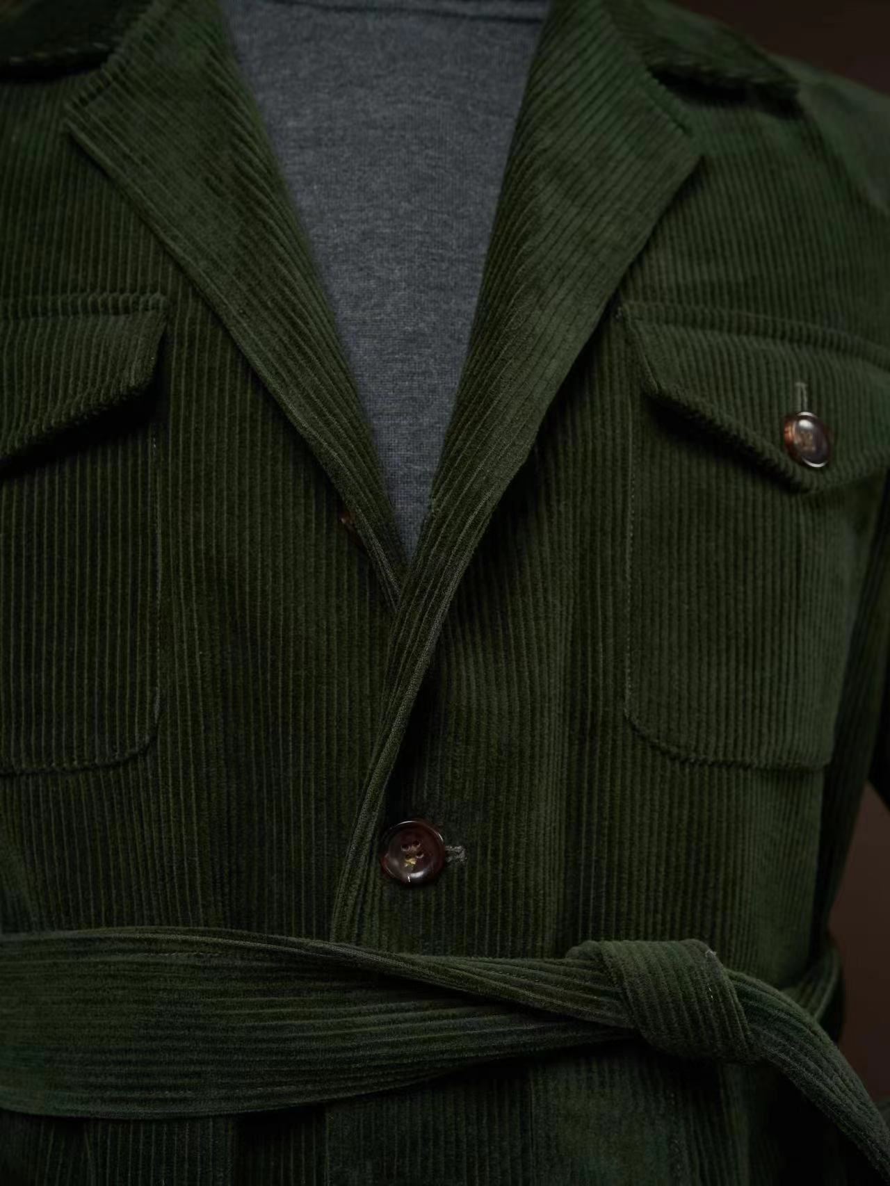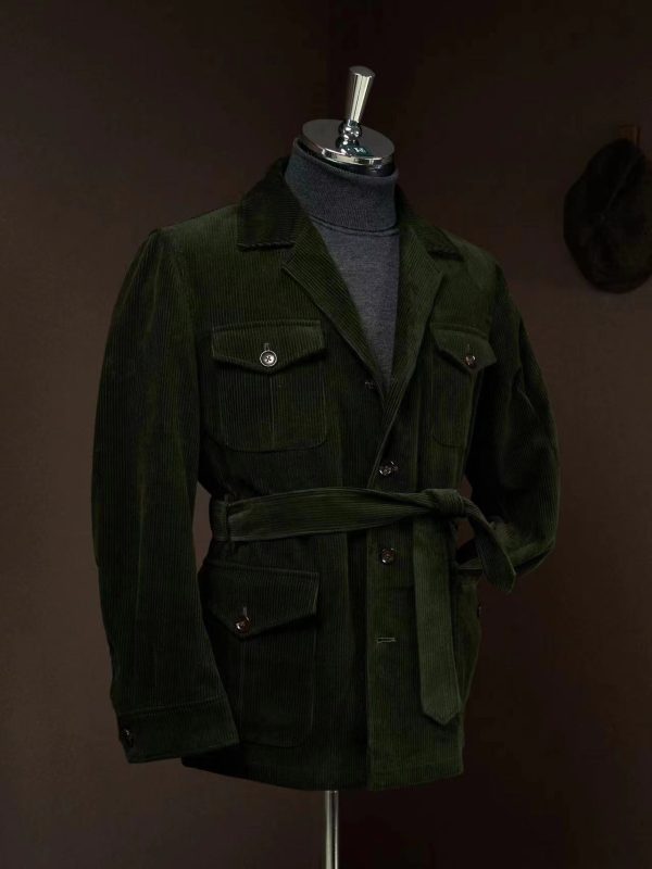 The Forest Green Corduroy Safari Jacket is a distinguished outerwear piece that masterfully combines tactical utility with a high-fashion, autumnal sensibility. Dressed in a deep, commanding forest green, this jacket is constructed from a premium wide-wale corduroy that offers a rich depth of color and a substantial, protective weight. The fabric’s natural ribbed texture provides a tactile complexity that catches the light, shifting between dark mossy tones and vibrant emerald highlights. Designed for the transition into cooler climates, the corduroy acts as a natural insulator, ensuring the wearer remains warm without sacrificing a sharp, structured aesthetic.