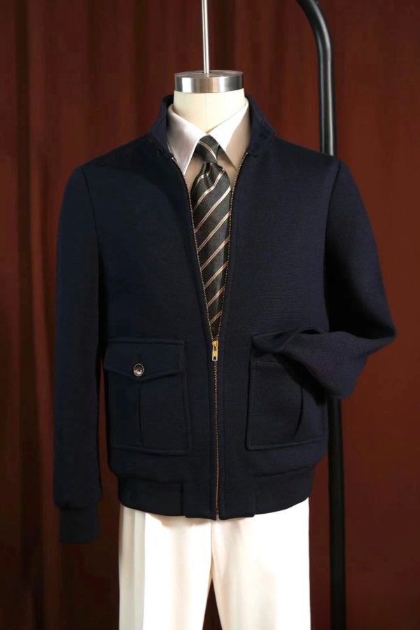 Key design elements include a robust gold-tone frontal zipper that adds a touch of metallic contrast against the dark fabric, paired with a sophisticated stand collar that provides extra protection and a modern edge. The jacket features two prominent lower bellows pockets with buttoned flaps, characteristic of the safari style, offering practical storage without sacrificing the garment’s sleek appearance. Ribbed cuffs and a matching hem provide a subtle bomber-inspired finish, ensuring a secure fit and helping to retain heat. Whether worn over a crisp shirt and tie for a business-casual commute or paired with a fine-gauge knit for a weekend outing, this jacket serves as the ultimate transitional piece for the discerning wardrobe.