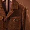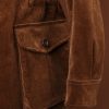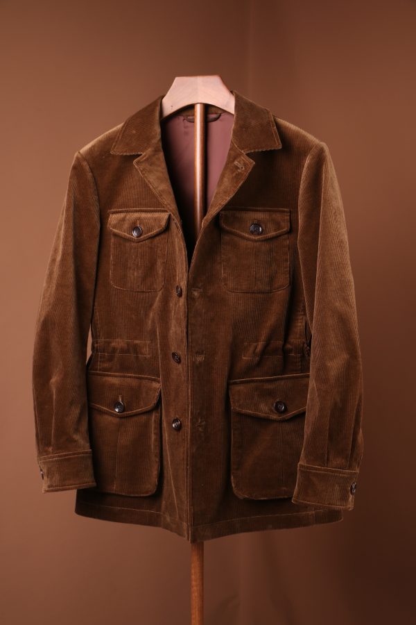 True to its safari roots, the jacket is designed with a symmetrical four-pocket front, featuring two pleated chest pockets and two larger bellows pockets at the hip, all secured with tonal button-flap closures. This functional layout is complemented by an internal drawstring waist, allowing the wearer to adjust the silhouette from a relaxed straight cut to a more defined, tailored shape. The jacket features a classic spread collar and buttoned cuffs that echo traditional shirting details, while the substantial weight of the corduroy ensures it hangs with a pleasing structural integrity. Whether paired with a cream turtleneck or a simple denim shirt, this jacket exudes a timeless, adventurous spirit balanced by a luxury aesthetic.