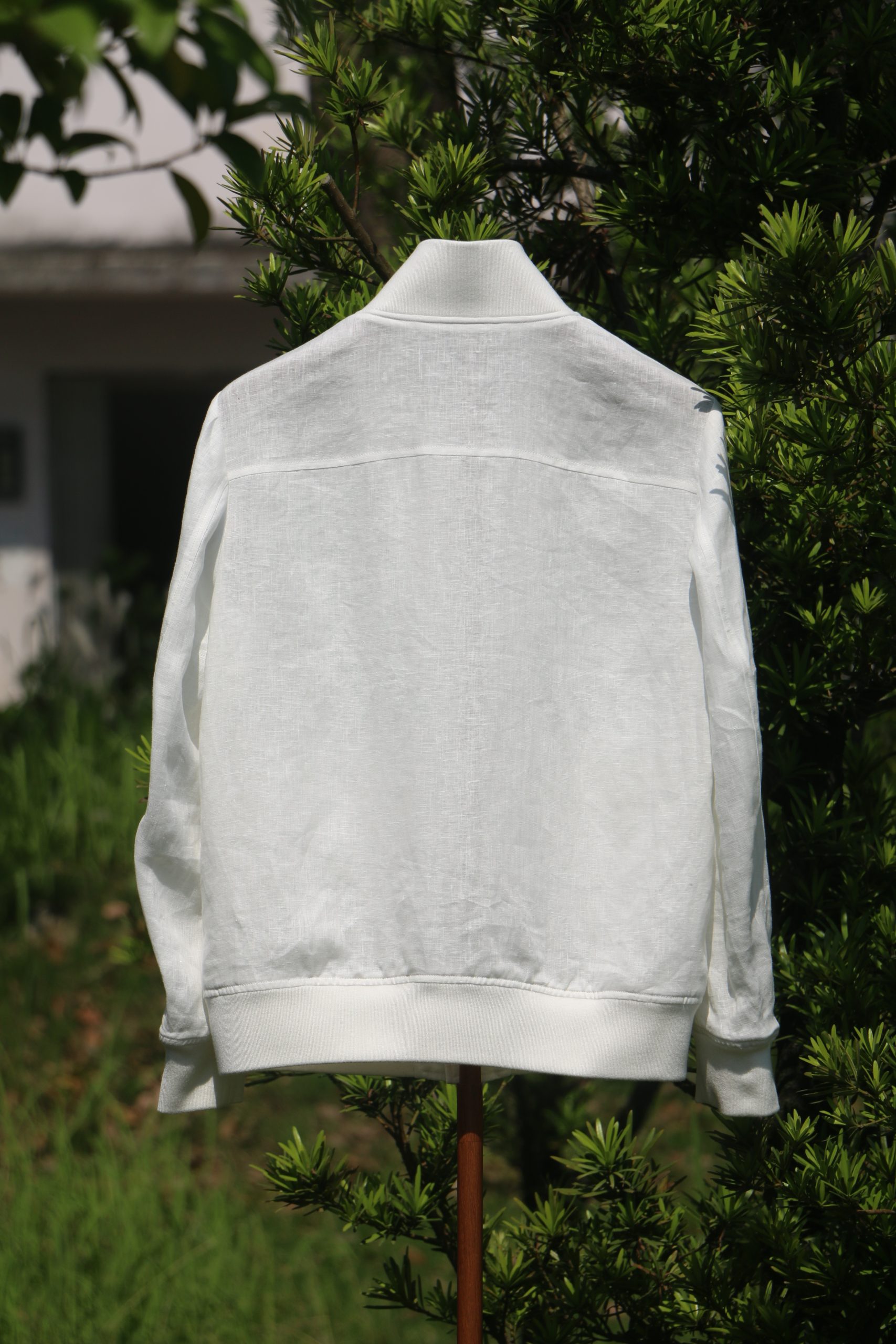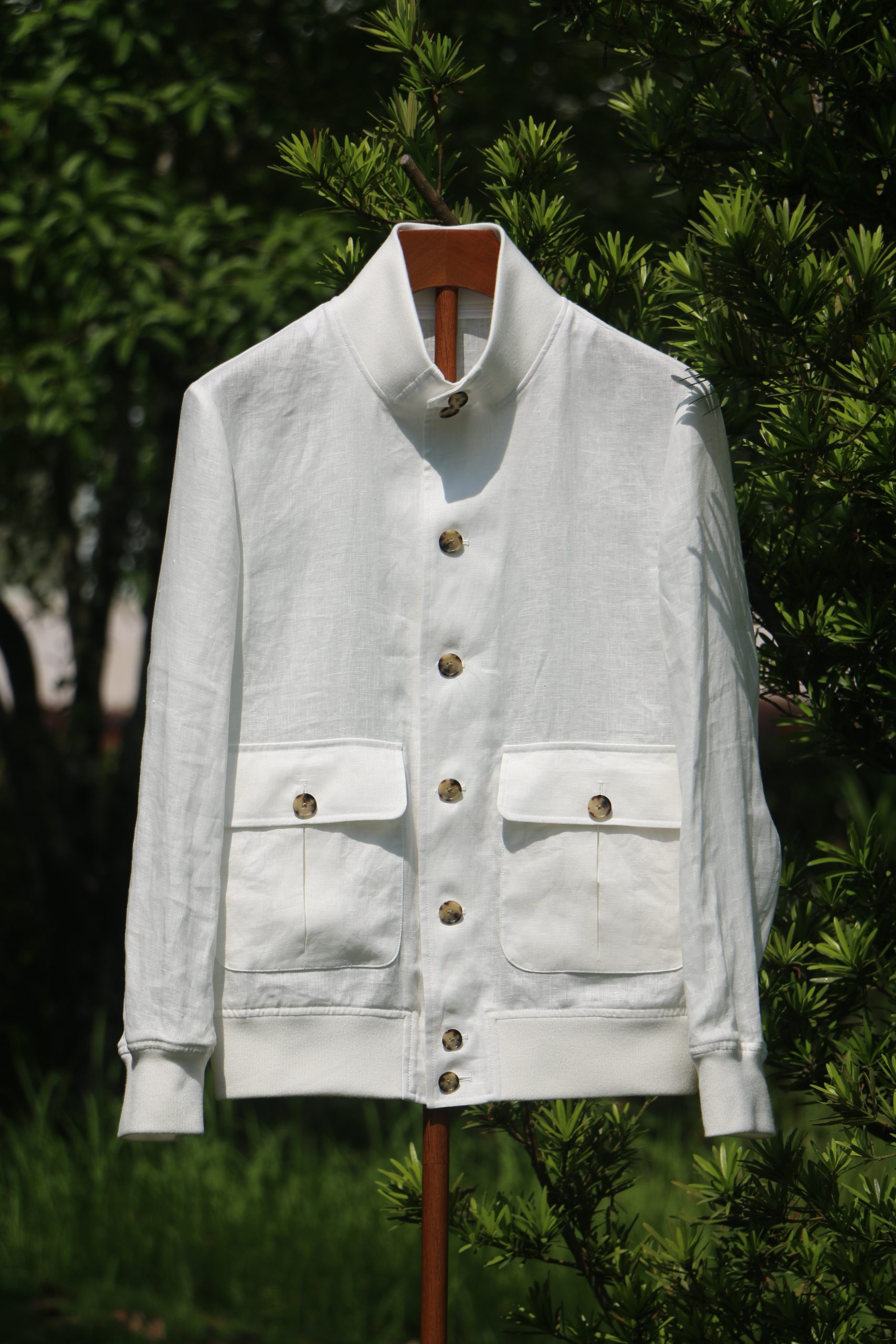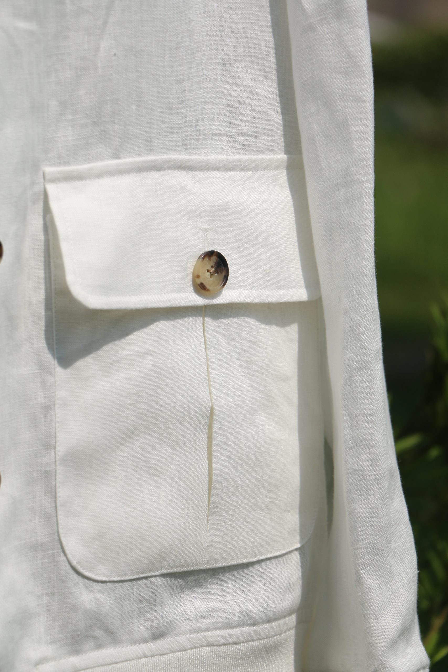 The garment features four symmetrical bellows pockets with central pleats and button-flap closures, providing a functional yet balanced visual profile. The technical fabric is specifically chosen for its ability to resist wrinkles and maintain a sharp, bright finish throughout the day. A key design element is the integrated elasticated waist on the reverse, which creates a sharp, tailored silhouette that contours to the body without the need for a bulky belt. Finished with contrasting horn-effect buttons and a structured point collar, this jacket is a versatile masterpiece. For a quintessential summer look, style it with light blue linen trousers and tan suede loafers, or pair it with navy chinos for a classic nautical-inspired ensemble. This white safari jacket is a definitive statement piece for the modern man who values precision tailoring and a bold, clean aesthetic.
