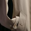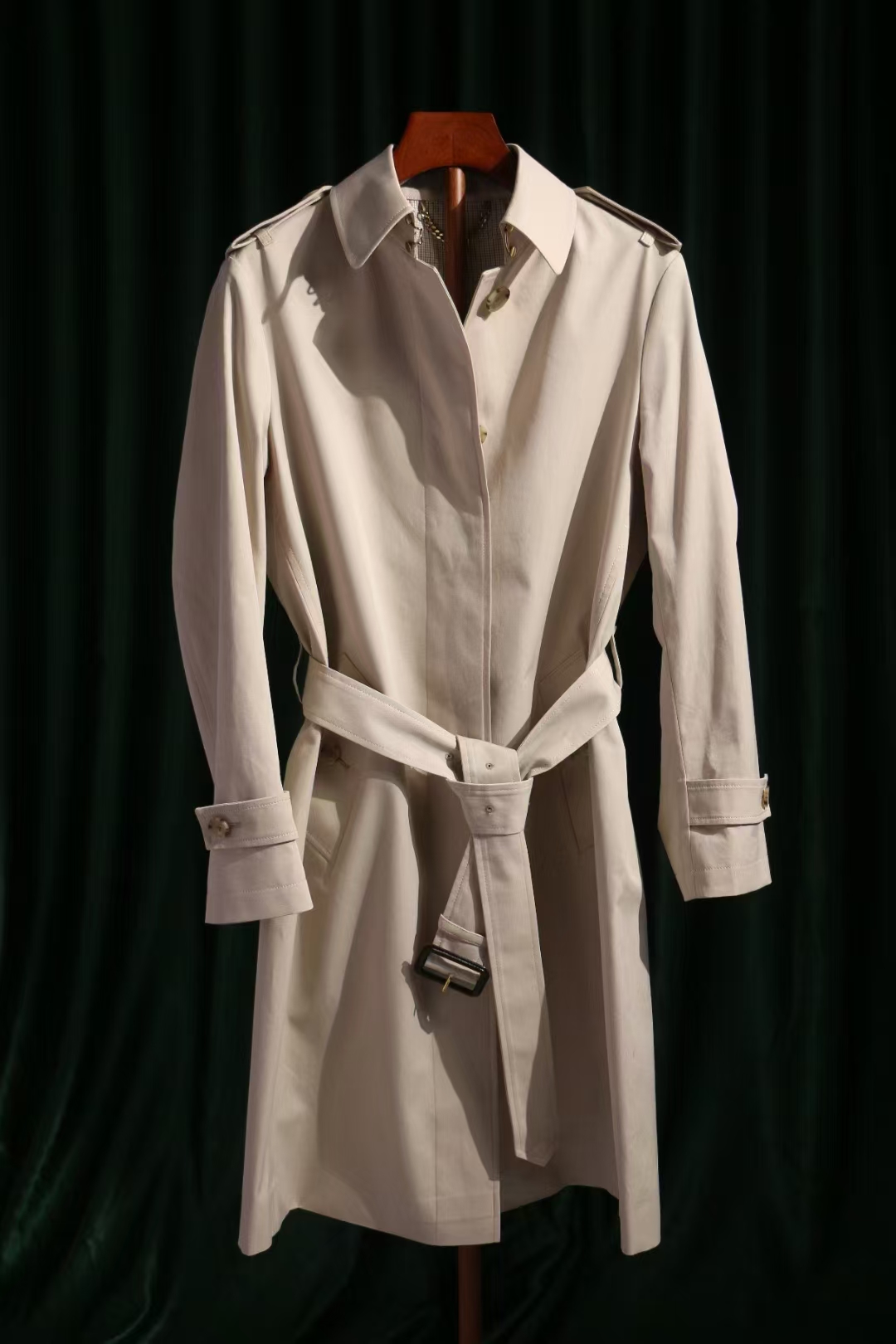 The design is centered on a “quiet luxury” aesthetic, featuring a hidden placket with an unexposed button closure that creates a smooth, uninterrupted front profile. While the front remains minimalist, the back features prominent storm flaps that add traditional depth and character. Functional military-inspired elements include structured shoulder epaulets and adjustable sleeve tabs to secure the fit at the wrists. The waist is cinched with a coordinating belt finished with premium leather buckles, while authentic horn buttons throughout signal a commitment to high-quality craftsmanship. Every detail, from the deep insert pockets to the tailored collar, is executed to provide a sharp and flattering fit.