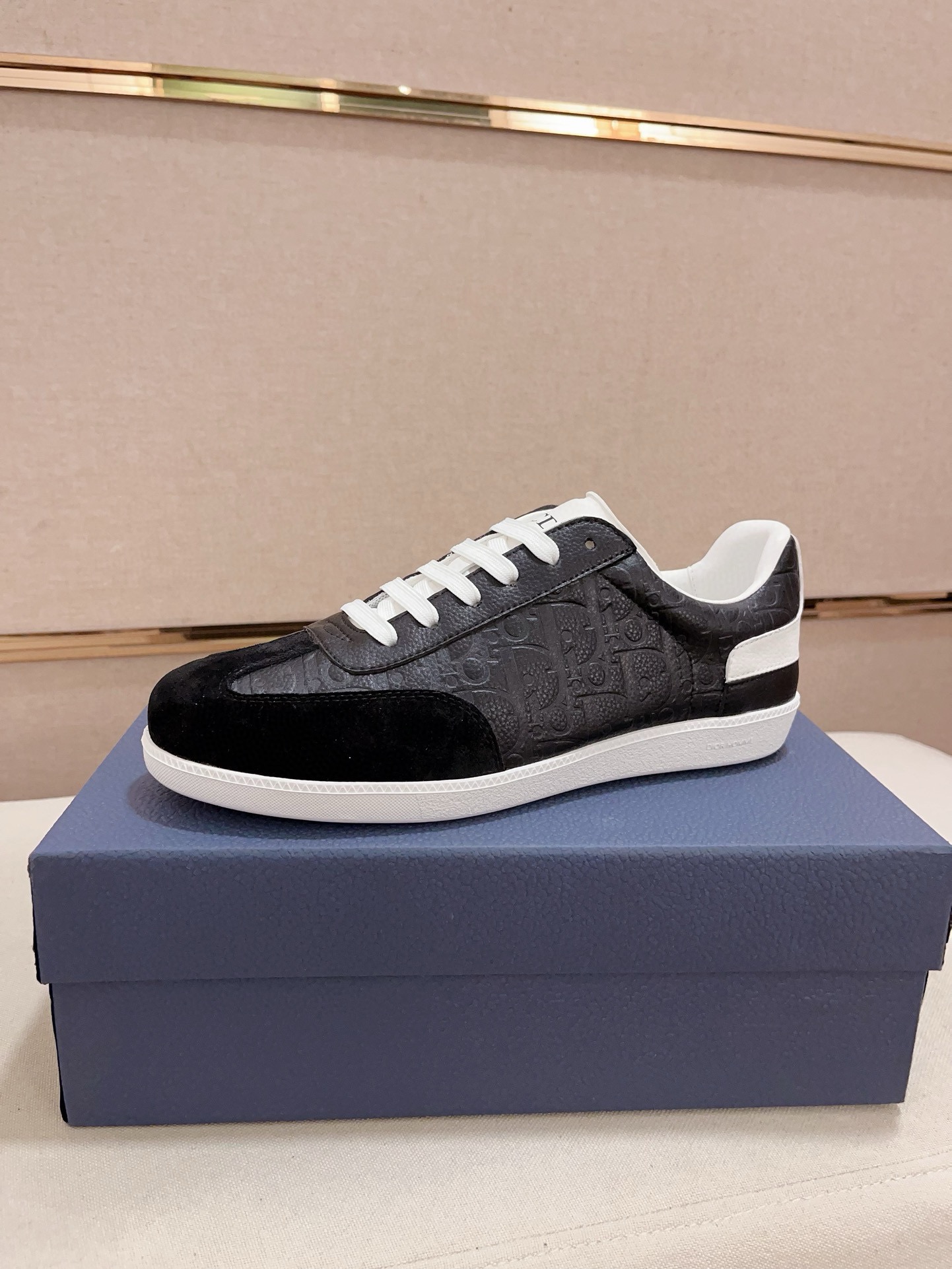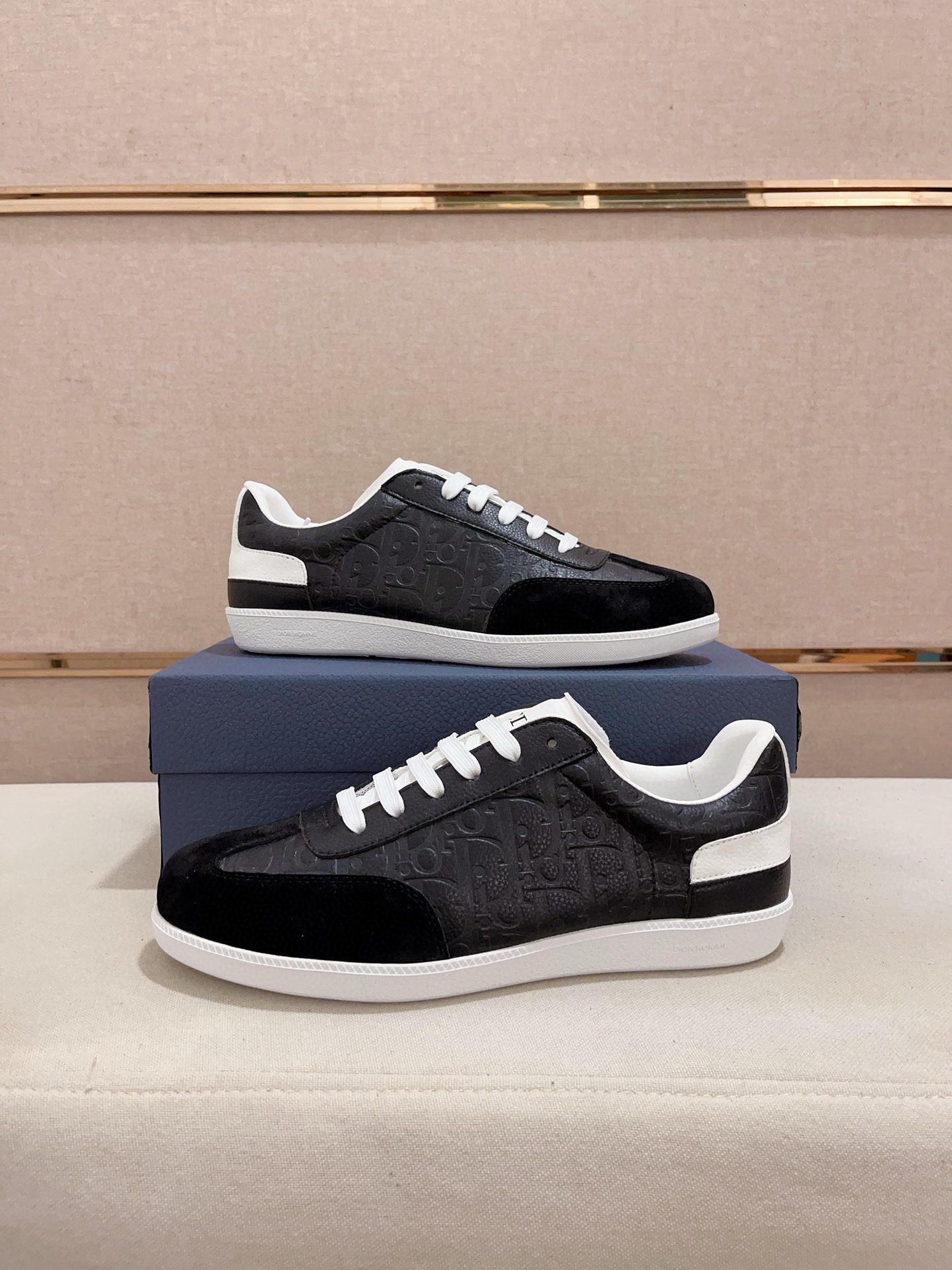 The Dior B01 Sneaker in this striking monochromatic colorway is a masterclass in luxury sportswear, offering a high-fashion interpretation of the classic indoor trainer silhouette. The upper is dominated by premium black leather, which serves as a canvas for the meticulously heat-embossed Dior Oblique motif, creating a deep, textural play of shadow and light. This dark foundation is sharply contrasted by technical white leather accents on the heel counter and eye stays, while a plush black suede T-toe overlay provides a sophisticated tactile variation. The precisely layered construction creates a sculptural cage effect that maintains a streamlined, low-profile aesthetic while providing the structural integrity required for high-end footwear.