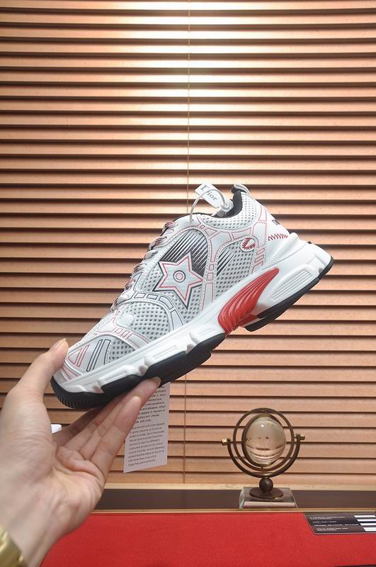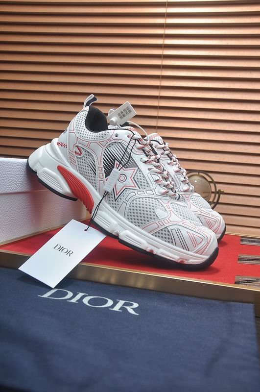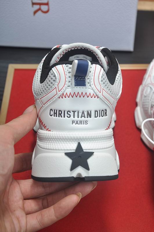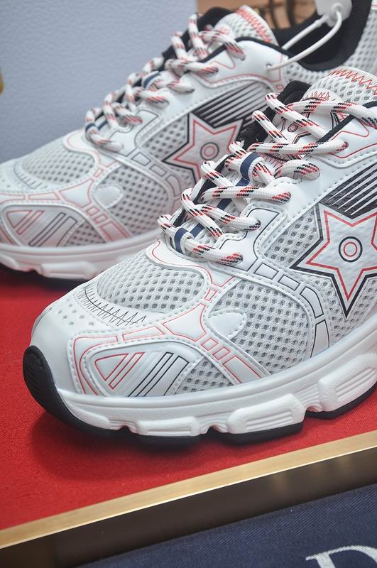 DIOR B30 Sneaker in White Mesh with Red Graphic Accents stands at the intersection of high-performance technical design and luxury streetwear. The upper is meticulously constructed from large-cell white technical mesh, providing exceptional breathability and a lightweight feel for all-day urban exploration. This airy foundation is reinforced by a series of aerodynamic synthetic panels, detailed with vibrant red stitching and black outlines that emphasize the sneaker’s fast-paced, athletic aesthetic. The standout feature is the oversized, star-integrated “CD” signature on the lateral side, which adds a touch of celestial inspiration to the heritage branding.