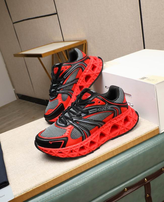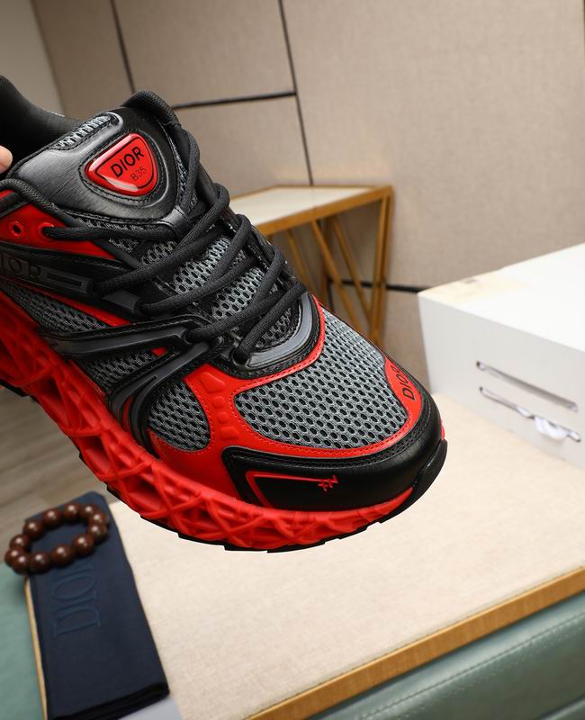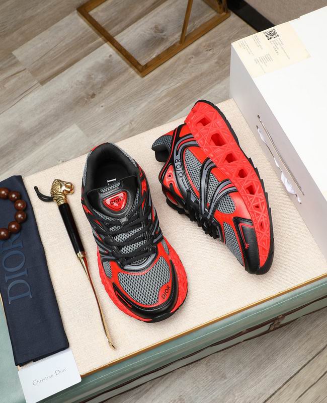Dior B33 Technical Mesh Sneaker is a masterclass in avant-garde footwear design, pushing the boundaries of traditional sneaker construction. The upper is defined by a vibrant red TPU sculptural cage that provides exceptional lateral stability while creating a deep, 3D visual effect. This geometric lattice sits atop a premium grey and black technical mesh base, meticulously chosen for its lightweight breathability and moisture-wicking properties. The aggressive color blocking is further enhanced by matte black leather overlays and tonal stitching, emphasizing the sneaker’s complex, multi-paneled engineering.