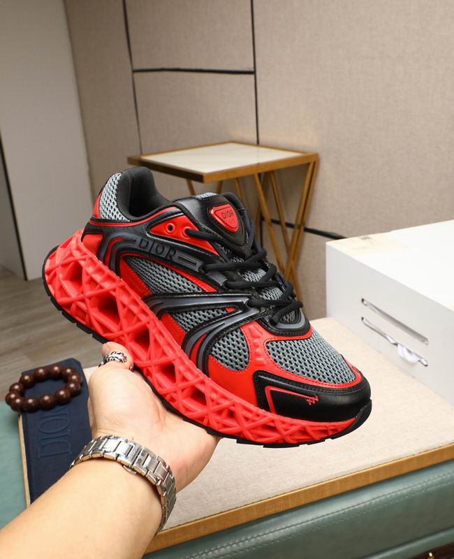 The interior is optimized for superior comfort, featuring a plush black microfiber lining and a padded ankle collar that provides a locked-in, supportive feel. The sneaker is equipped with a high-density tonal red midsole that mirrors the upper’s lattice pattern, providing responsive cushioning for all-day urban exploration. Functional details include a reinforced lace-up system and a durable black rubber outsole with a rugged tread pattern for maximum traction. “DIOR” branding is subtly integrated onto the tongue and the outer toe box, serving as a signature mark of excellence. Whether styled with oversized technical silhouettes or used as a bold focal point for minimalist attire, these sneakers command attention.