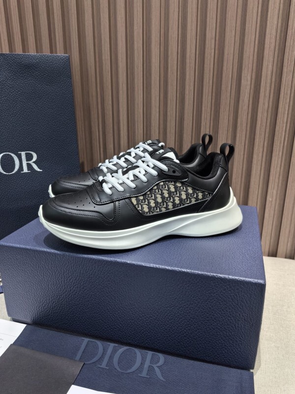 Dior B30 Runner Sneaker in Black Oblique Leather; is a defining piece of modern luxury footwear, expertly engineered to merge high-performance athletic aesthetics with the couture sensibility of the House of Dior. This iteration of the B30 model presents a sharp contrast, utilizing smooth black calfskin leather on the toe and heel, alongside technical mesh for superior breathability and comfort. The centerpiece of the design is the beige and black Dior Oblique technical fabric, applied to the lateral side panels, which instantly grounds the contemporary sneaker in the brand’s esteemed heritage. Reflective accents, particularly around the front eyelets, enhance the shoe’s visibility and underscore its high-tech, functional design ethos.