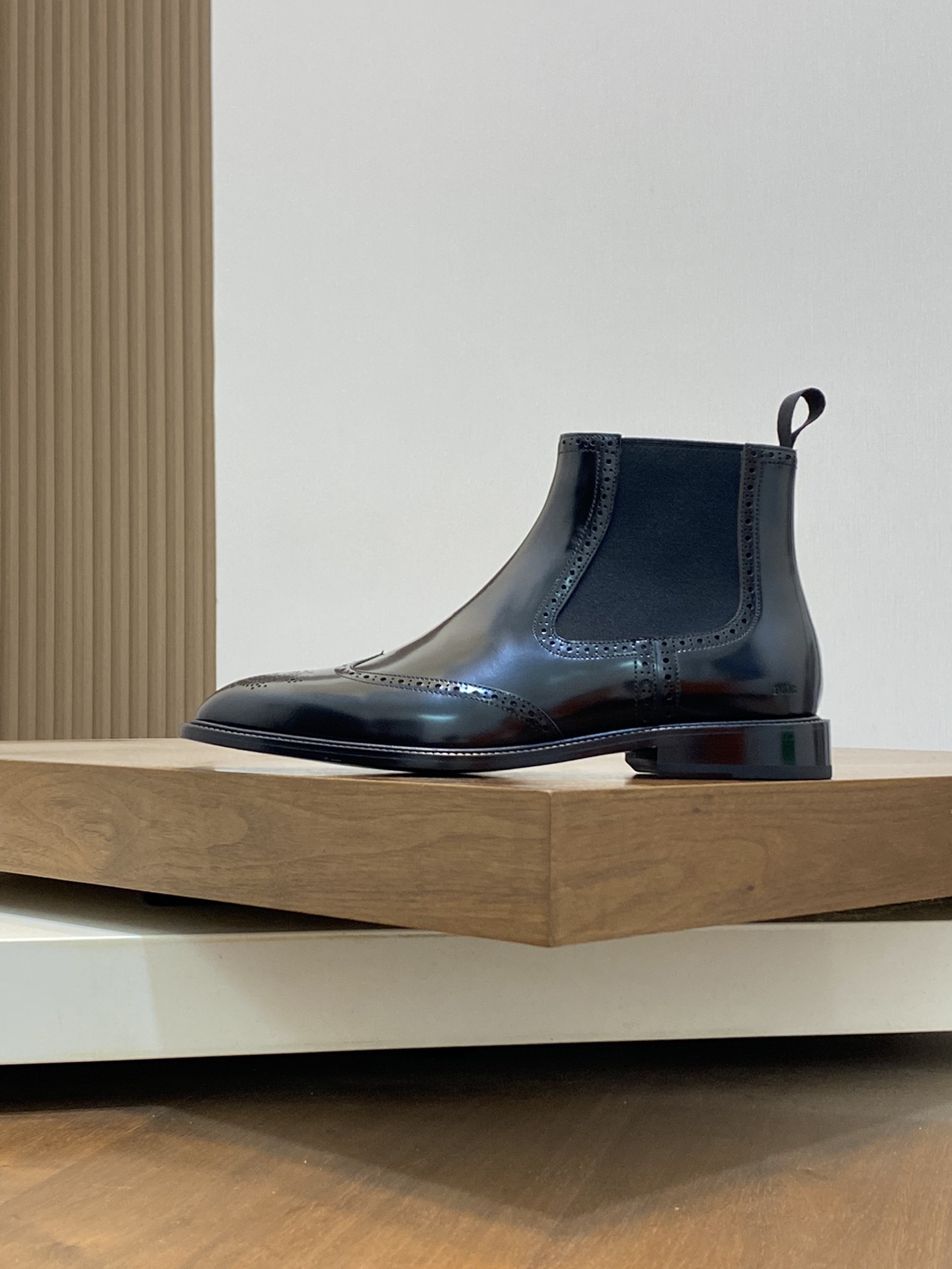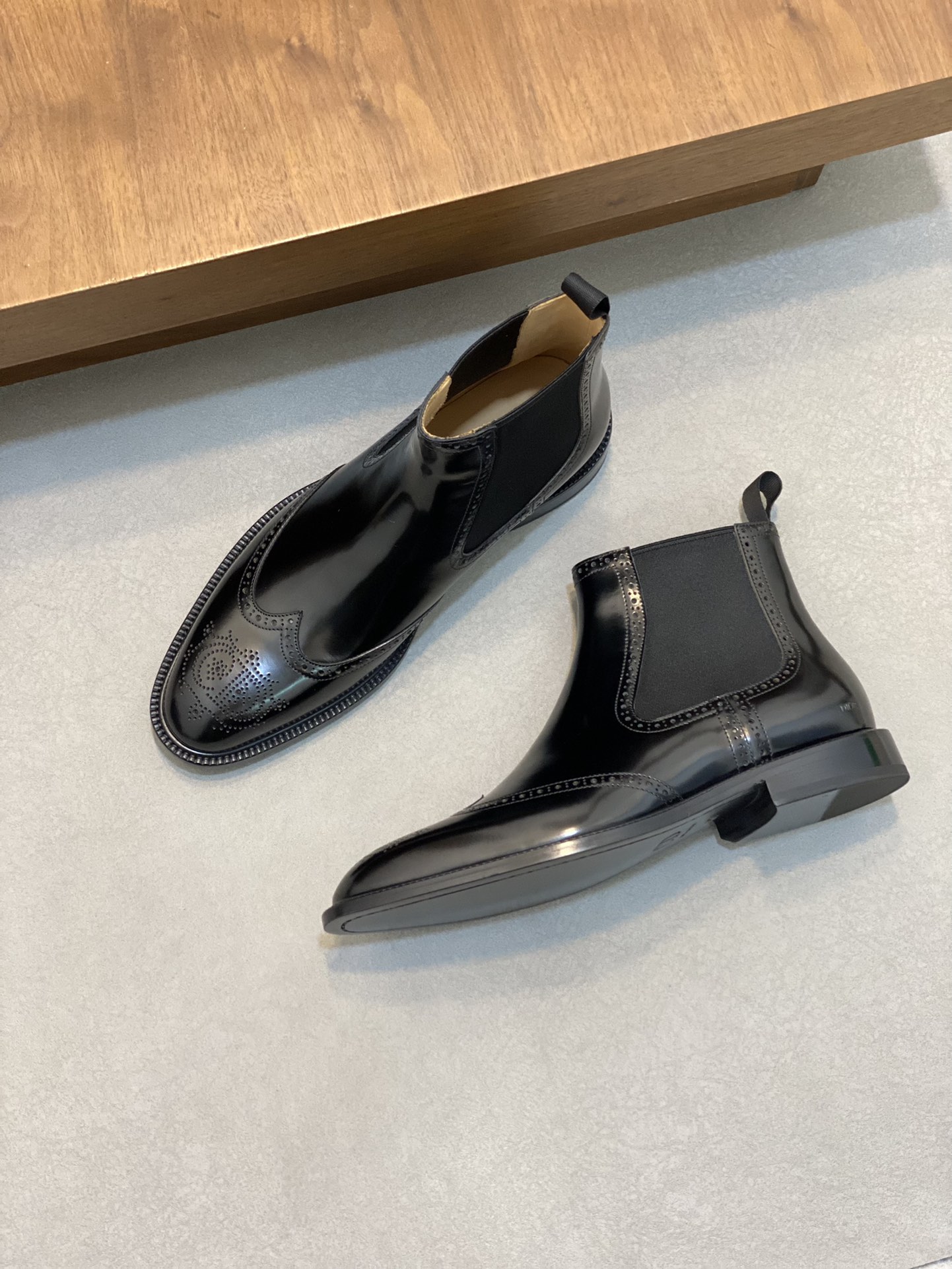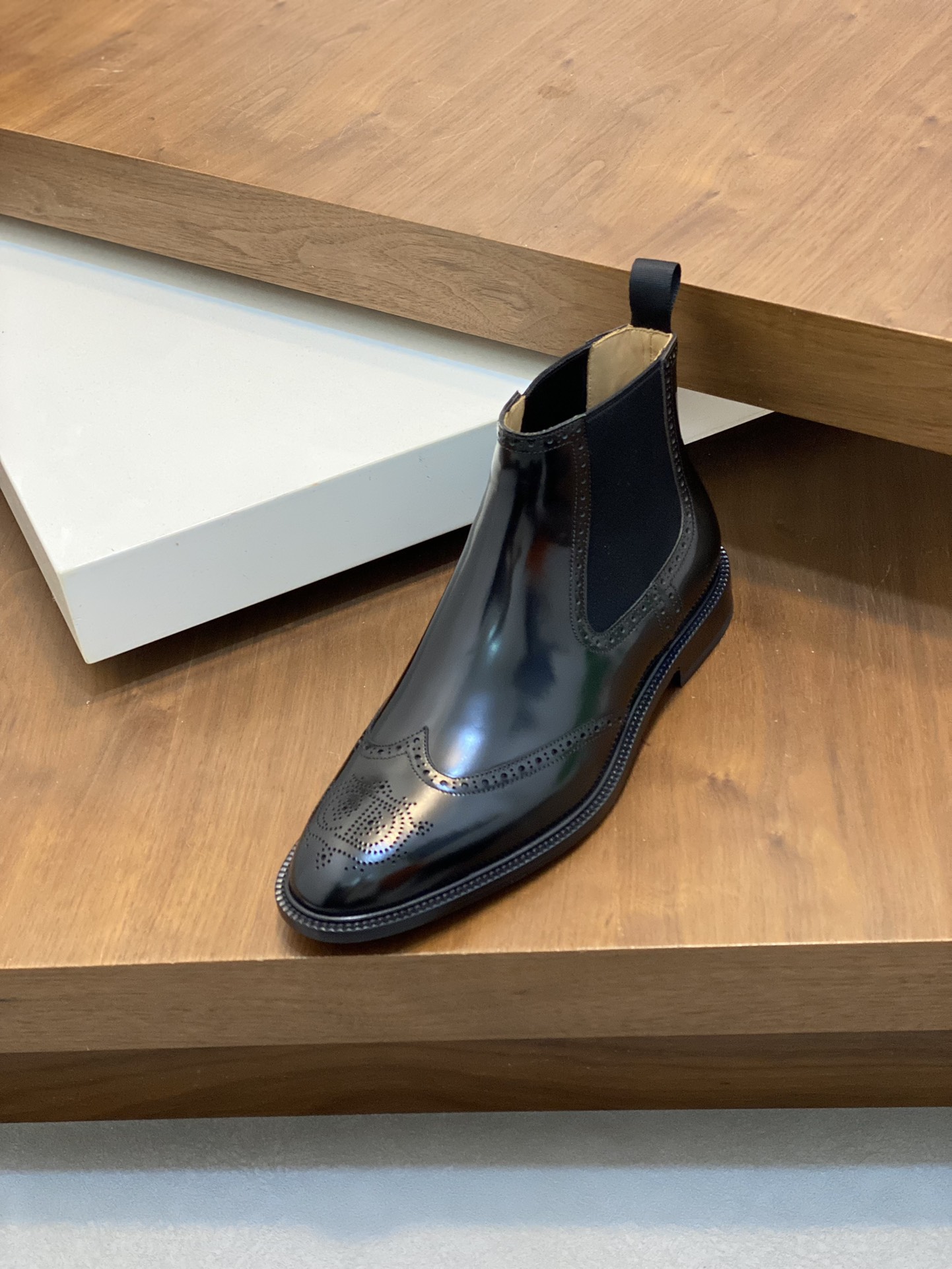Master the art of polished utility with the Dior Patent Leather Chelsea Brogue Boot. This hybrid style seamlessly merges the classic Chelsea boot silhouette—featuring elasticated side gussets and a pull tab for easy wear—with refined brogue detailing. The high-shine black patent leather upper proudly showcases traditional wingtip and medallion perforations on the toe cap, adding a distinguished texture. Set on a durable, stitched rubber sole, this boot offers both rugged stability and unmistakable formal elegance. This versatile piece perfectly pairs with tailored trousers or adds a sharp edge to your business attire.