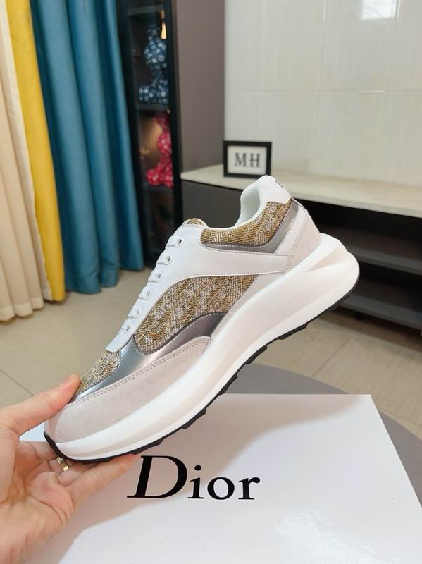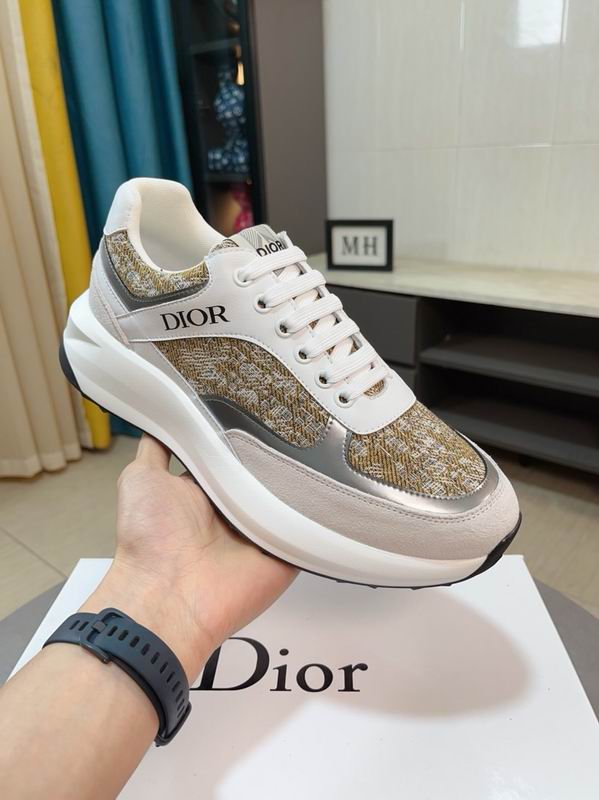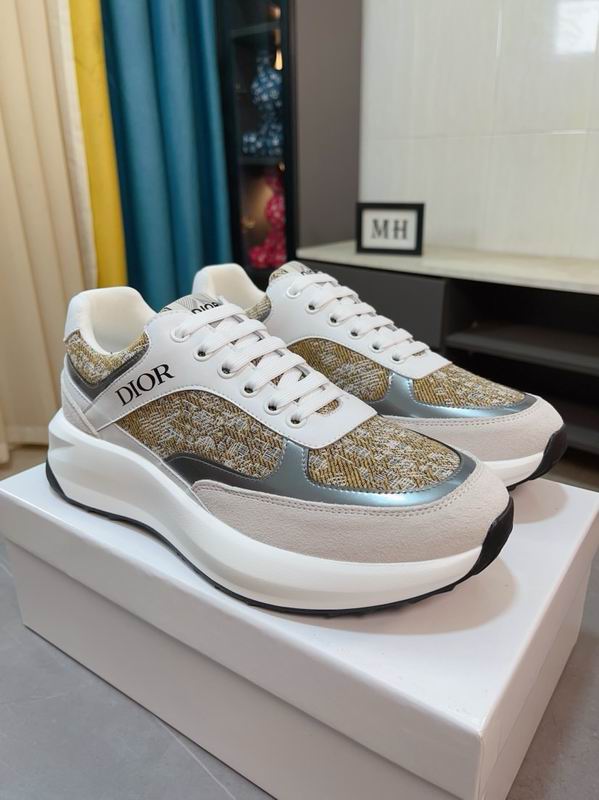 This sophisticated low-top sneaker features a technical gold-tone Dior Oblique tapestry upper accented by smooth white leather and metallic silver piping. The design is grounded by a chunky, sculpted white rubber sole that offers a modern, athletic silhouette. It represents a luxurious fusion of classic house codes and contemporary lifestyle sportswear.