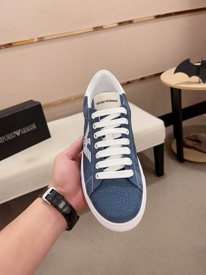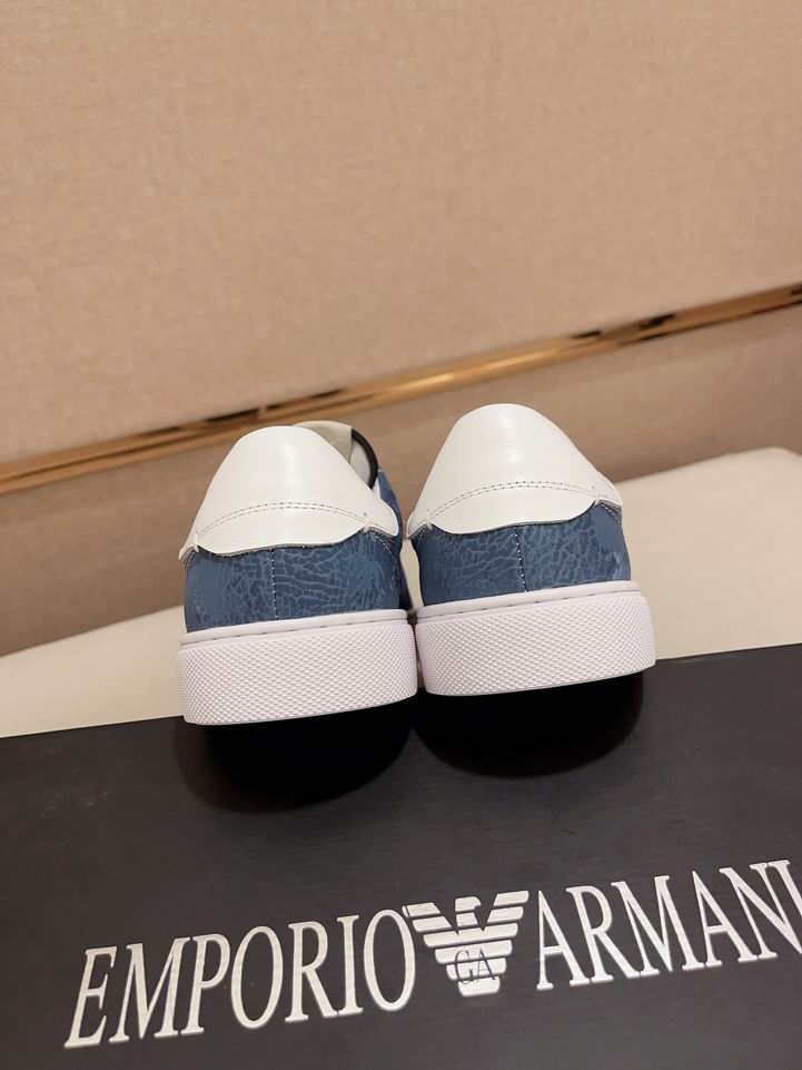 Emporio Armani Eagle Logo Sneakers Blue/White are a refined yet relaxed addition to any contemporary wardrobe, expertly fusing classic sportswear design with high-end Italian branding. The upper is fashioned from a striking blue material, possibly a textured leather or canvas with a unique distressed finish that adds character and depth to the color. This distinctive material is perfectly complemented by the contrasting pristine white lace-up closure, sole, and heel tab, creating a fresh, nautical-inspired color palette. The centerpiece of the design is the iconic white Emporio Armani Eagle logo, which is appliquéd or printed in a substantial size across the lateral side, ensuring immediate brand recognition. The interior lining and insole are finished in white, providing a comfortable and clean fit. The shoes are built on a flat, durable white rubber cupsole, which offers a timeless profile and reliable traction. Subtle branding, such as the ‘EMPORIO ARMANI’ text on the midsole and the logo on the tongue, reinforces the luxurious quality of the footwear. These sneakers are versatile enough to transition smoothly from casual daytime outings to smart-casual evening events. They pair exceptionally well with light-colored trousers, tailored shorts, or high-quality denim, making them a foundational piece for elevated off-duty looks. The unique texture of the blue upper ensures they stand out from standard smooth leather sneakers while maintaining a sophisticated aesthetic.