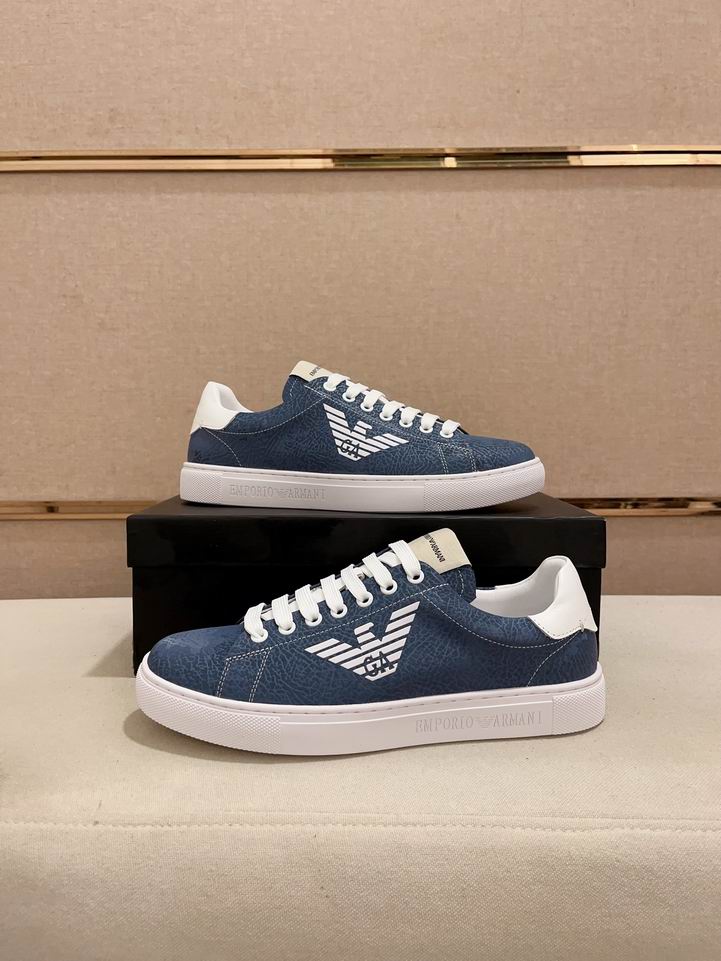 These low-top sneakers feature a stylish blue upper with a subtle distressed or cracked texture, grounded by a clean white rubber sole. The main visual element is the large, white Emporio Armani Eagle logo prominently displayed on the side panel. Combining a classic tennis shoe silhouette with a bold, instantly recognizable motif, these shoes offer effortless casual luxury.