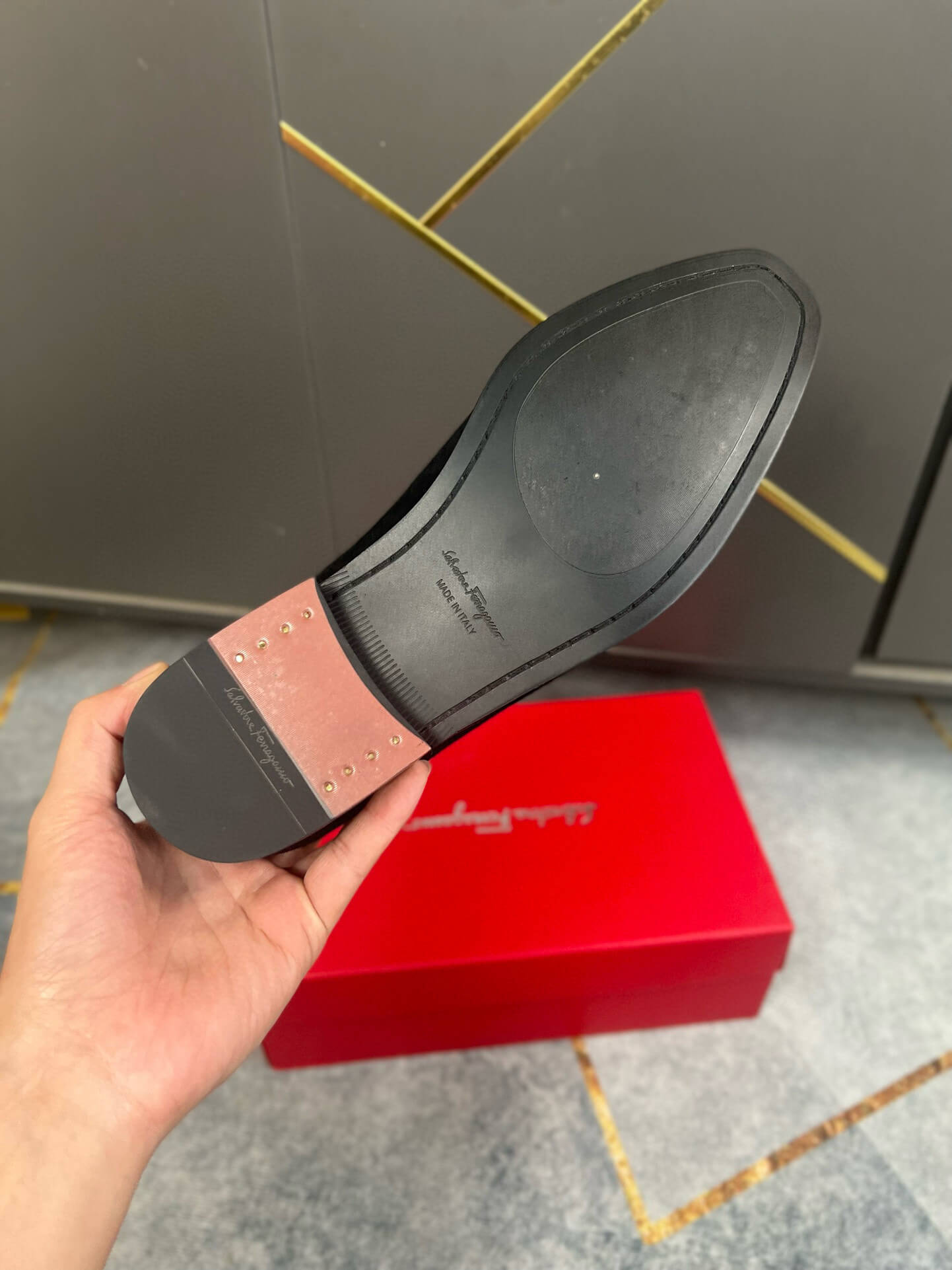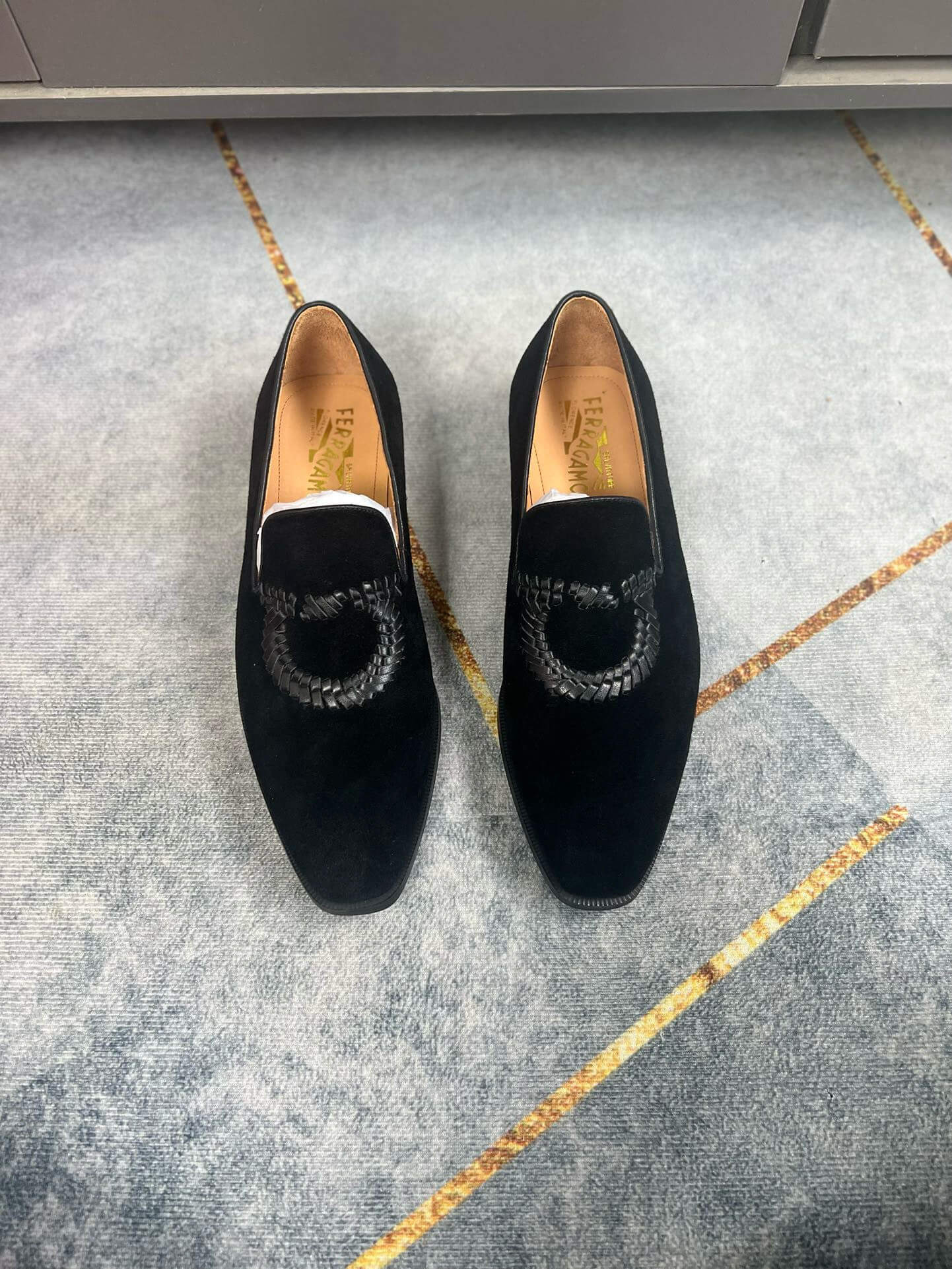 Material Breakdown Constructed from premium Italian calfskin suede, the upper offers a deep, matte black finish that is exceptionally soft to the touch. The interior is lined with smooth, tan glove leather, providing a breathable environment for the foot, while the signature Gancini ornament is reimagined through intricate tonal leather weaving.