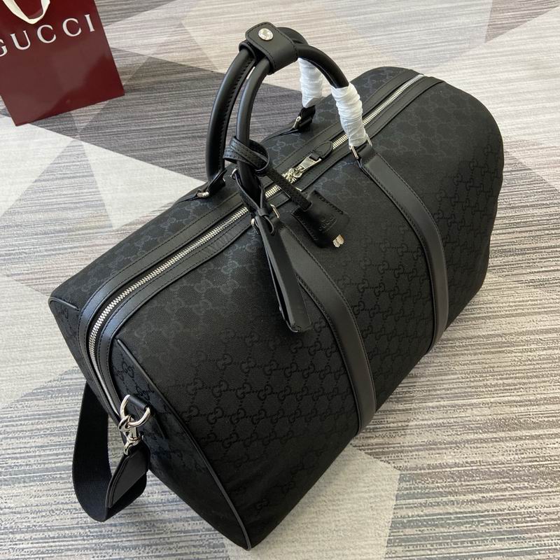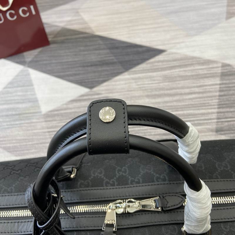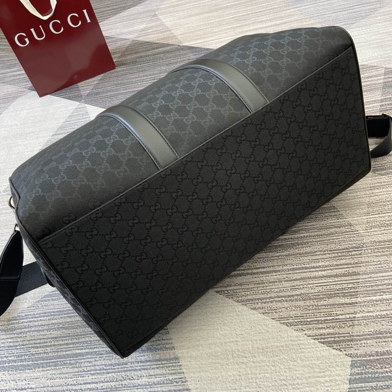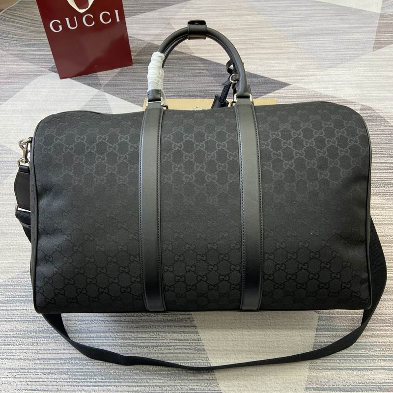 Is the Gucci Black GG Monogram Duffle Bag suitable for carry-on use? Absolutely, its dimensions are designed to fit most international airline overhead bins comfortably.