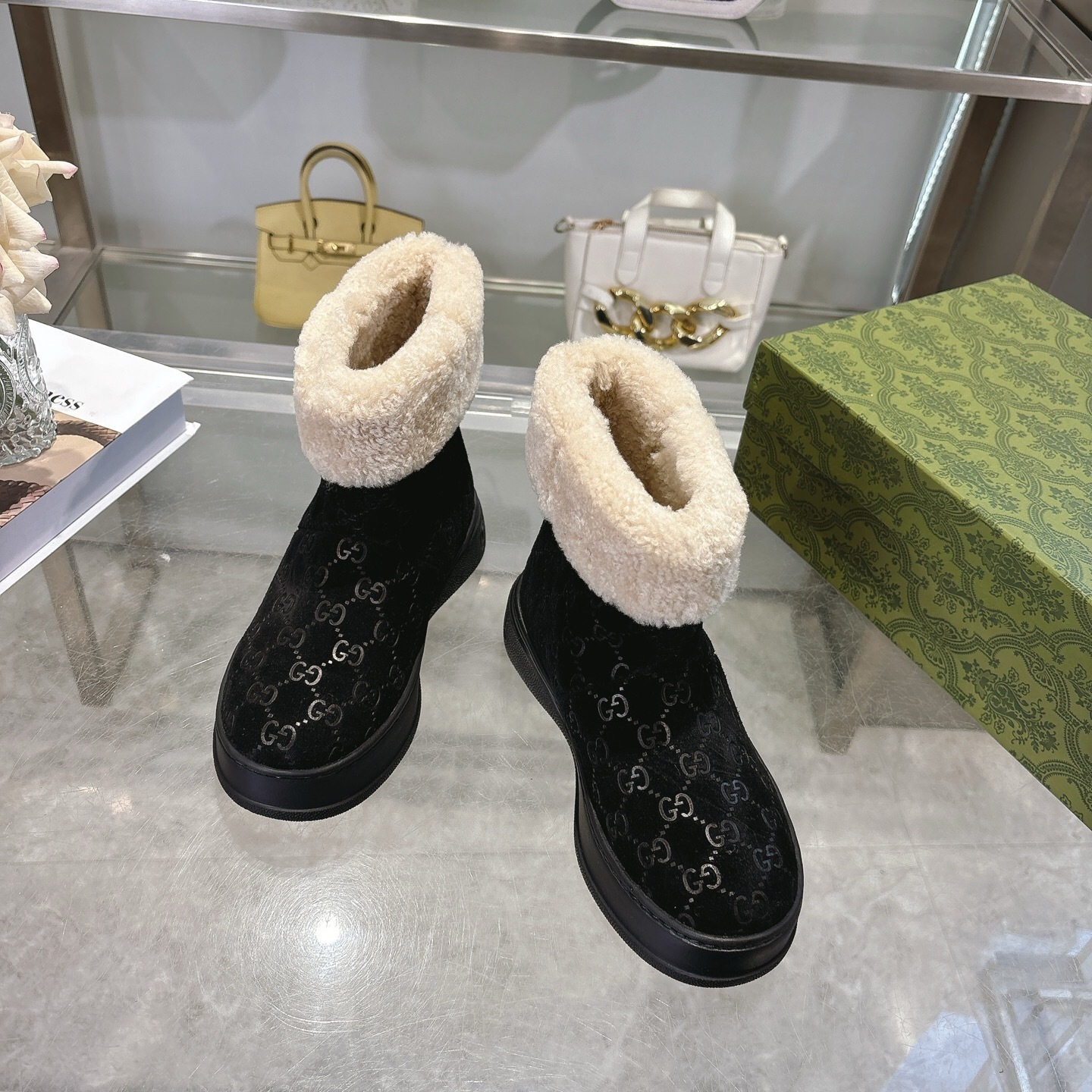 Gucci Black Monogram Fur-Collar Boots are the quintessential winter essential for those who value both high-fashion aesthetics and practical cold-weather protection. These boots feature a premium suede-like upper embossed with a high-definition GG monogram pattern that catches the light with every step. Furthermore, the ankle is enveloped in a voluminous, cream-colored faux-fur collar that creates a stunning visual contrast against the deep black body. This plush trim serves as a functional windbreaker, effectively sealing in heat to keep your ankles and lower legs warm.