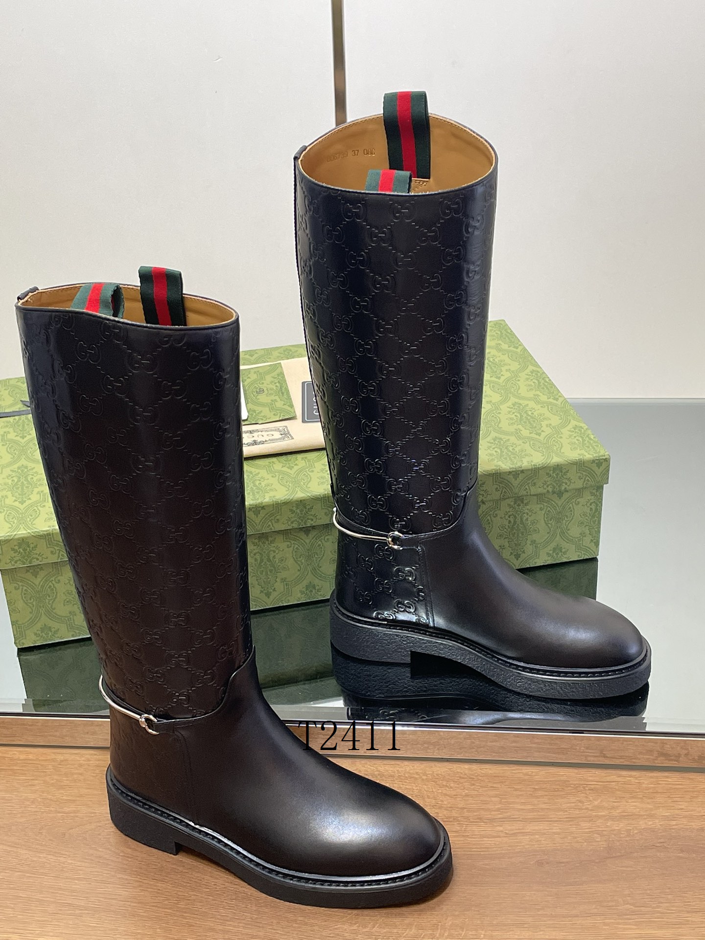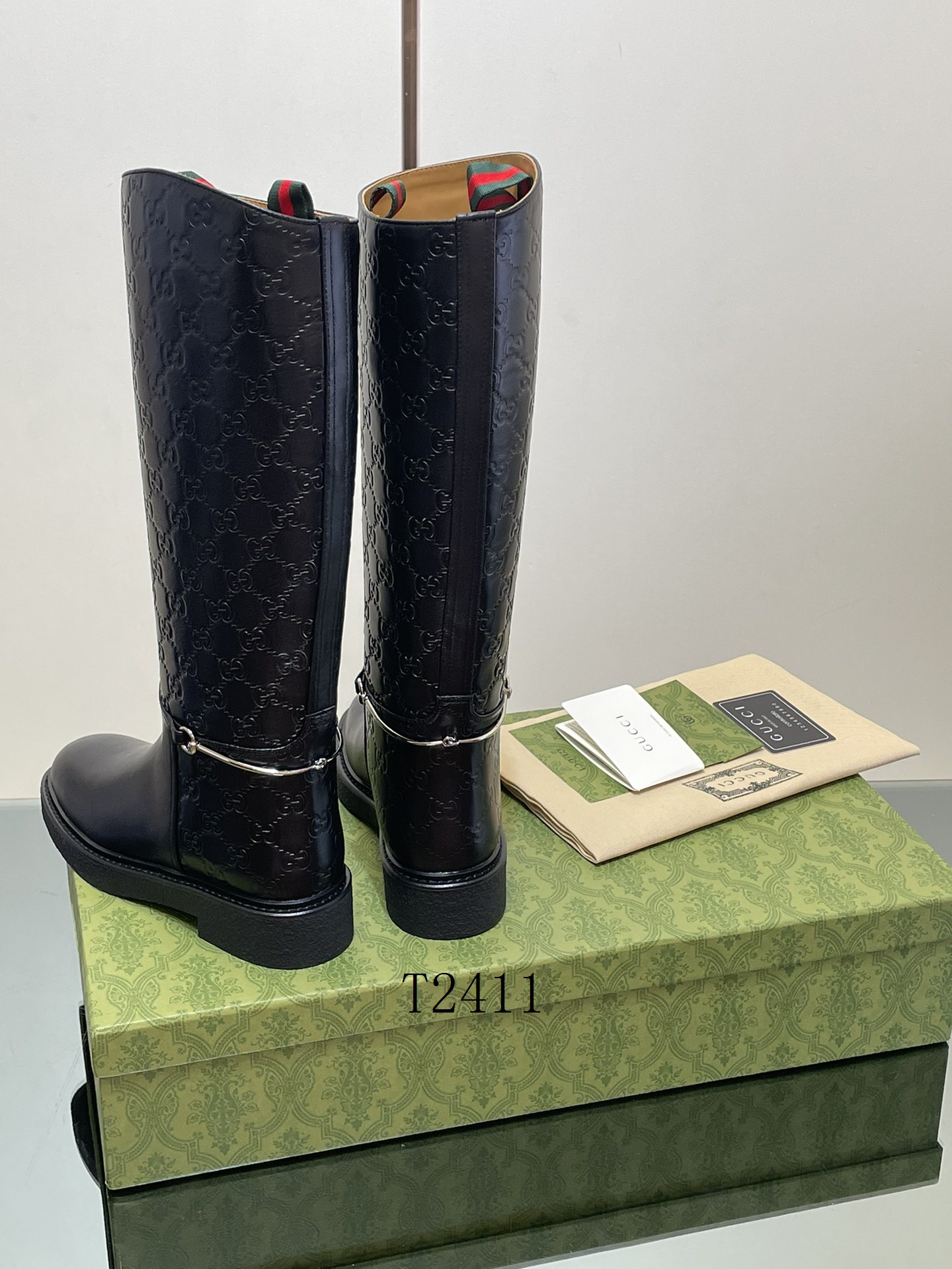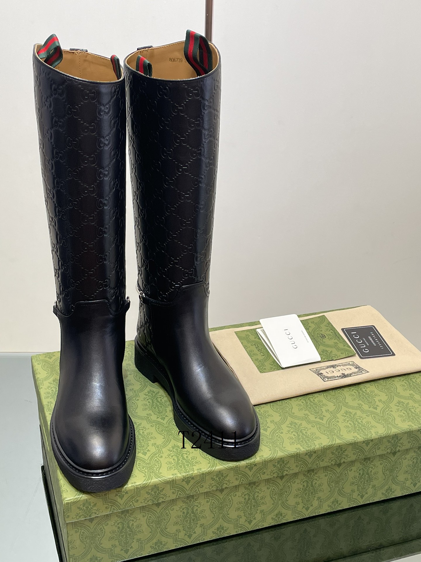 Gucci Black Monogram Leather Boots are a definitive statement in luxury-inspired footwear, combining iconic branding with a sleek, utilitarian silhouette. These knee-high boots are meticulously crafted from premium black leather, featuring a striking dual-texture composition. The lower foot and ankle area are finished in a smooth, polished leather, while the tall shaft is intricately embossed with the signature interlocking GG monogram pattern, providing a sophisticated depth and textural contrast. A slim, silver-tone Horsebit chain wraps elegantly around the back of the ankle, anchoring the design in heritage aesthetics. The boots are further accented by the recognizable green and red webbed pull-tabs at the collar, ensuring ease of wear while maintaining a high-fashion profile.