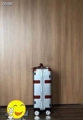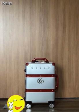 Gucci Silver and Red Rolling Suitcase is a masterpiece of travel engineering, designed for those who appreciate a striking, high-contrast aesthetic. This 20-inch carry-on features a sleek silver hardshell body that is beautifully accented by deep red leather-style trim and reinforced corners. Furthermore, the industrial-chic design is punctuated with gold-tone rivets and the signature interlocking logo, creating a look that is both vintage and futuristic. Consequently, you will find it incredibly easy to identify your luggage on any carousel or in a busy hotel lobby. Additionally, the dual-arm telescopic handle and multi-directional spinner wheels ensure that navigating through tight terminal spaces is entirely effortless. Moreover, the integrated combination lock at the top of the frame provides superior security for your personal effects during transit. Finally, the robust construction ensures that this suitcase remains a reliable companion for many years of frequent travel.