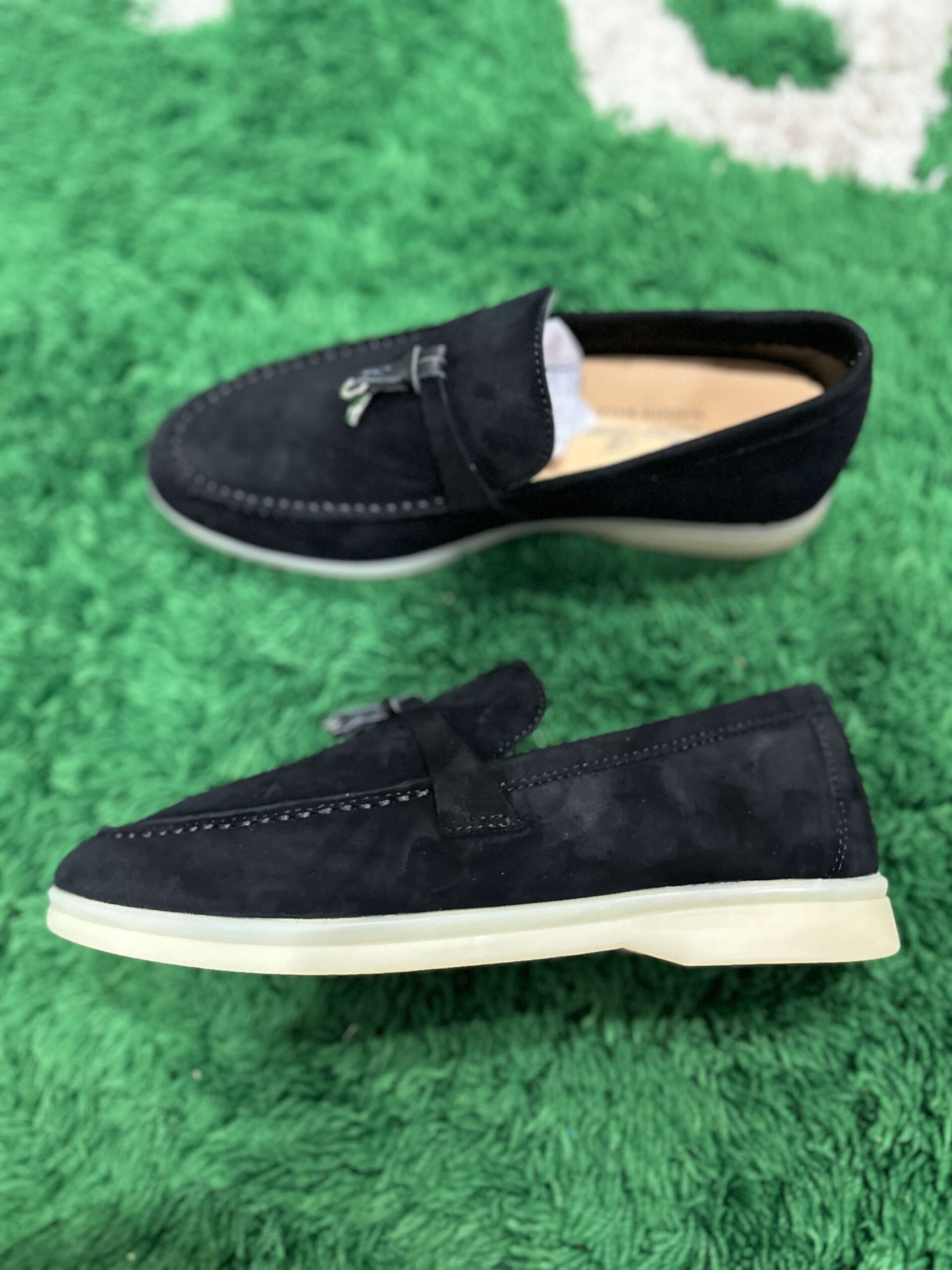 The architectural integrity of the Loro Piana Summer Walk Black Suede is highlighted by its clean, laceless silhouette and traditional moccasin-style hand-stitching along the apron. A standout feature is the signature ivory-coloured latex sole, which provides a striking visual contrast while offering non-slip durability and a lightweight feel for all-day wear. The interior is lined with smooth, breathable calfskin leather, making these loafers exceptionally comfortable for barefoot use during warmer months. This inspired version captures the heritage of high-end craftsmanship, utilizing top-tier materials to replicate the effortless style of the original Mediterranean-inspired design.