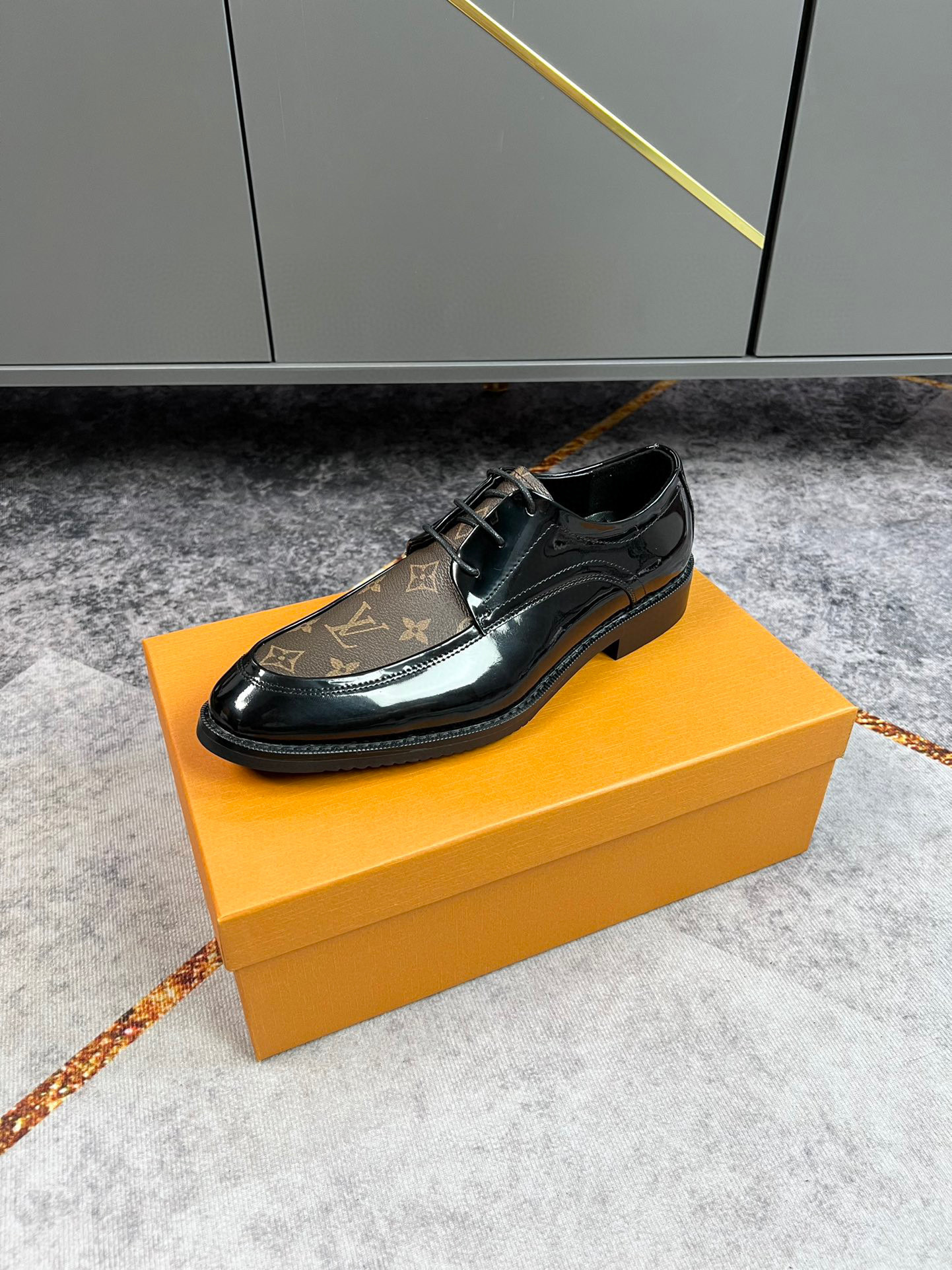 Consequently, this specific lacing arrangement makes the shoe an ideal choice for gentlemen who prioritize ergonomic ease without sacrificing elite style. The thin, round waxed laces are meticulously threaded through the open tabs to maintain a clean, minimalist profile. Additionally, the shoes are built with a durable, tonal rubber outsole that offers superior grip while maintaining a formal, streamlined silhouette. The interior is lined with smooth, breathable leather to provide long-lasting comfort during extended wear. Moreover, the subtle “LV” branding on the tongue adds a final touch of designer prestige to the overall aesthetic. Finally, these Derbies represent a contemporary take on a classic silhouette, offering a unique look that elevates any black-tie ensemble.