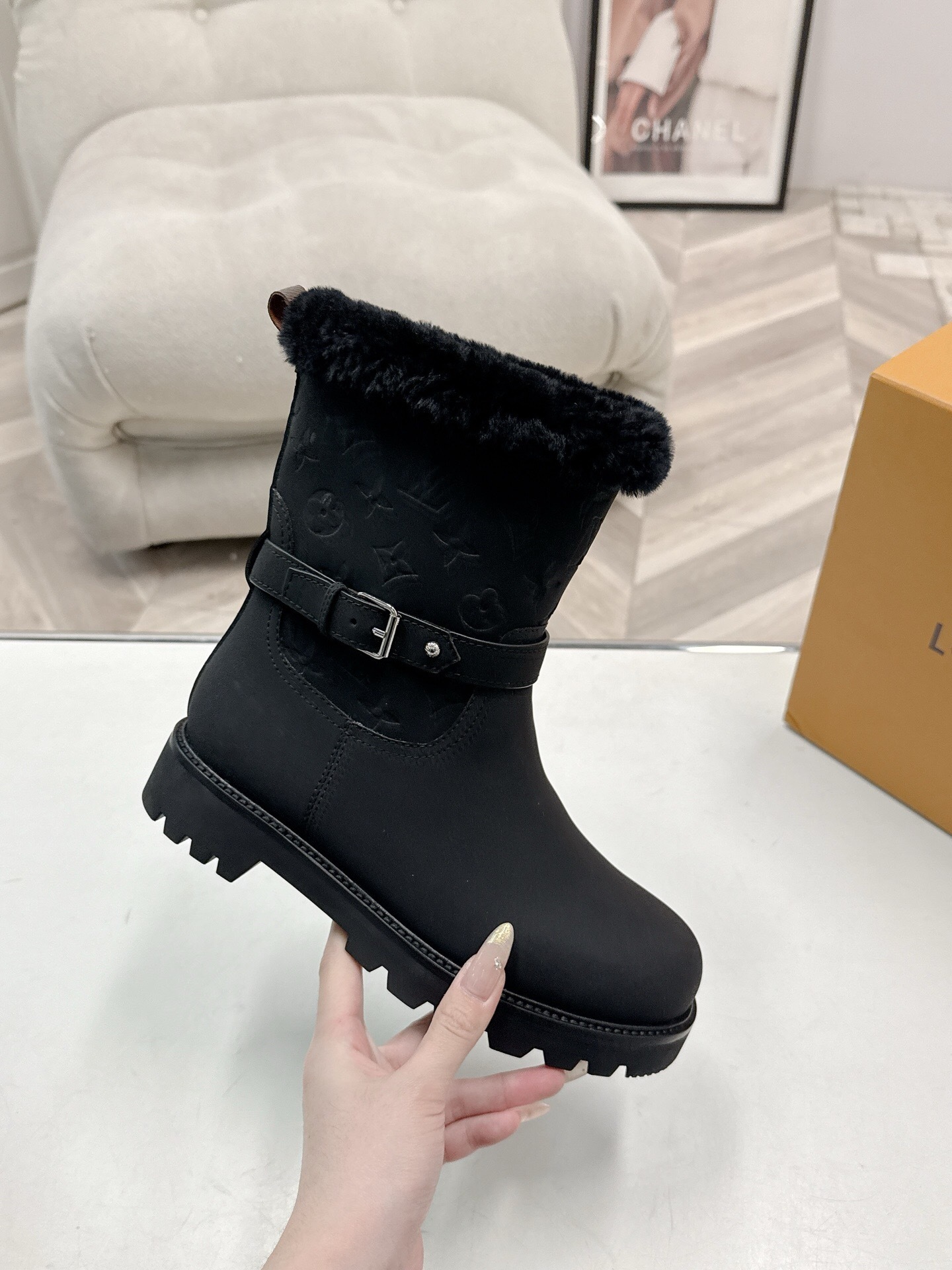 The luxurious black faux-fur collar of the Louis Vuitton Black Monogram Embossed Boots offers a seamless, high-fashion aesthetic while providing exceptional warmth against biting winds. Furthermore, the boots are equipped with a rugged, deep-treaded lug sole that provides superior stability and grip on icy or uneven urban surfaces. Specifically, the interior is lined with soft, insulating fabric, making the Louis Vuitton Black Monogram Embossed Boots an ideal choice for long hours of wear during winter commutes or holiday shopping trips. Ultimately, choosing the Louis Vuitton Black Monogram Embossed Boots means investing in a durable, high-prestige silhouette that defies seasonal trends. Moreover, the tonal black-on-black color scheme of the Louis Vuitton Black Monogram Embossed Boots ensures they remain a versatile staple in your wardrobe for years to come.