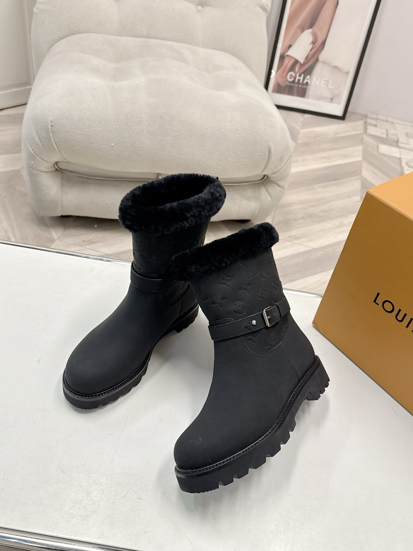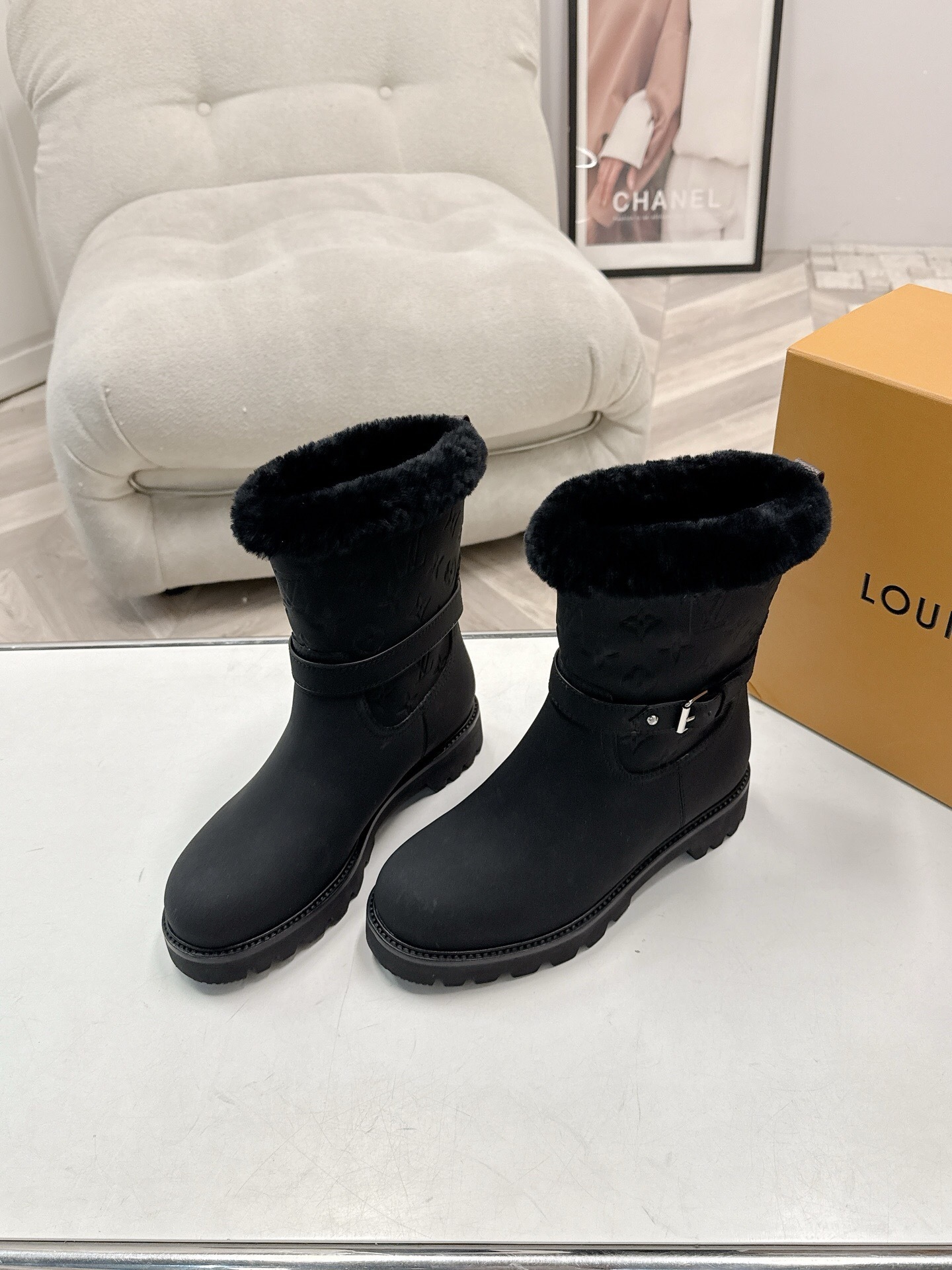 Louis Vuitton Black Monogram Embossed Boots redefine urban winter luxury with a striking all-black aesthetic. The premium upper features a detailed embossed monogram pattern, providing a sophisticated texture that complements any outfit. A plush black fur collar ensures maximum thermal comfort, while the adjustable buckled ankle strap allows for a precise, secure fit. Built on a durable lugged platform sole, these boots offer exceptional traction for navigating slippery city streets. Every detail reflects a commitment to high-fashion style and practical durability. Elevate your seasonal footwear collection with the timeless appeal and cozy interior of the Louis Vuitton Black Monogram Embossed Boots.
