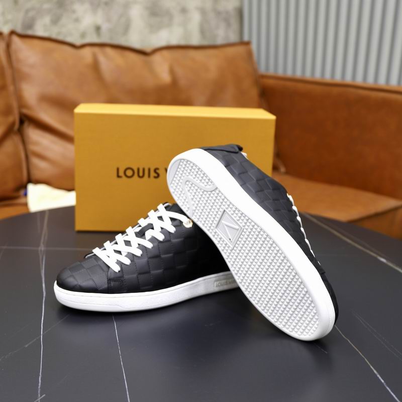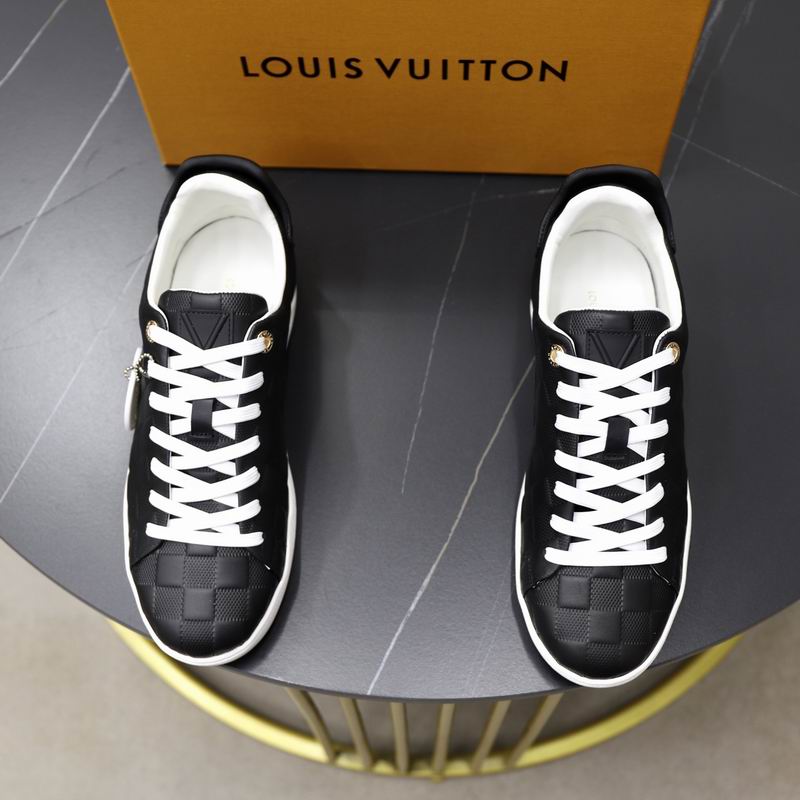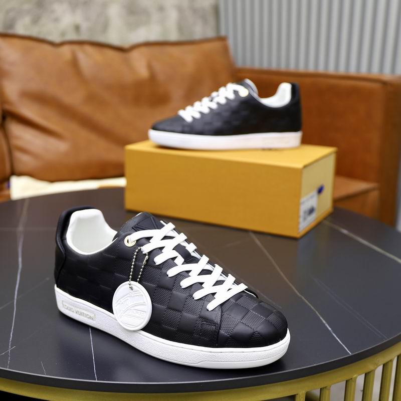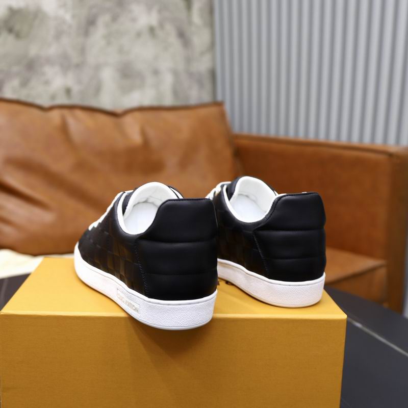 Louis Vuitton Checkered Low-Top Sneaker Black/White is a superb blend of sporty comfort and high-fashion aesthetics, making it a perfect staple for any contemporary wardrobe. The entire upper of this sophisticated sneaker is finished in a deep black, subtly embossed with an all-over checkered pattern, adding a luxurious textural element that catches the light. This meticulous detailing provides an air of understated elegance without relying on loud branding. The clean, minimalist silhouette is instantly elevated by the striking contrast of pure white components. This includes the thick, flat white laces, which stand out boldly against the black tongue, the soft white lining of the heel collar, and the substantial white rubber outsole that guarantees comfort and traction. A small, refined detail is the subtle brand-inspired text logo placed discreetly on the side of the white midsole. This sneaker is built for both enduring style and daily wearability, effortlessly transitioning from weekend errands to casual evening gatherings. The construction emphasizes a clean, smooth finish, highlighting the quality of the materials used. The sneaker offers a high-end look and feel at an accessible price point, embodying classic design principles.